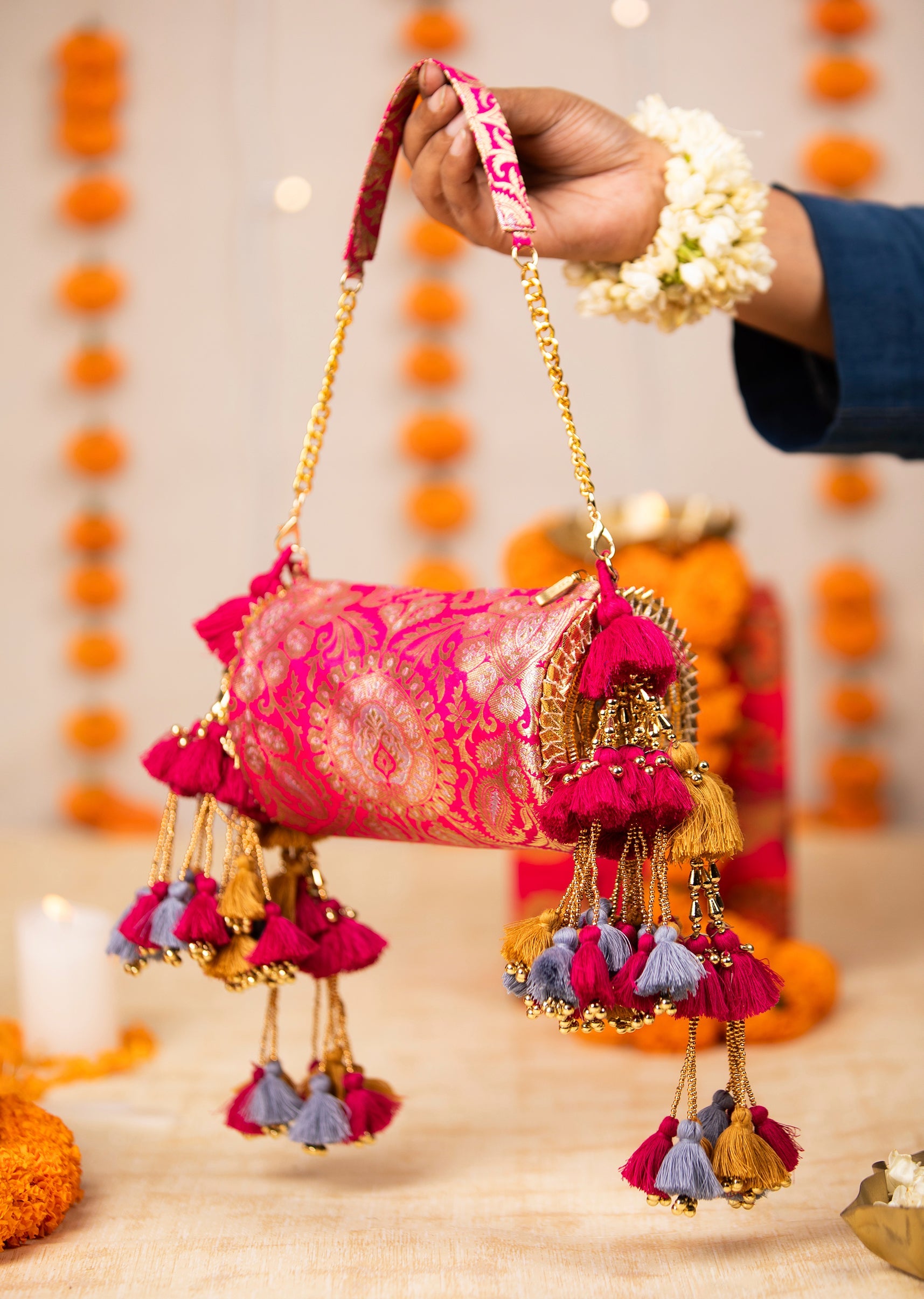 Bring instant festive elegance to your look with this pink brocade bag, adorned with delicate golden motifs that radiate traditional luxury. Zari accents, rich embellishments, and lively tassels add depth and movement, making it a standout piece for weddings and grand celebrations. Lightweight yet striking, it effortlessly completes any ethnic outfit with a touch of regal charm. Awarded as the Most Trusted Brand, we're delivering styles you love, just as promised.
