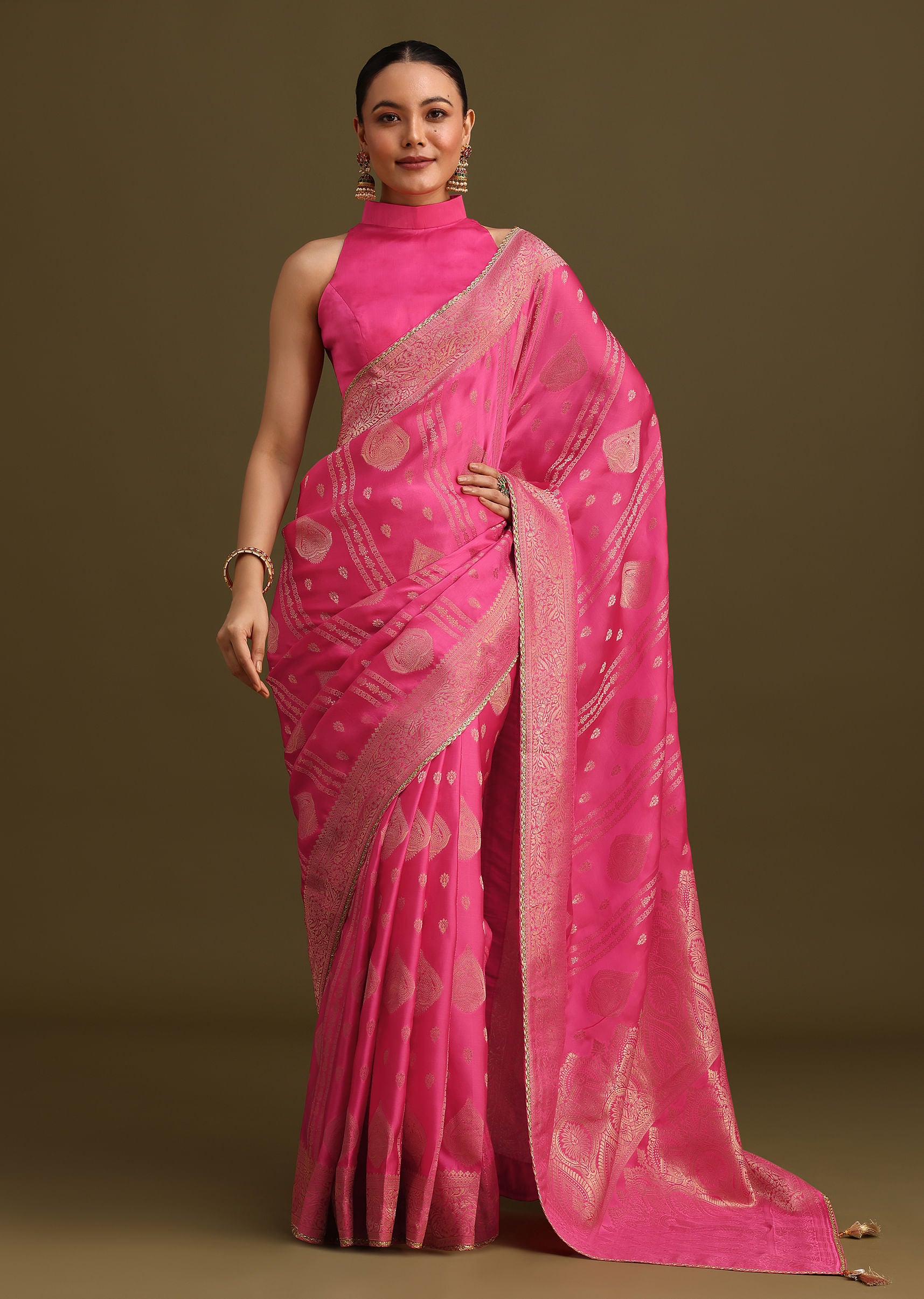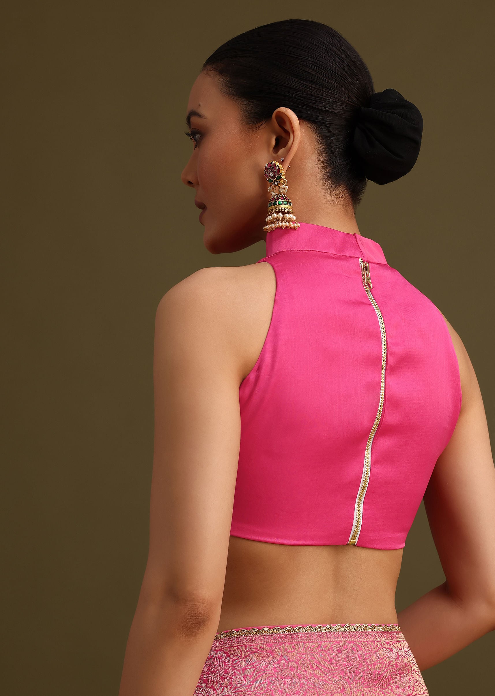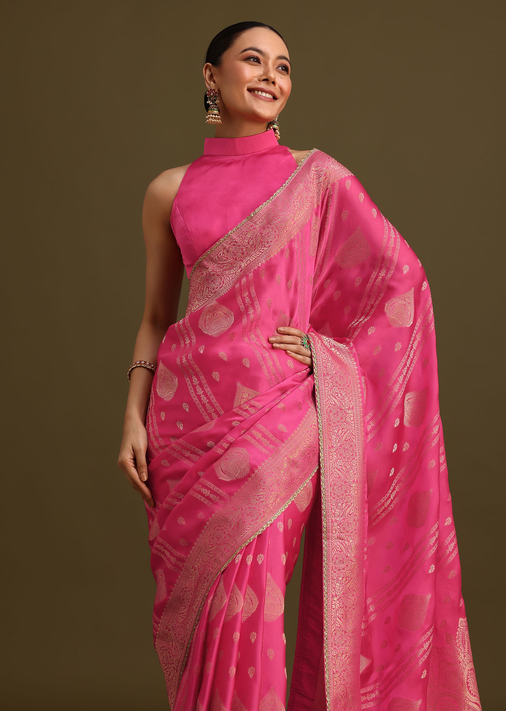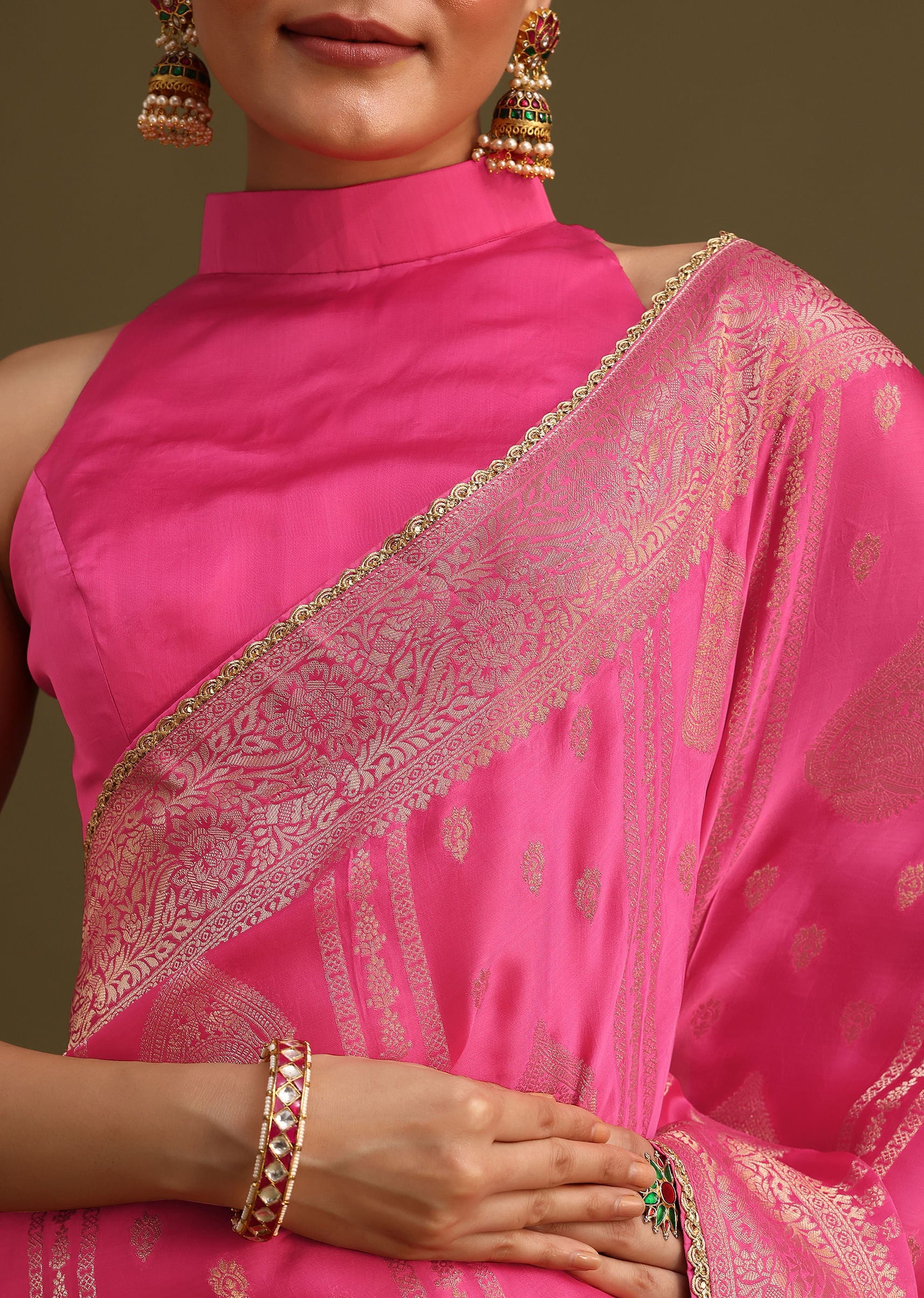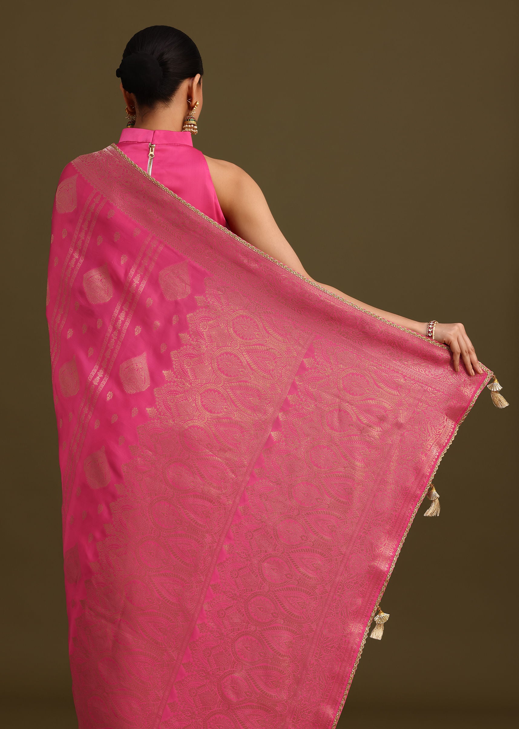 Pink Brocade Zari Weave Saree With Unstitched Blouse