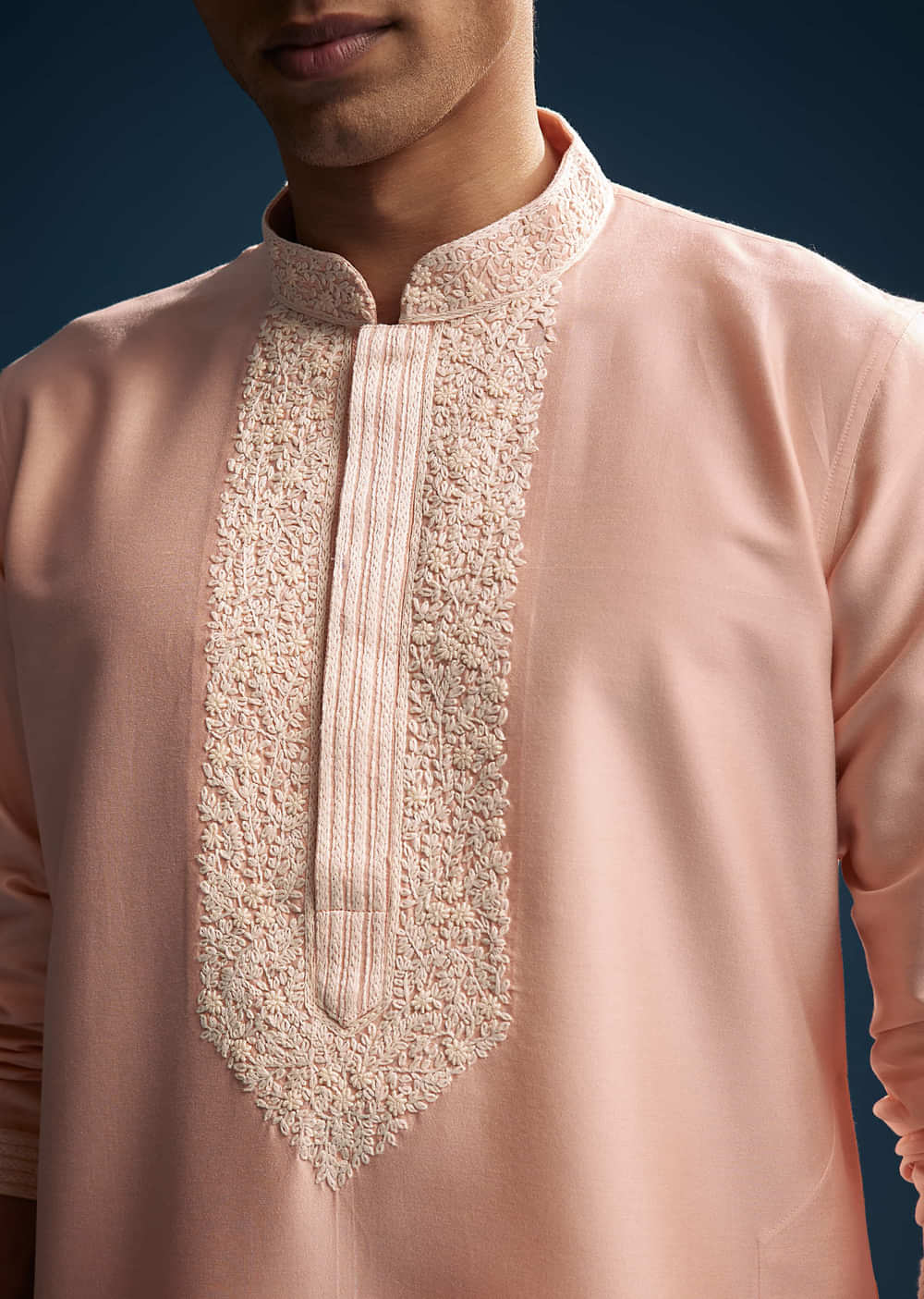 Playful colour meets heritage craft in this pink chanderi kurta set for men featuring Kashmiri hand work and spring knots. The soft sheen of the fabric pairs beautifully with the... More Product Details