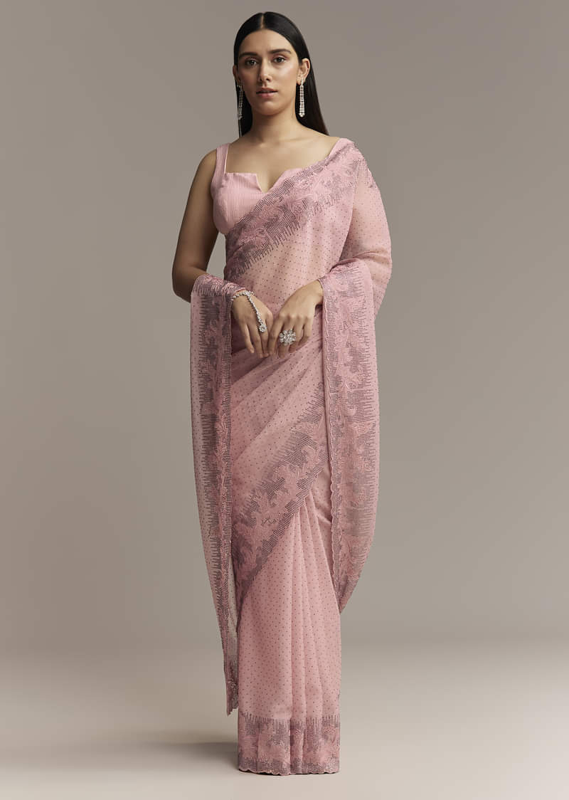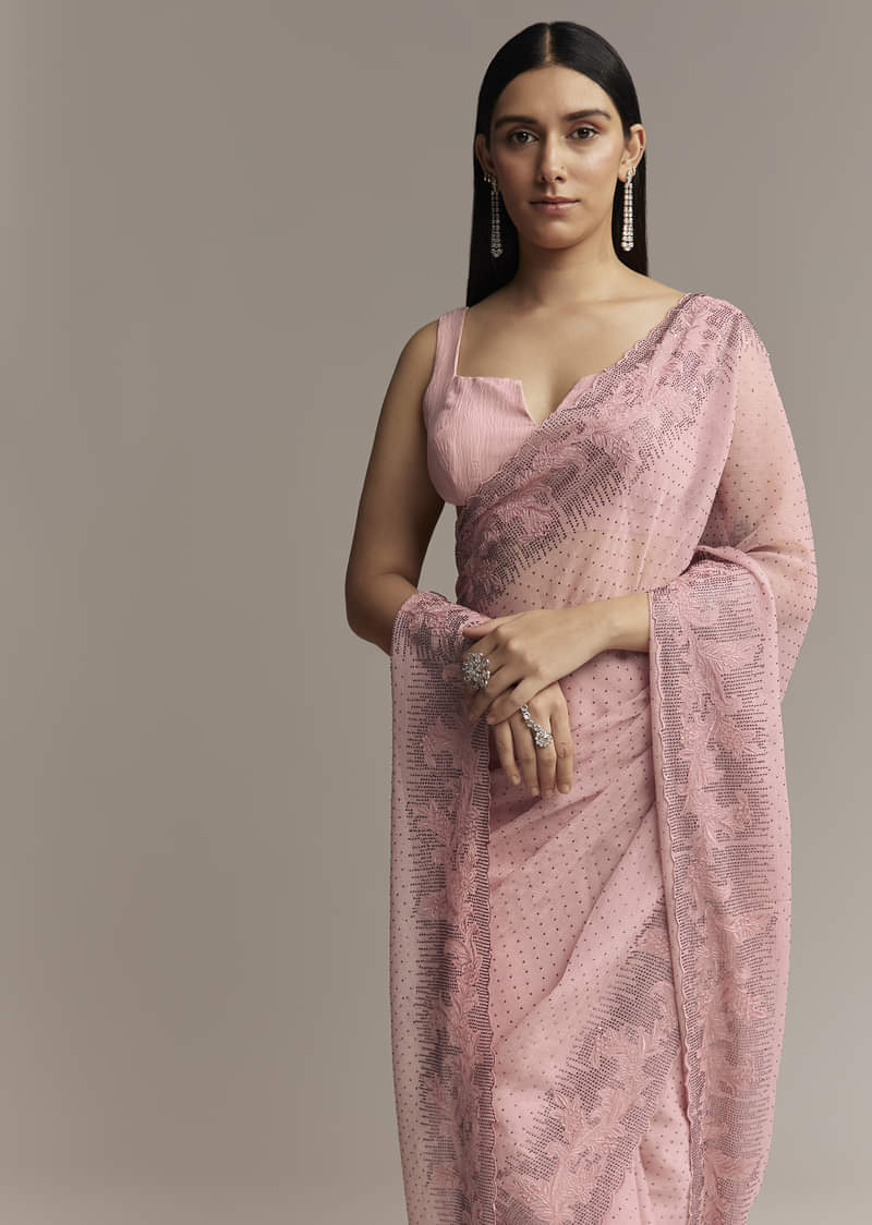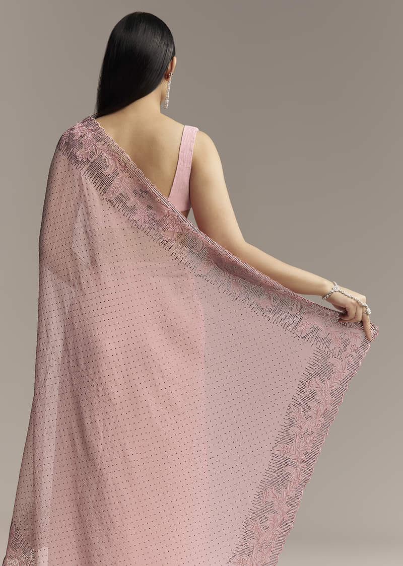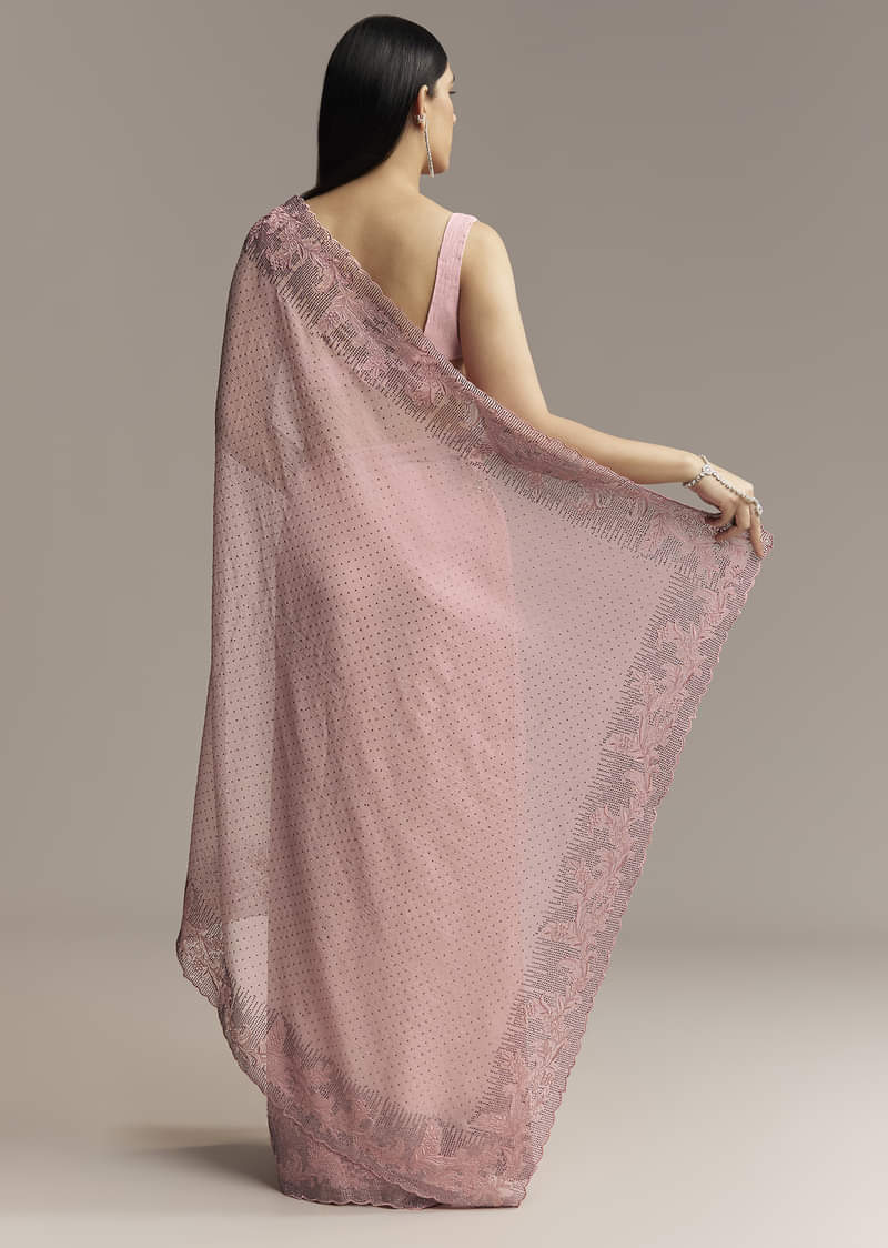 Pink Chiffon Saree With Cutwork Border And Embellished Stones
