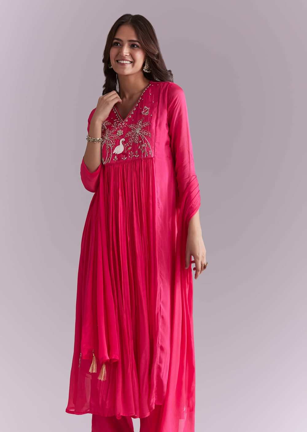 For evenings that ask for shimmer with softness, this pink chinon anarkali suit moves lightly and photographs beautifully. Moti and resham embroidery plays across the anarkali for a refined, festive... More Product Details