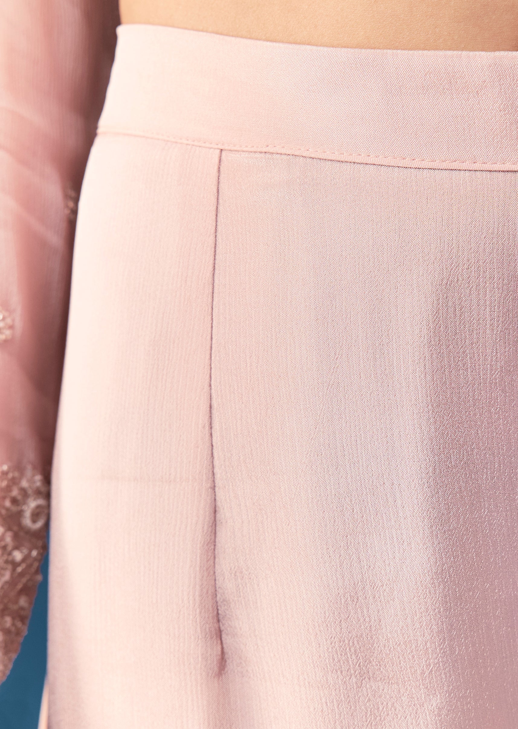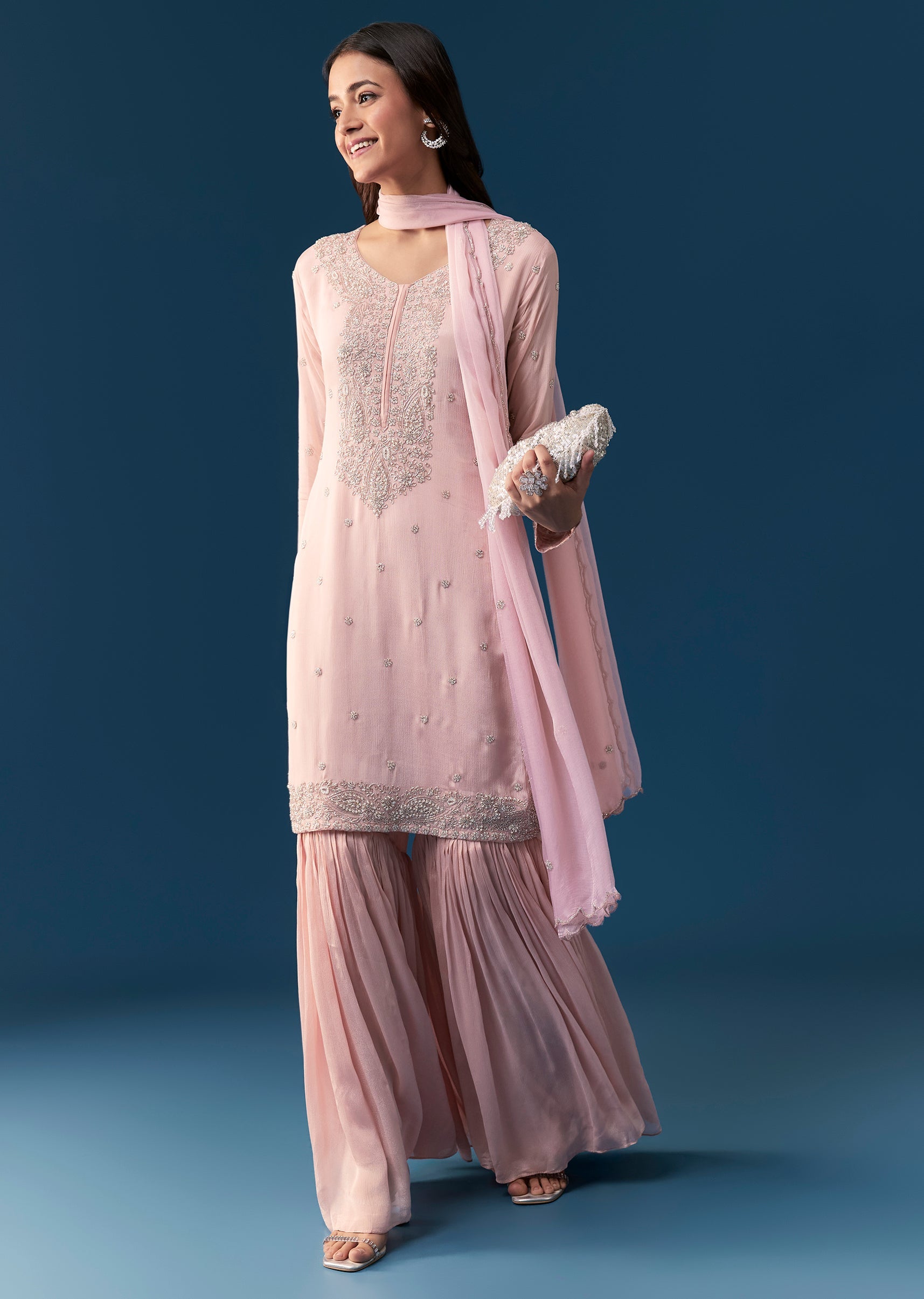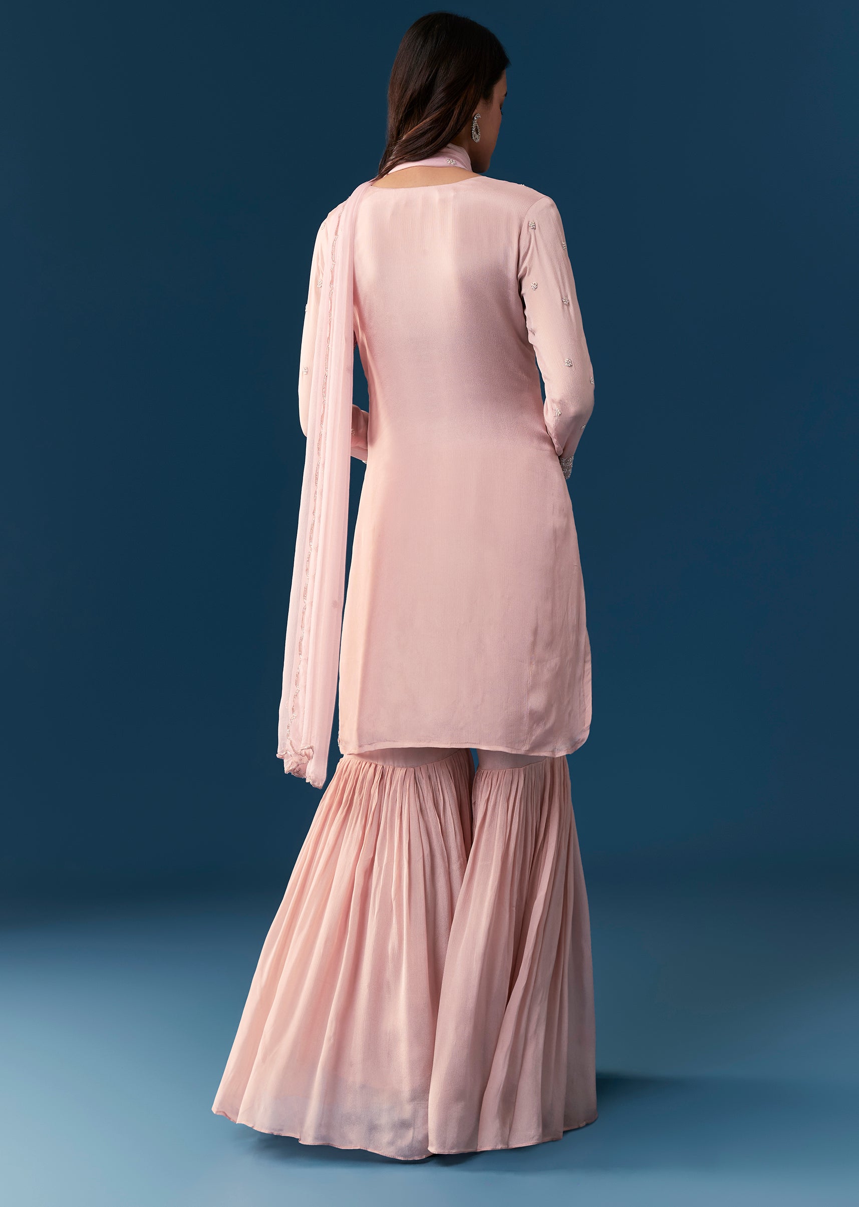 Step into elegant charm with this pastel pink sharara set crafted from soft chinon fabric. The kurta is adorned with delicate embroidery along the full sleeves and V neckline, creating... More Product Details