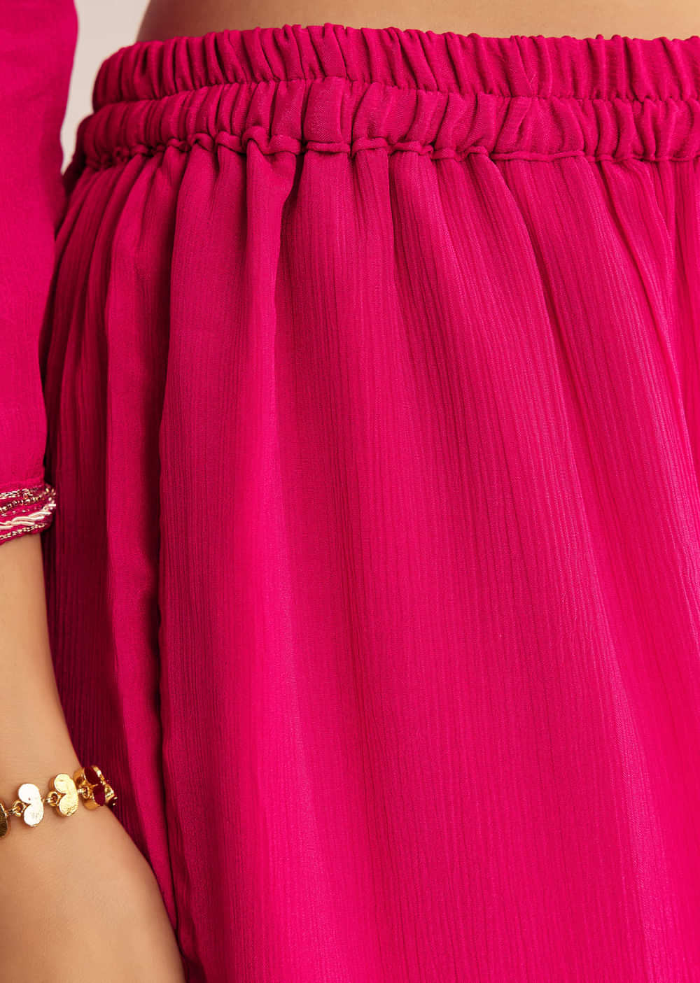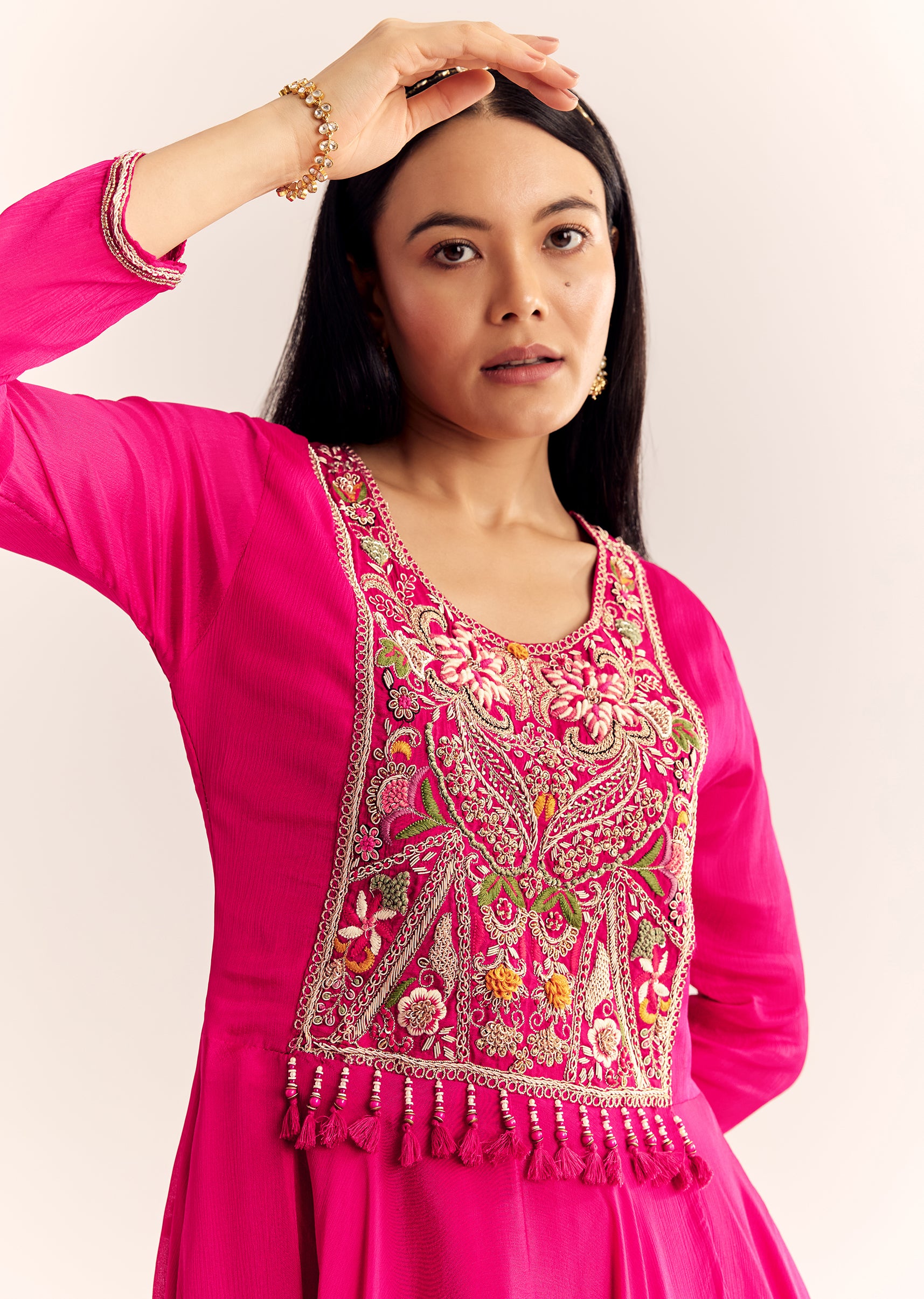 A pink chinon kurta intricately embroidered with zardosi, thread and moti accents, perfect for traditional celebrations. Sweet as a rose-tinted dream.Awarded as the Most Trusted Brand, we're delivering styles you... More Product Details