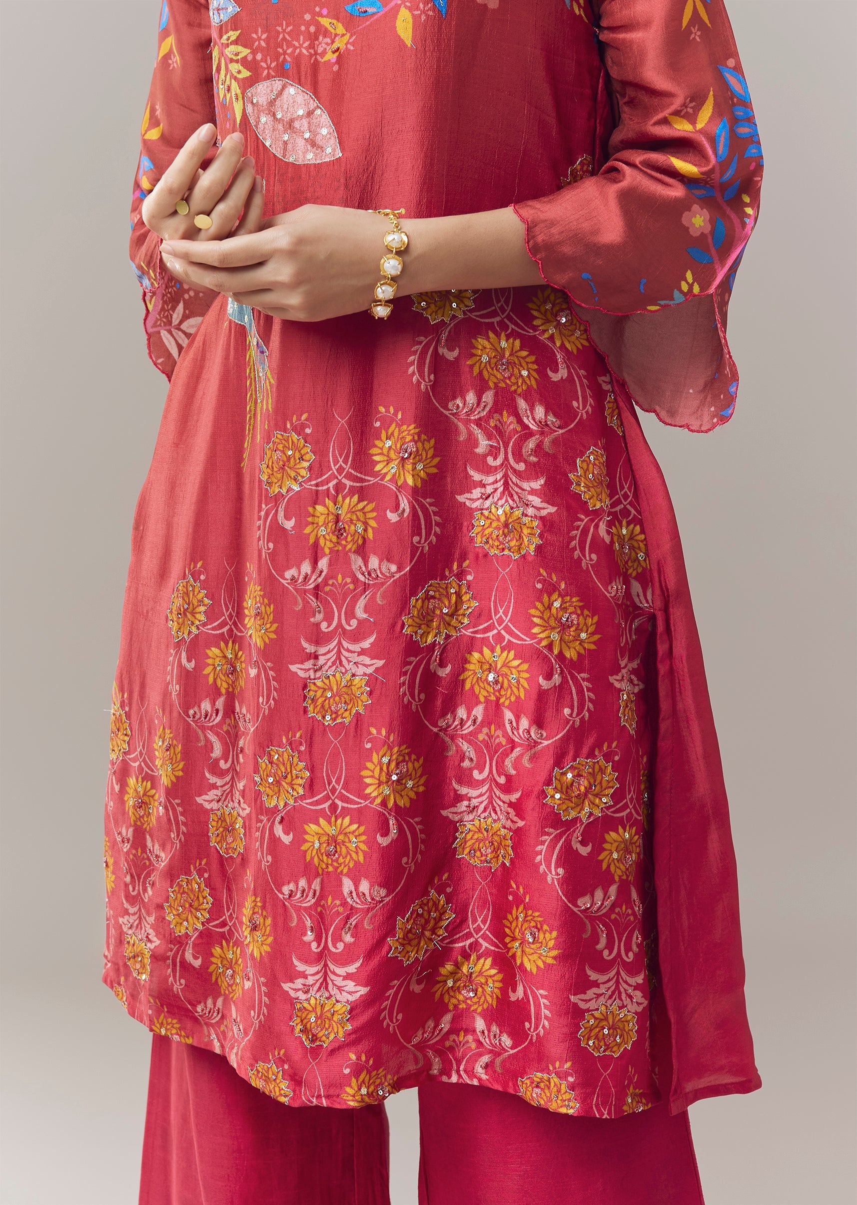 Vibrant and festive, this pink coord set kurti is crafted for celebratory occasions with a focus on intricate detailing. The kurti features delicate floral prints enhanced with beads, zari, and... More Product Details