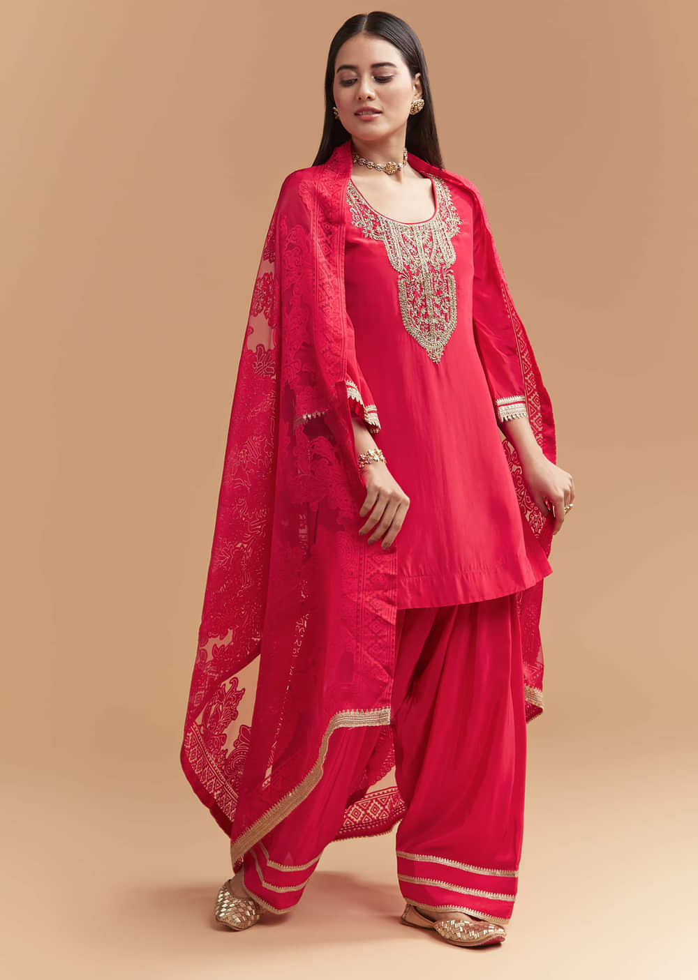Statement craft takes centre stage as this pink crepe kurta set showcases heavy zardosi with a neat gotta lace touch on the sleeves. The crepe drape keeps the look structured... More Product Details