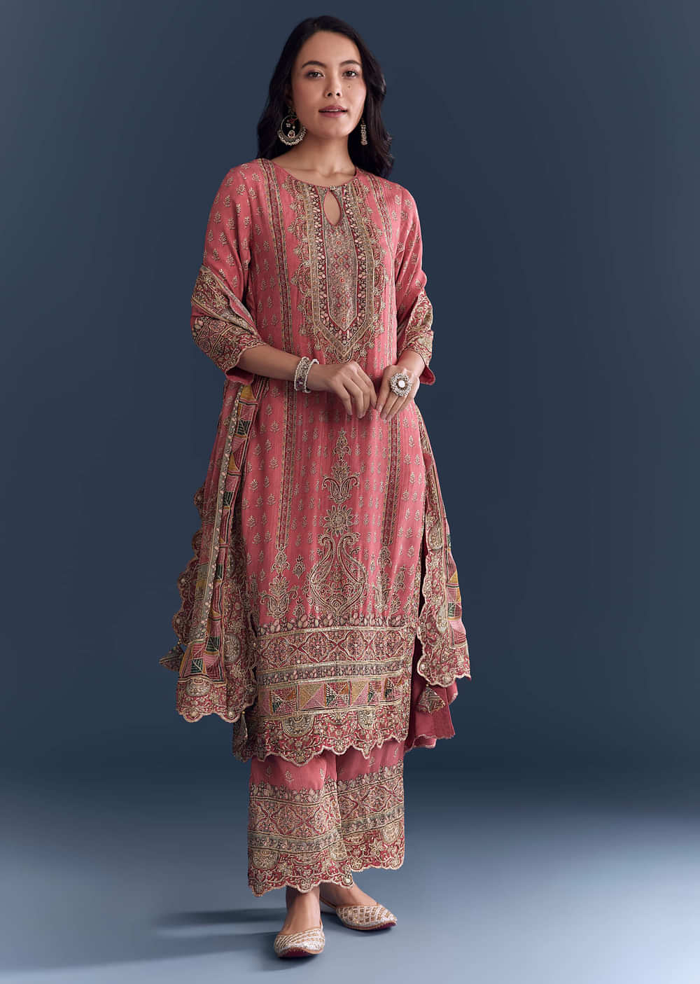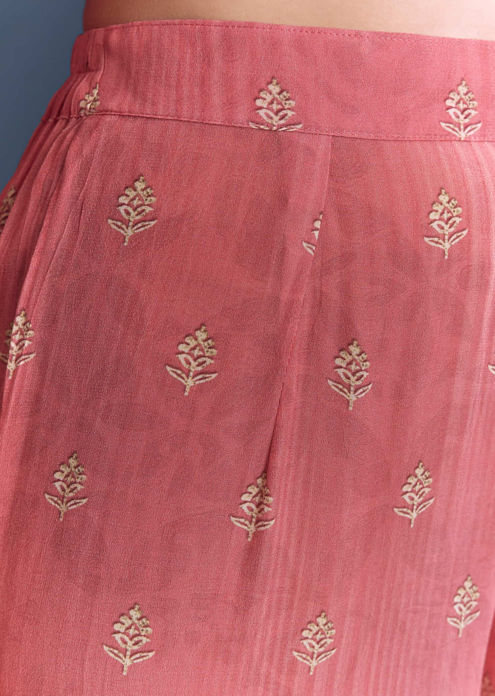 Pink Crepe Kurta Set With Indie Print And Zari Embroidery