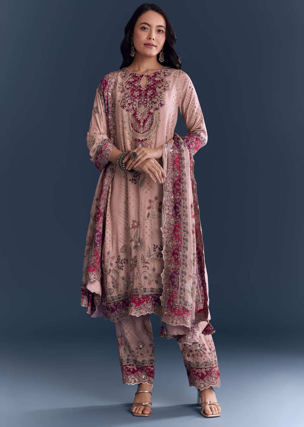 Pink Crepe Kurta Set With Indie Print And Zari Work