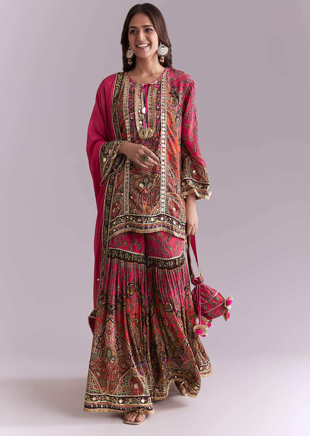Pink Crepe Printed Sharara Suit With Gota Detail And Potli