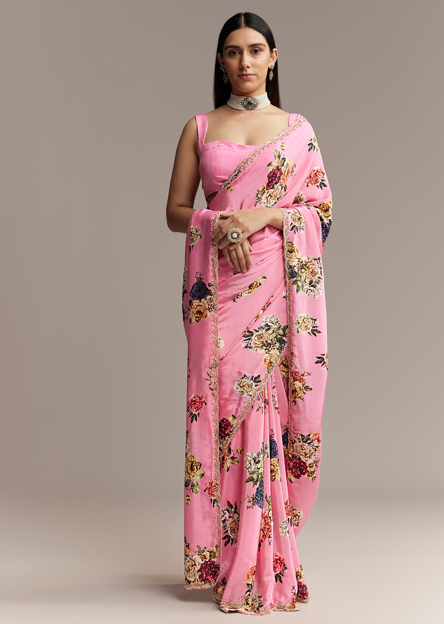 Pink Crepe Saree With Floral Digital Print And Sequin Border