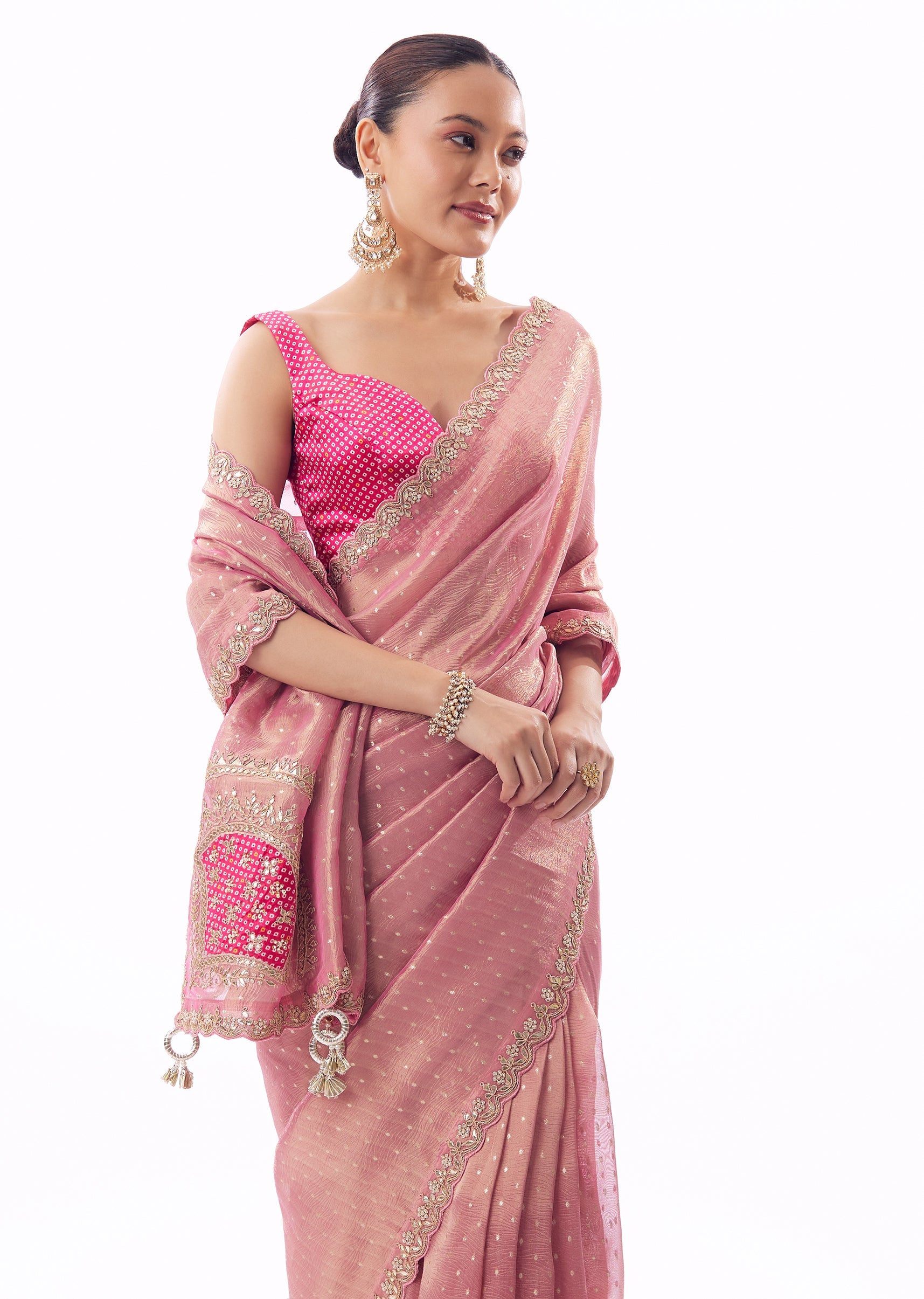 Romantic and festive with a touch of traditional artistry, this pink crushed tissue saree blends texture and craft beautifully. The crushed tissue base adds depth and dimension to the drape, while the scallop border is enhanced with intricate patchwork featuring gota work and zari detailing. Bandhani-inspired blouse fabric and tassel accents on the pallu lend it a celebratory charm rooted in heritage design. Perfect for engagement ceremonies, mehendi functions, and haldi celebrations, this saree strikes the right balance between festive vibrance and graceful elegance. Awarded as the Most Trusted Brand, we're delivering styles you love, just as promised.
