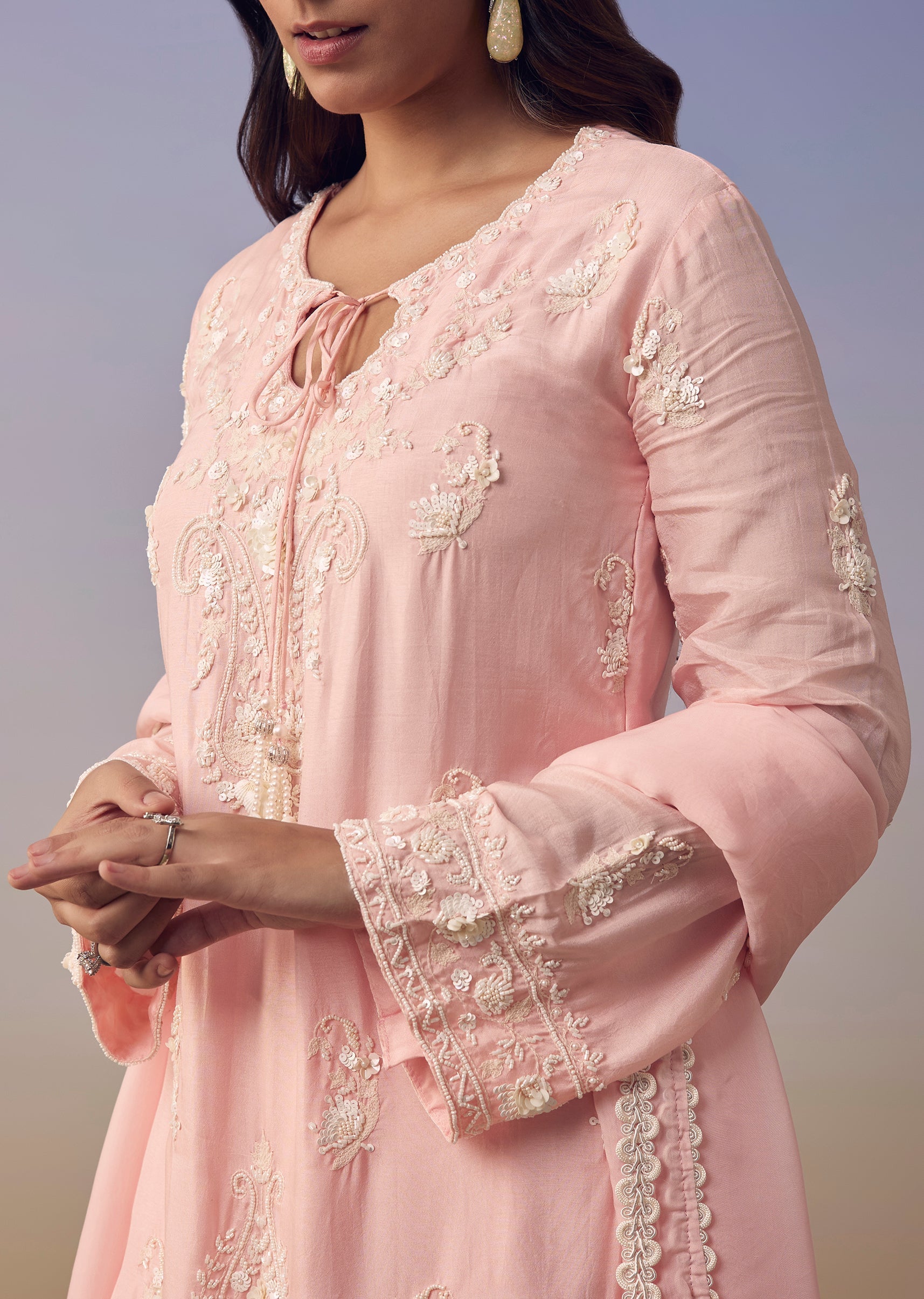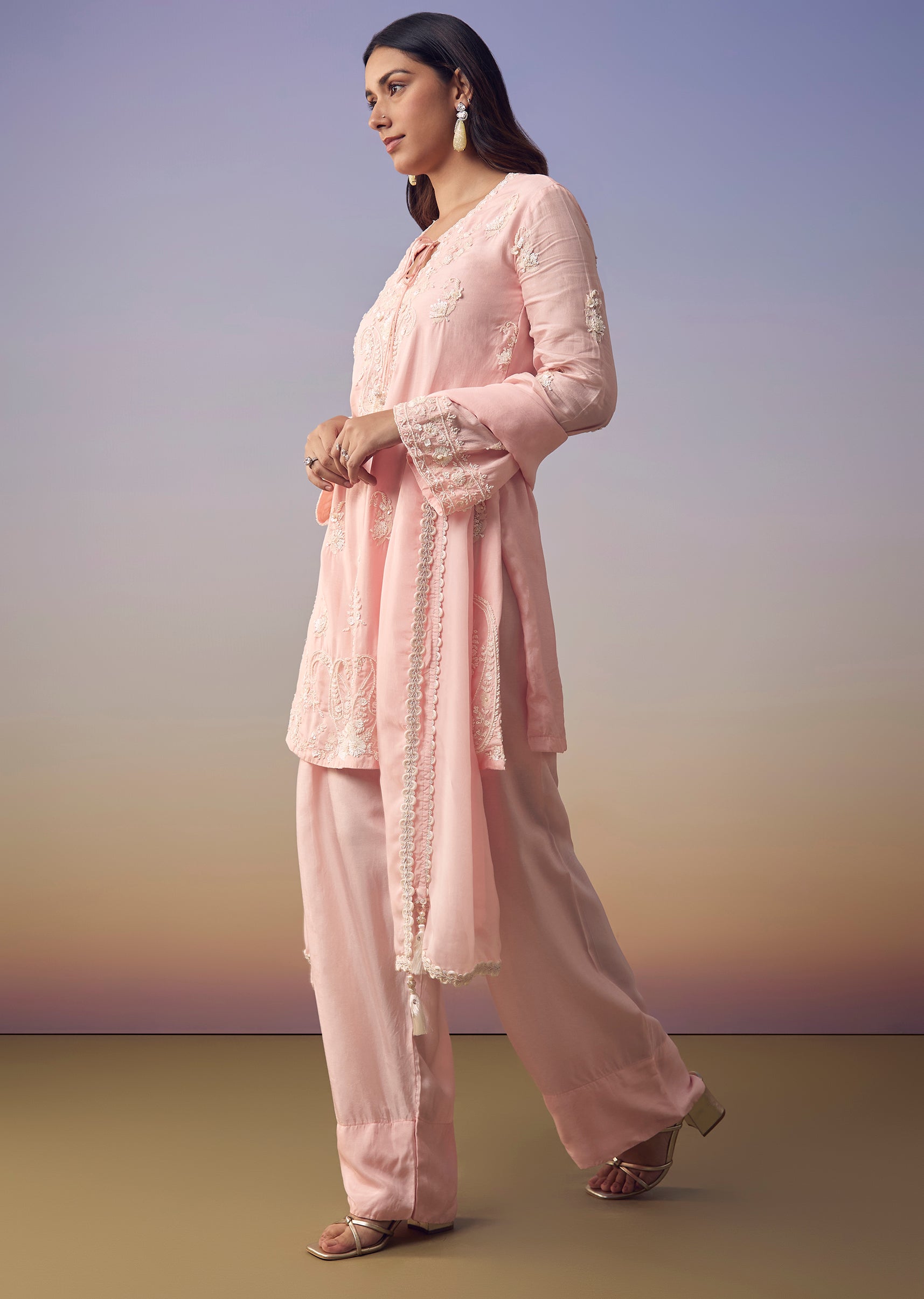 Step into graceful charm with this pink kurta set crafted in a smooth viscose and silk blend, adorned with moti accents, sequin highlights, and delicate embroidery that add a refined... More Product Details