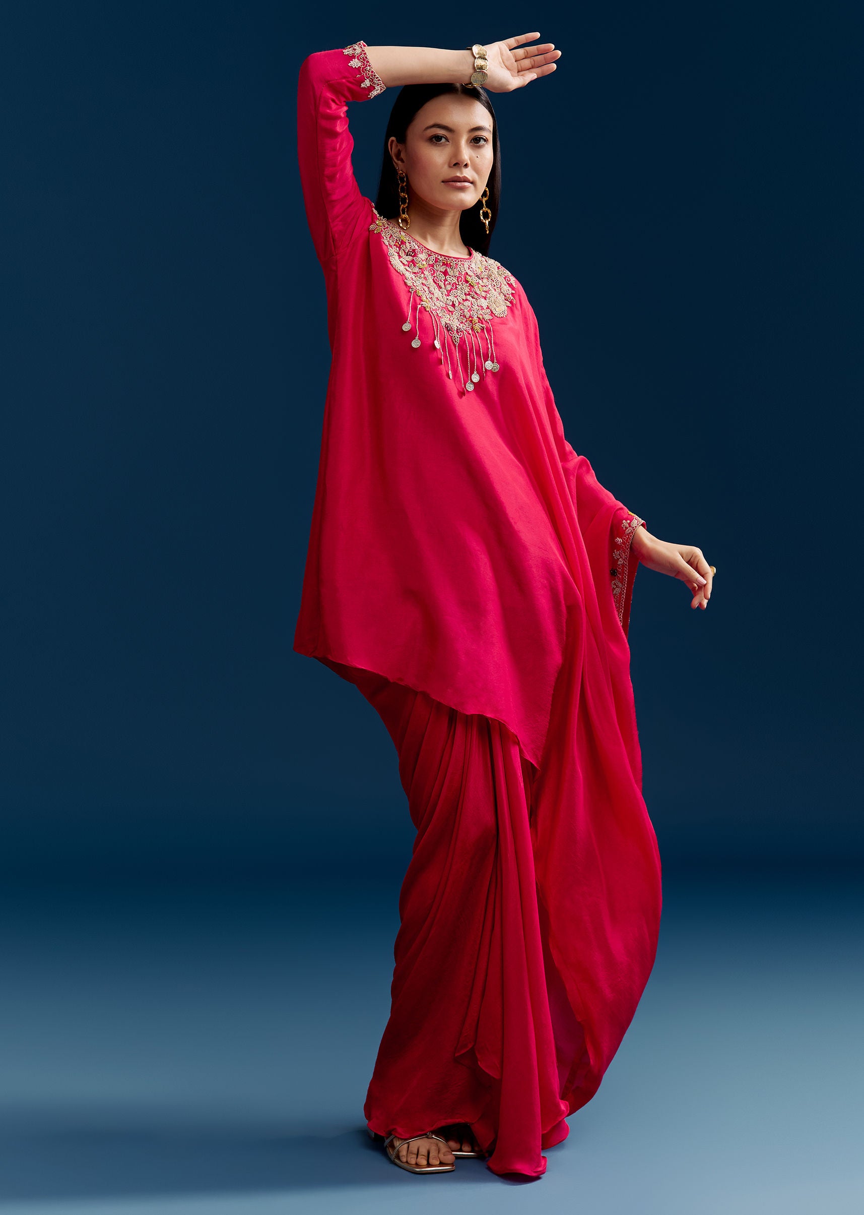 This pink asymmetric top and skirt set is crafted in lustrous dola silk and finished with detailed zardosi embroidery. The fancy sleeves and round neckline add character, while the high-low design brings in a hint of edginess. A great choice for cocktail evenings that need a fashion-forward touch. Awarded as the Most Trusted Brand, we're delivering styles you love, just as promised.