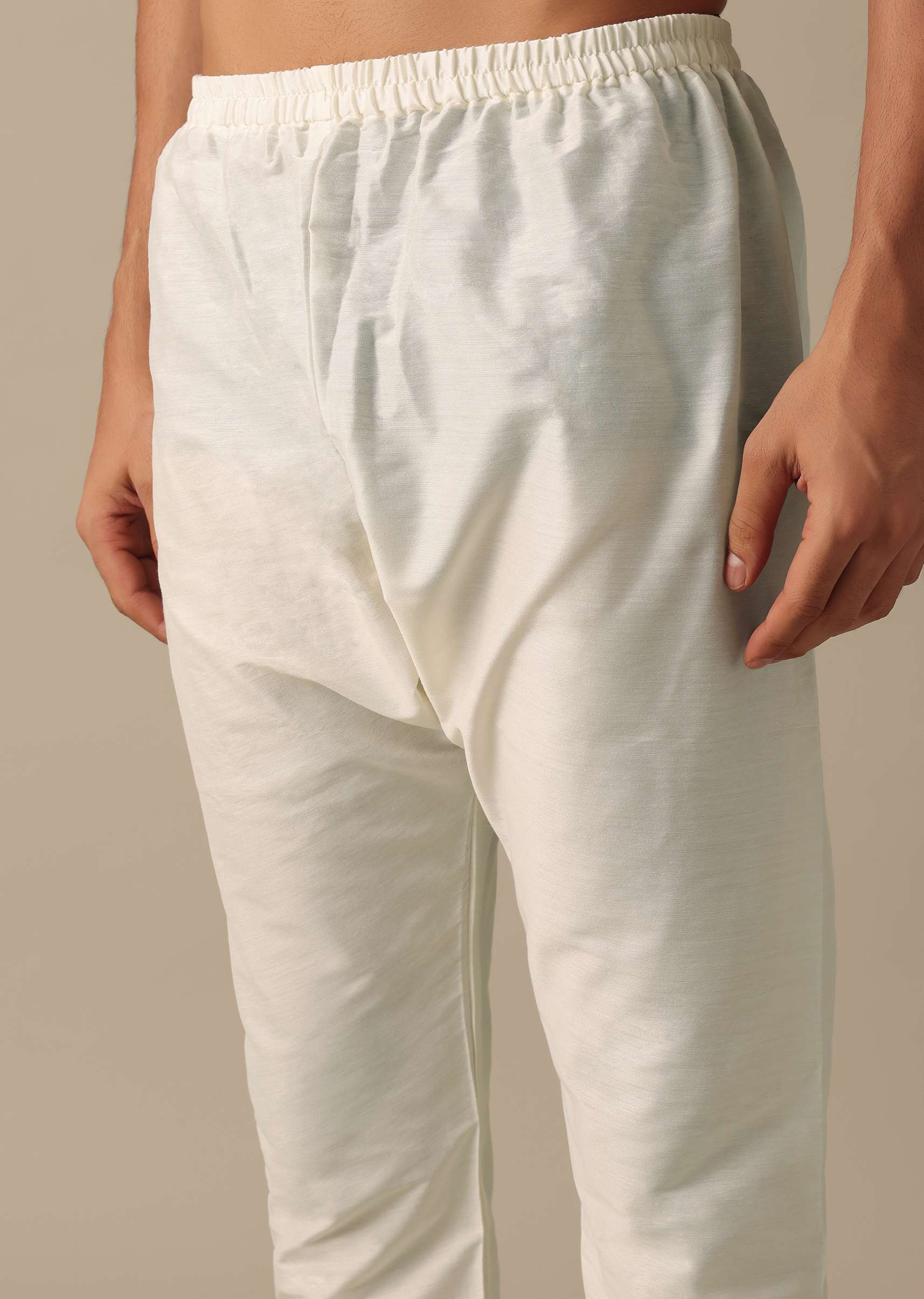 - Featuring delicate resham thread embroidery, it is paired with a Mandarin collar, full-sleeve kurta.