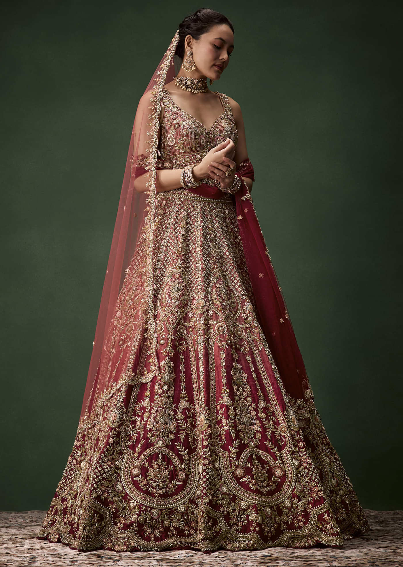 Pink Embroidered Bridal Raw Silk Lehenga Set with Two Dupattas