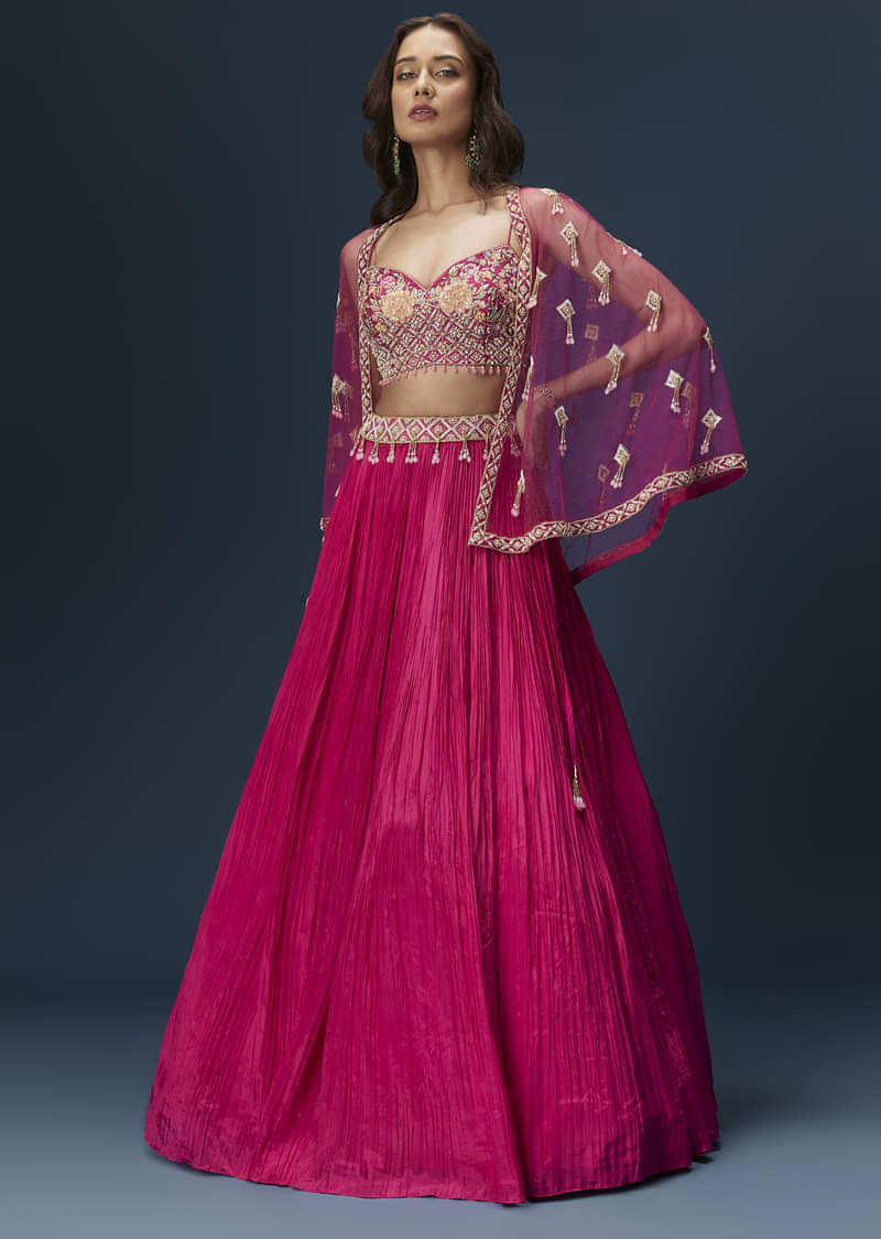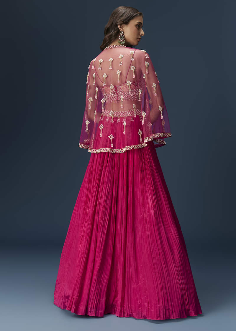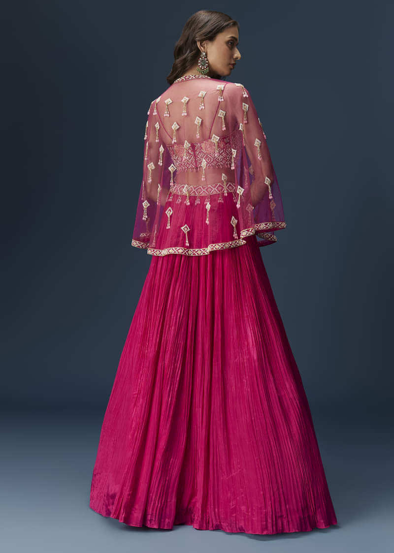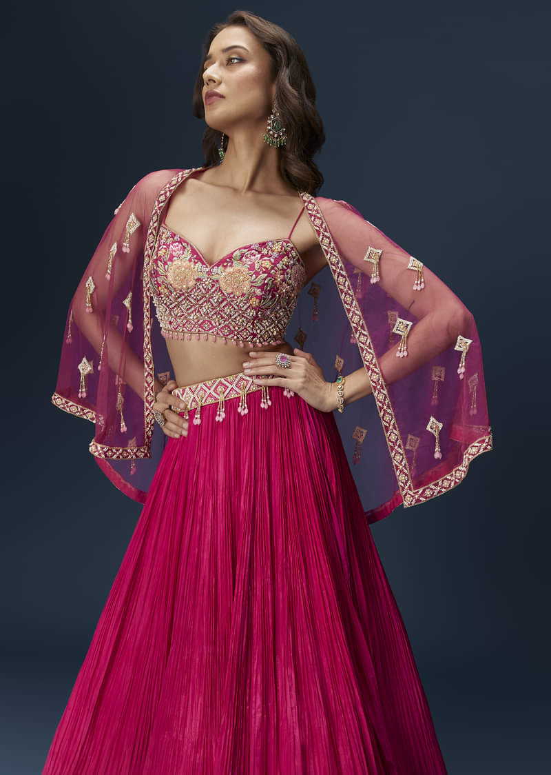 A vibrant pink lehenga set featuring a structured blouse with delicate embroidery, paired with a matching cape and a flared lehenga. This modern silhouette blends tradition with contemporary flair for bridesmaid-friendly looks. Awarded as the Most Trusted Brand, we're delivering styles you love, just as promised.