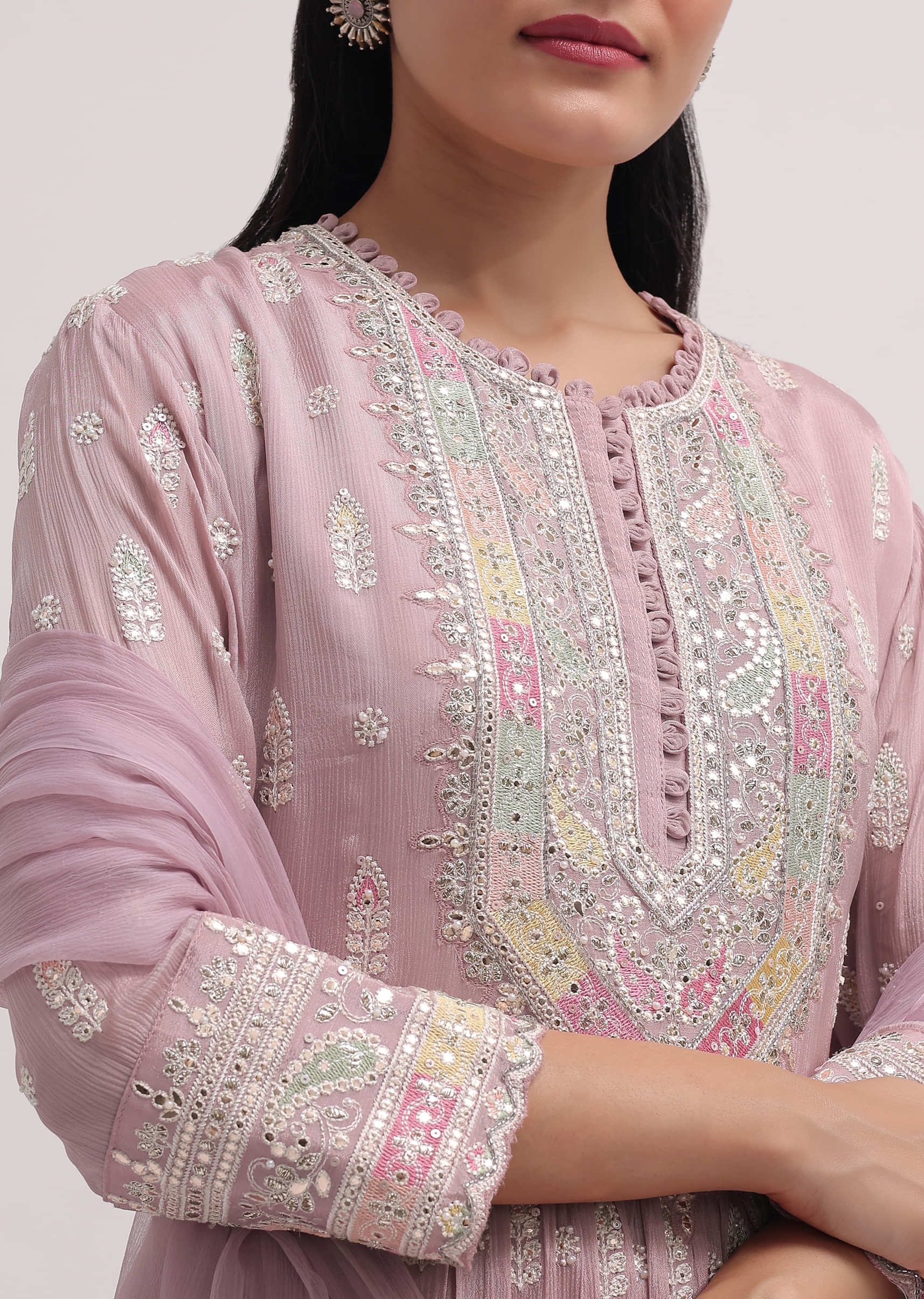- This chiffon suit features intricate gotta work resham work sequins and moti embroidery.