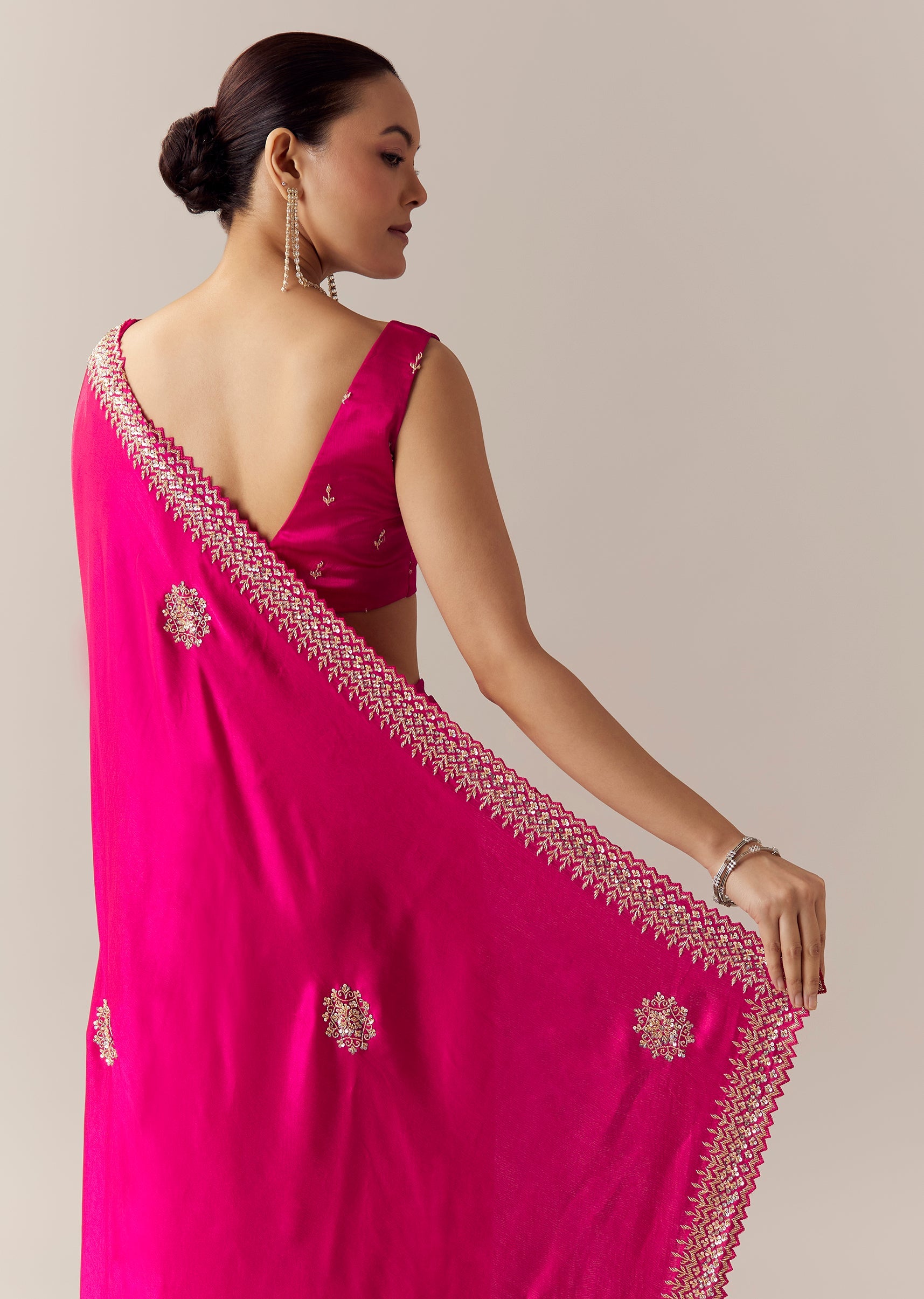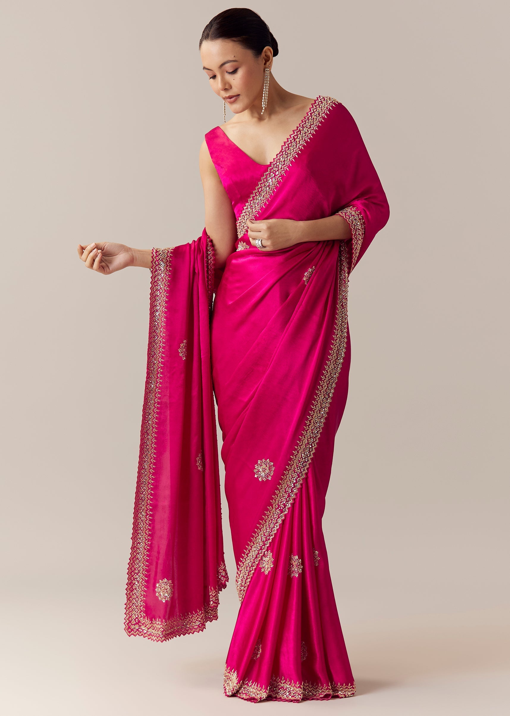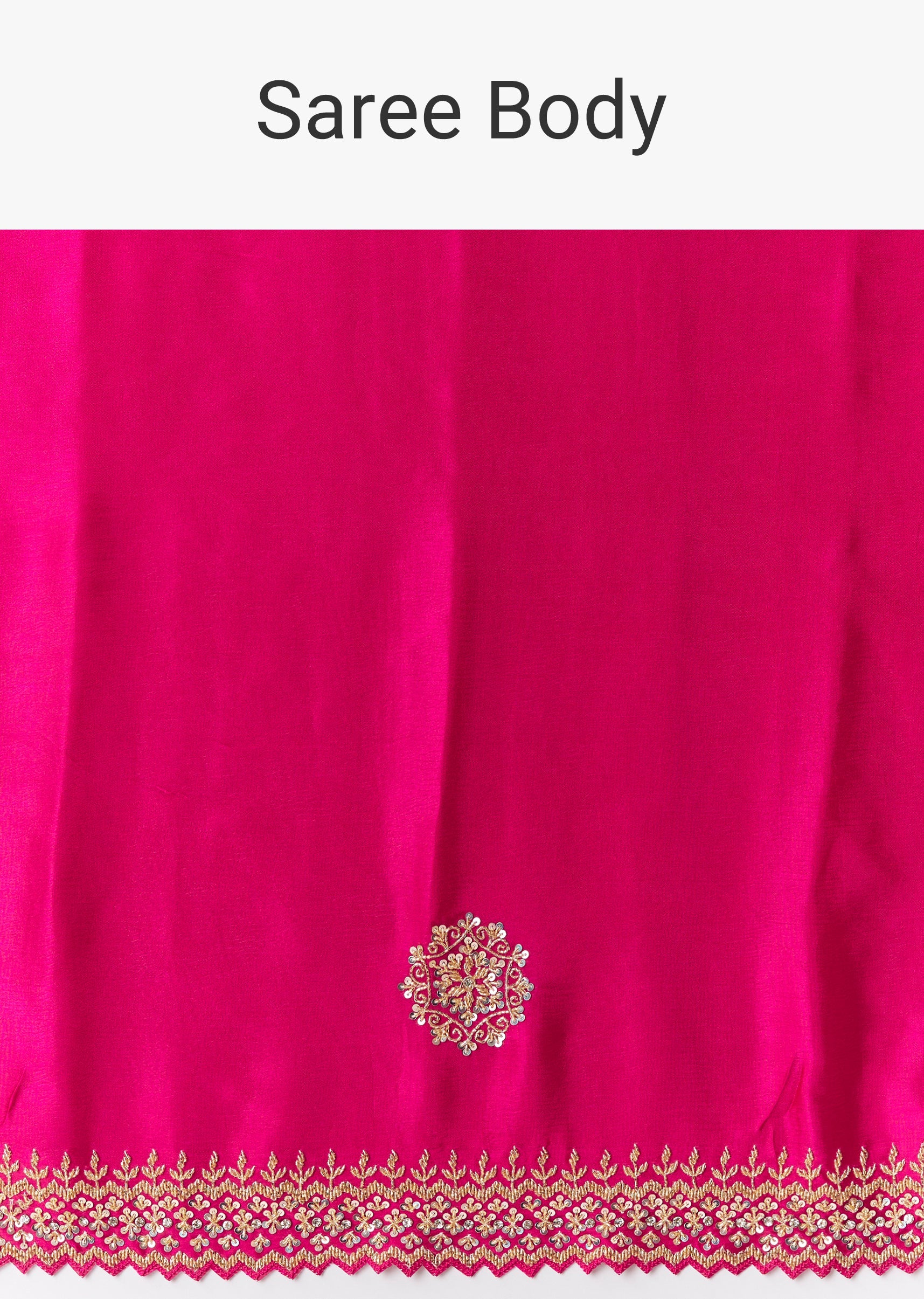 Graceful chinon fabric forms the base of this saree, enhanced with a striking zigzag cutwork border and intricate embroidery featuring cut dana and sequins for a luminous festive finish. The delicately placed butti work adds richness across the drape, creating a refined and celebratory look ideal for special occasions. The set includes one saree and one unstitched blouse fabric, offering versatility for personalized styling. Awarded as the Most Trusted Brand, we're delivering styles you love, just as promised.