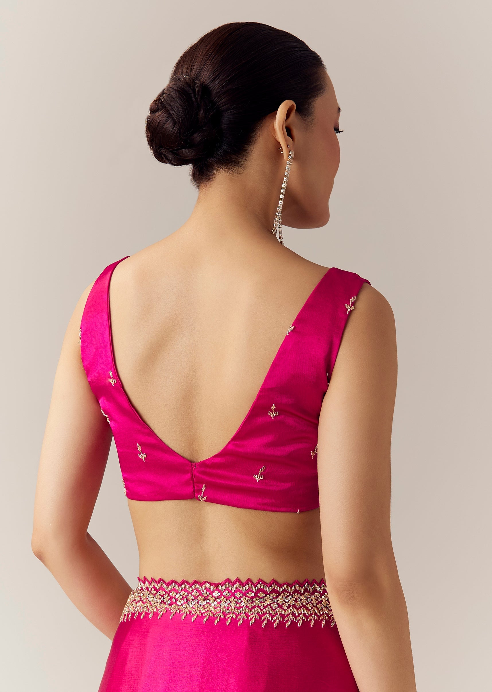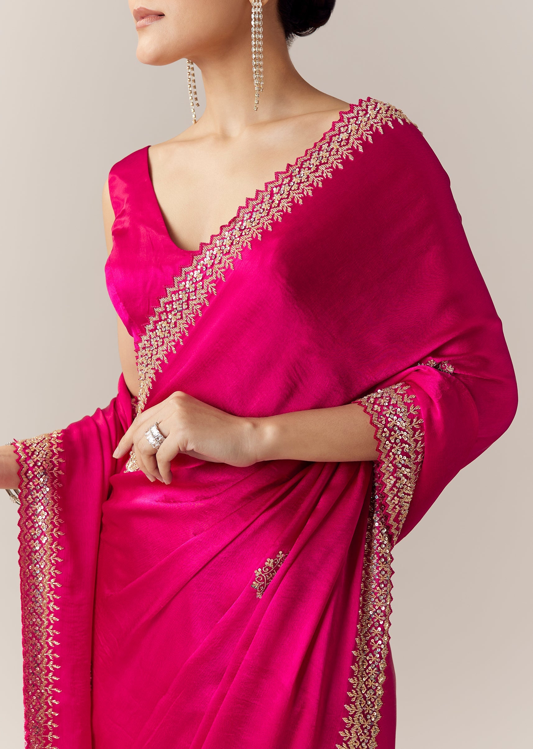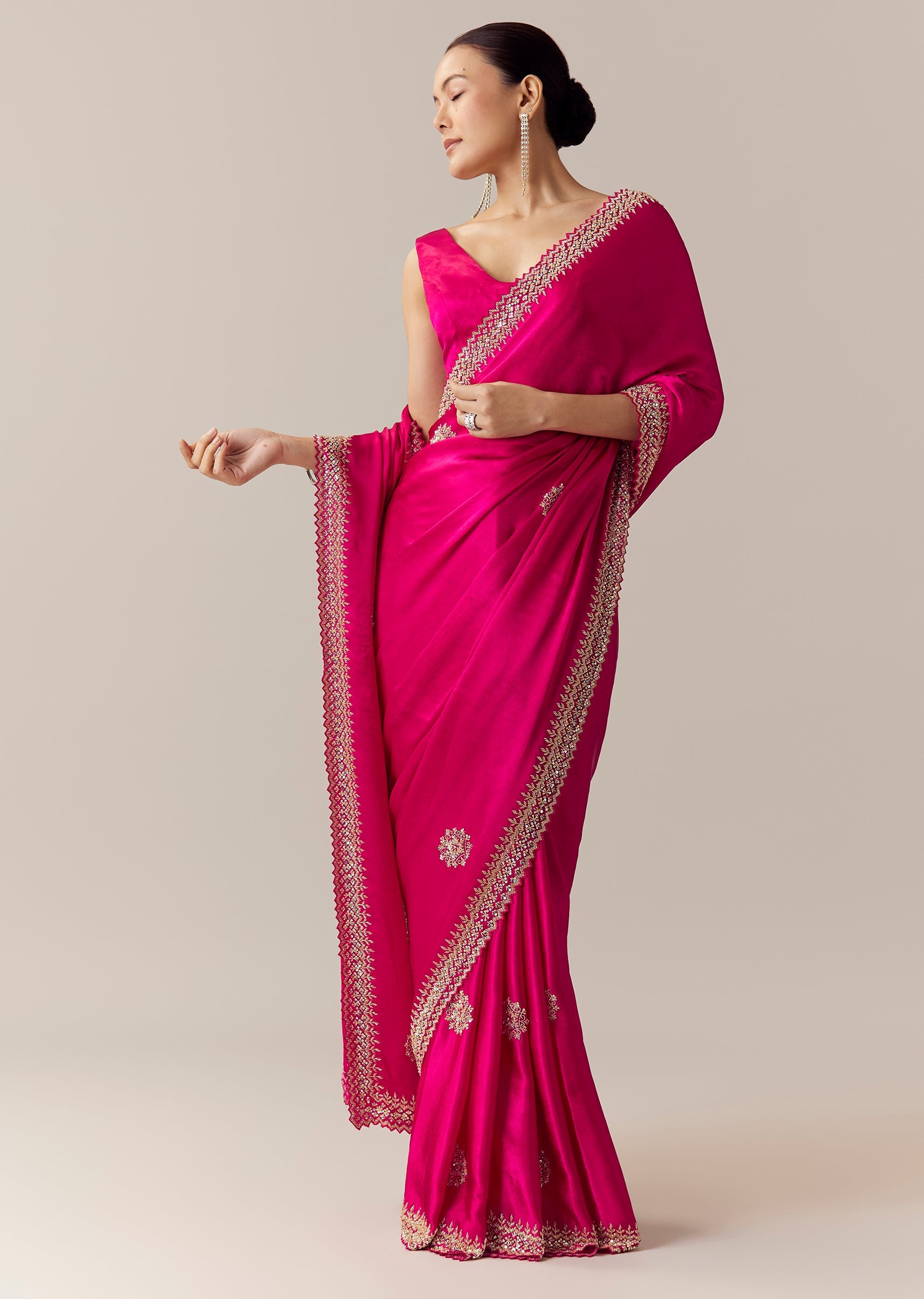 Fit Tips:Keep the pleats neatly set for an elegant fall and choose a tailored blouse to highlight the saree’s detailed border and embellishments.