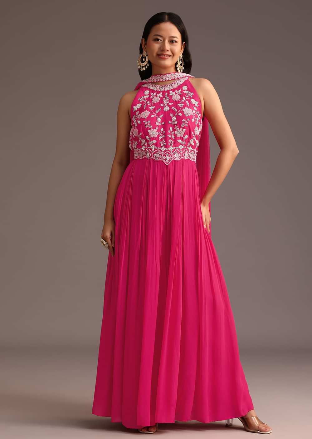Pink Embroidered Jumpsuit With Choker Net Dupatta