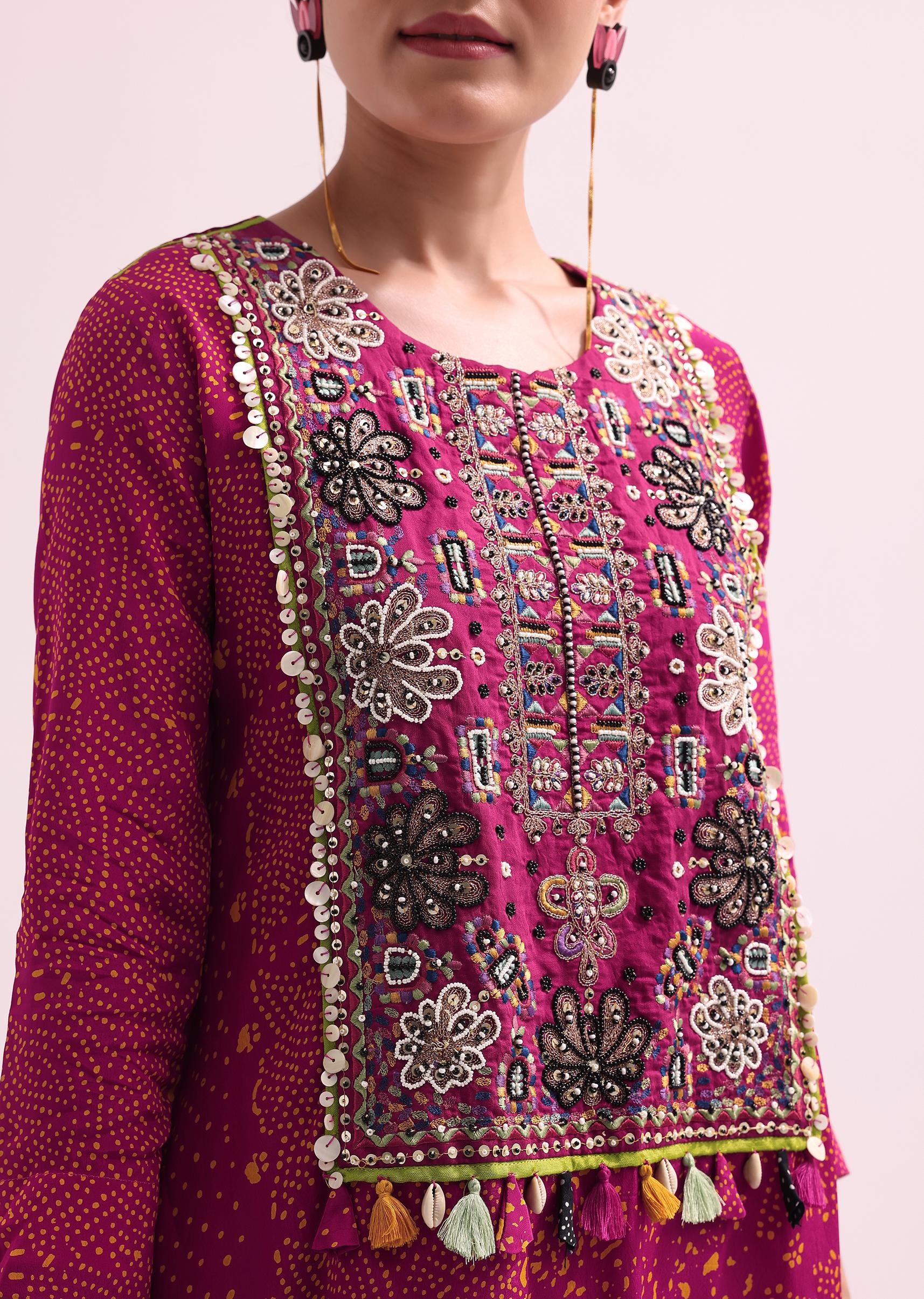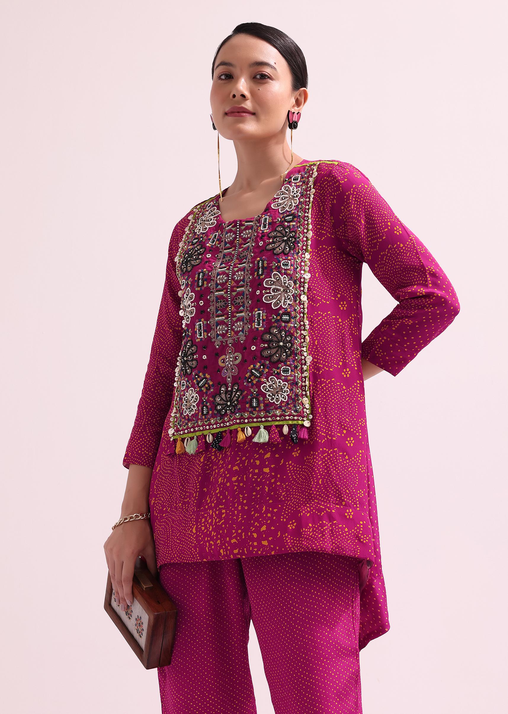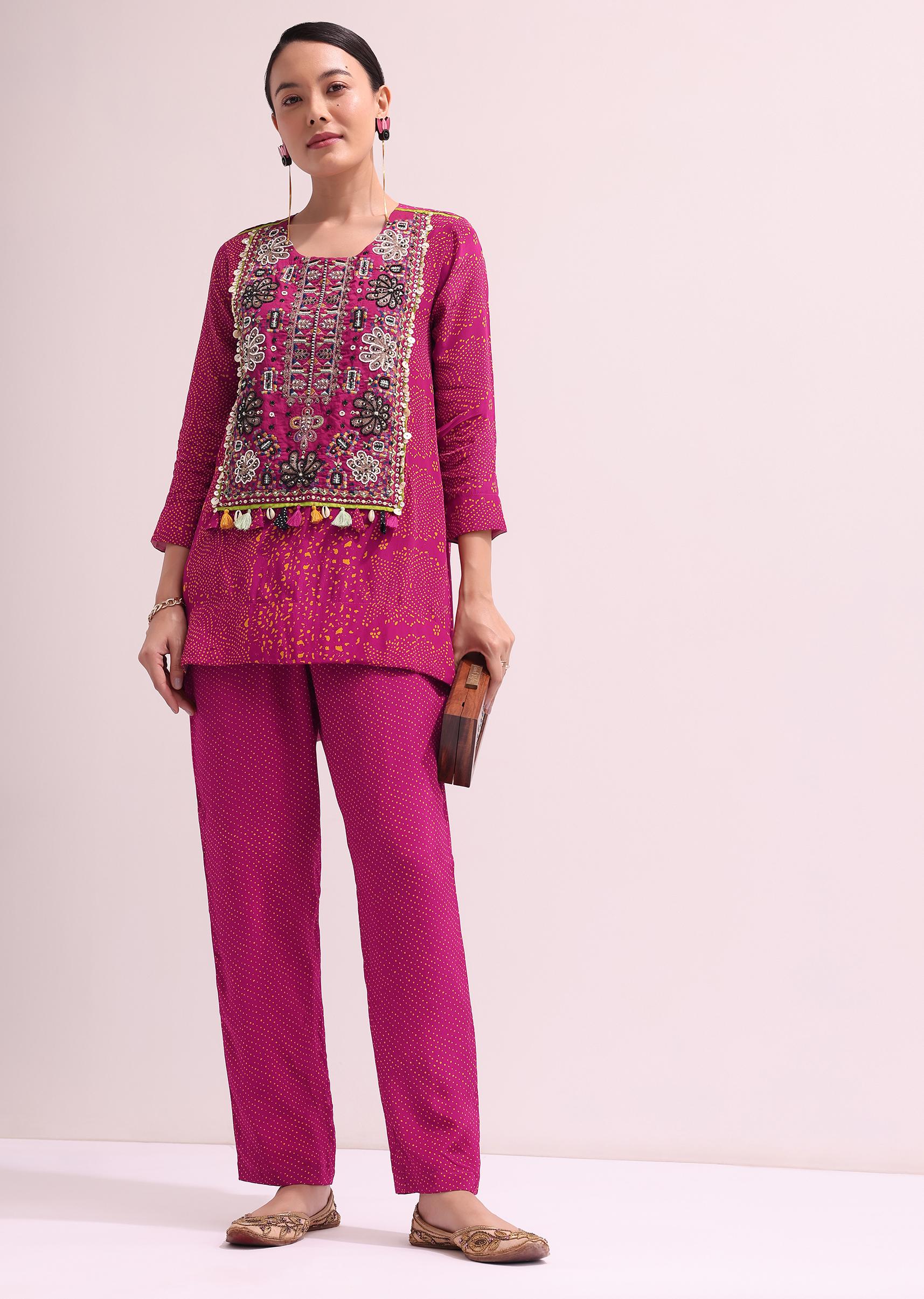 - Pink embroidered kurta and pant setThis set is fabricated from crepe fabric and accompanied by beads, resham, and sequins embroidery.