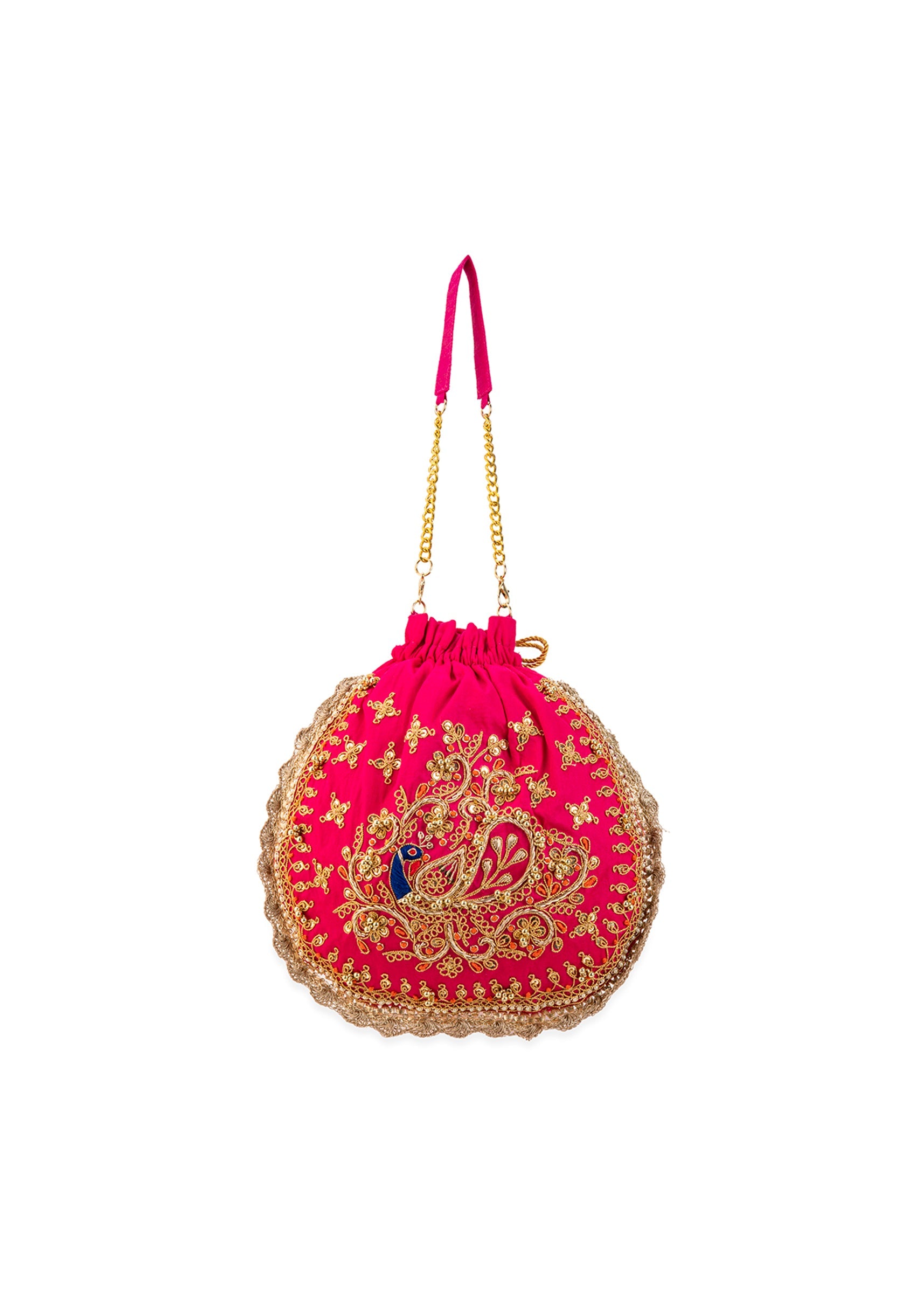 A burst of vibrant pink and intricate embroidery makes this silk potli a lively, festive standout. The classic drawstring design adds a touch of tradition while keeping it chic and... More Product Details