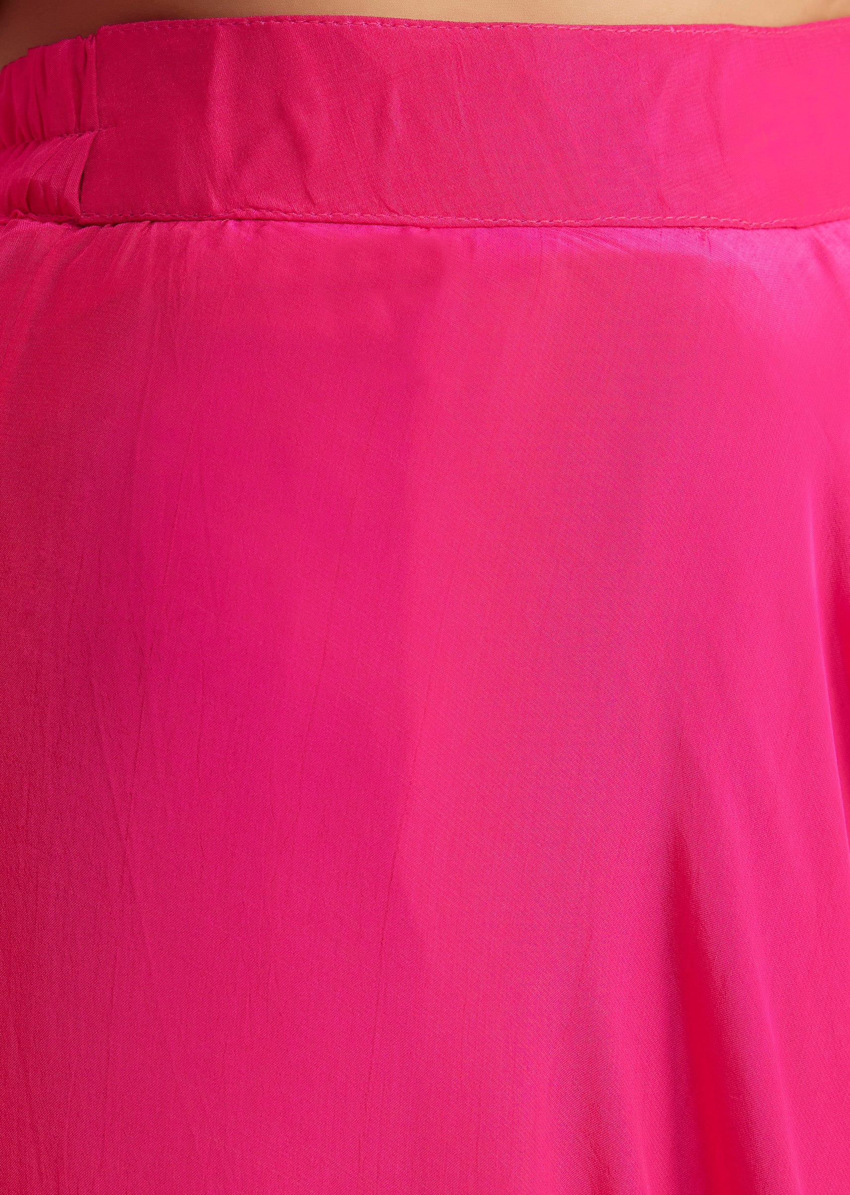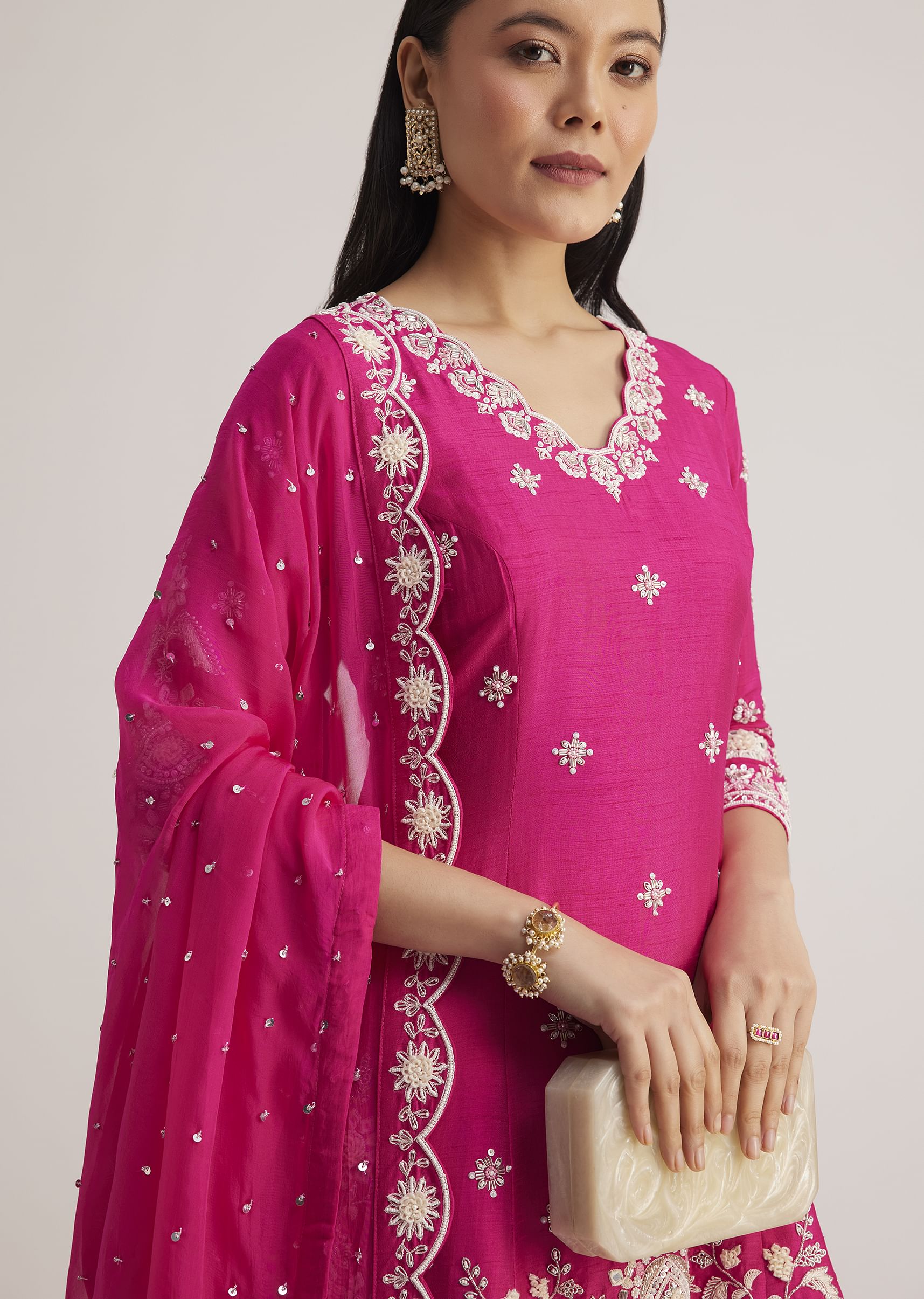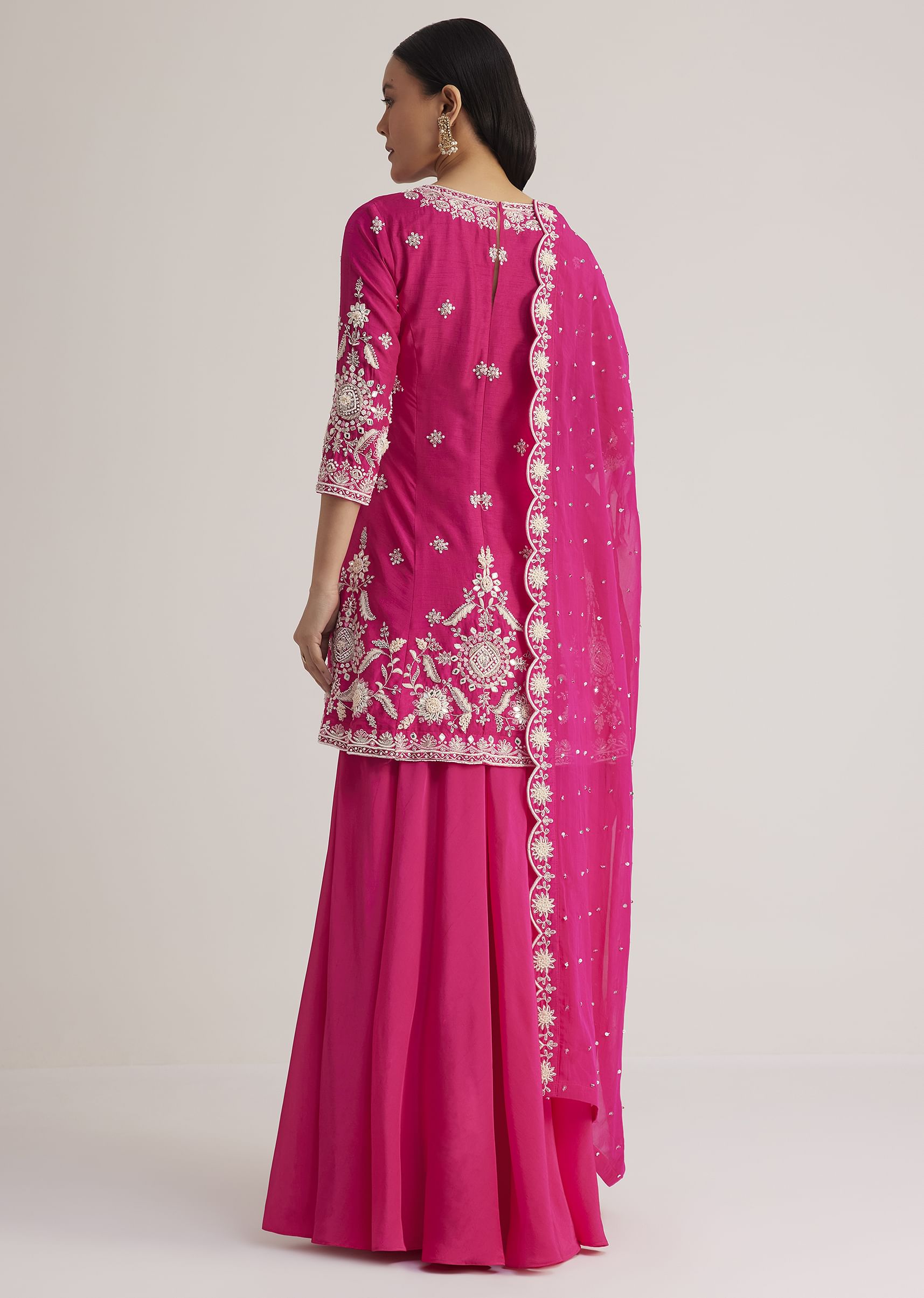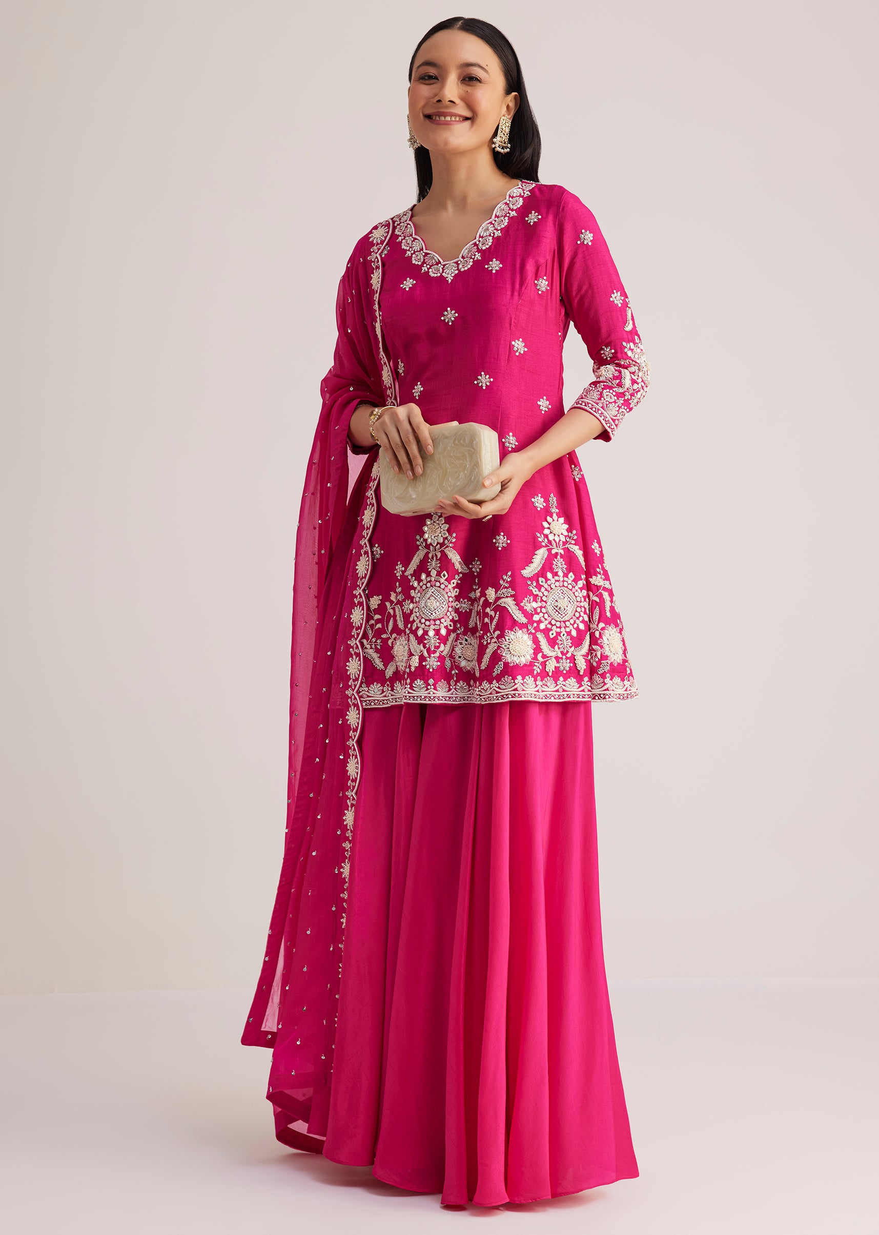 Brighten Up Your Festive Wardrobe With This Vibrant Pink Palazzo Suit Intricately Adorned With Delicate White Embroidery And Mirror Accents. Perfect For Daytime Wedding Functions Like Haldi Or Festive Celebrations... More Product Details