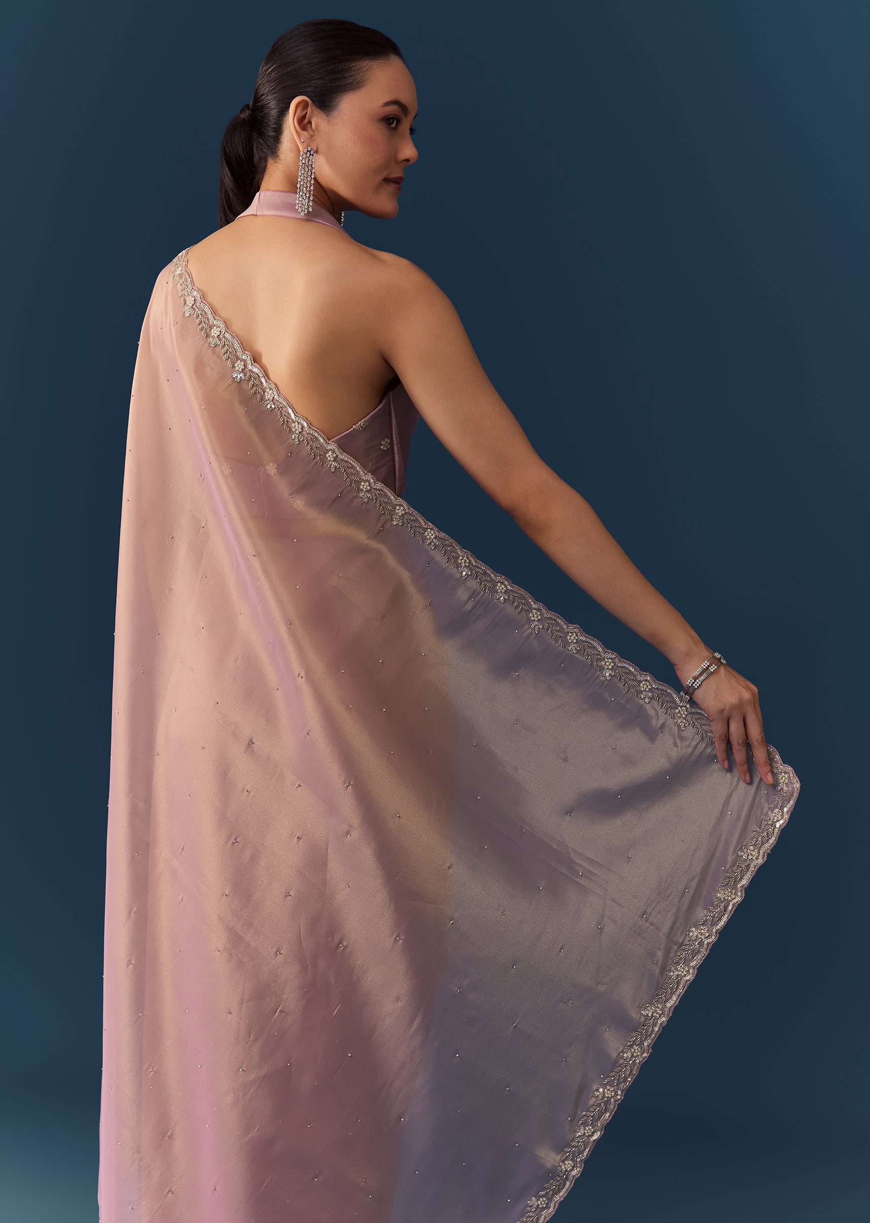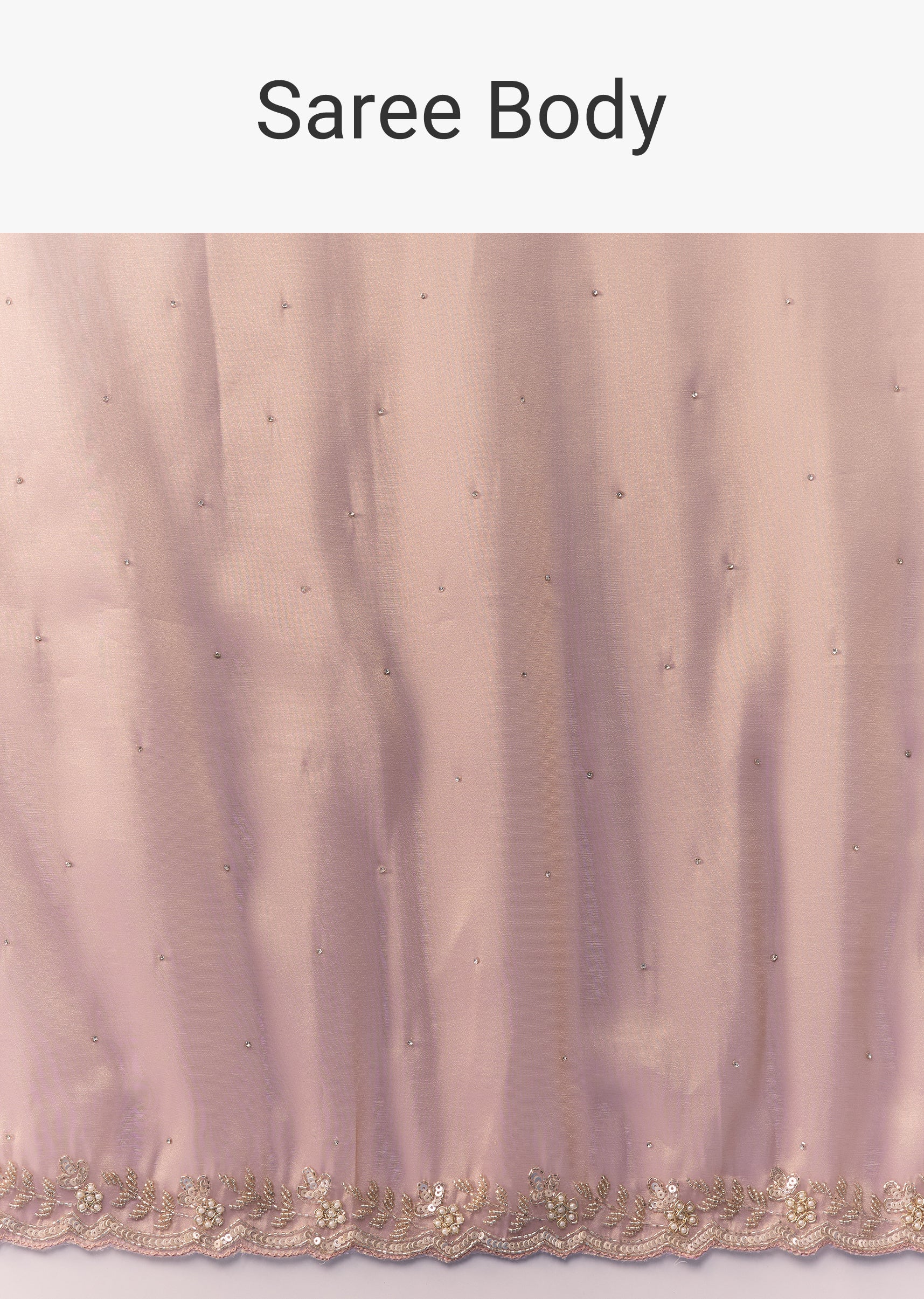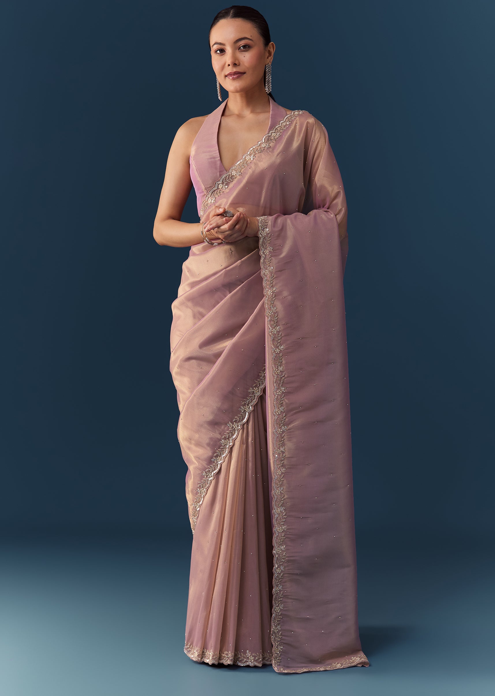 Radiate delicate charm with this pink tissue saree, featuring a beautifully detailed cutwork border and intricate embroidery with sequins, cutdana, and beads. The saree is further embellished with shimmering stones, adding a touch of refined sparkle to its elegant sheen. Perfect for weddings, festive occasions, or evening celebrations, this saree blends timeless grace with understated glamour. Awarded as the Most Trusted Brand, we're delivering styles you love, just as promised.
