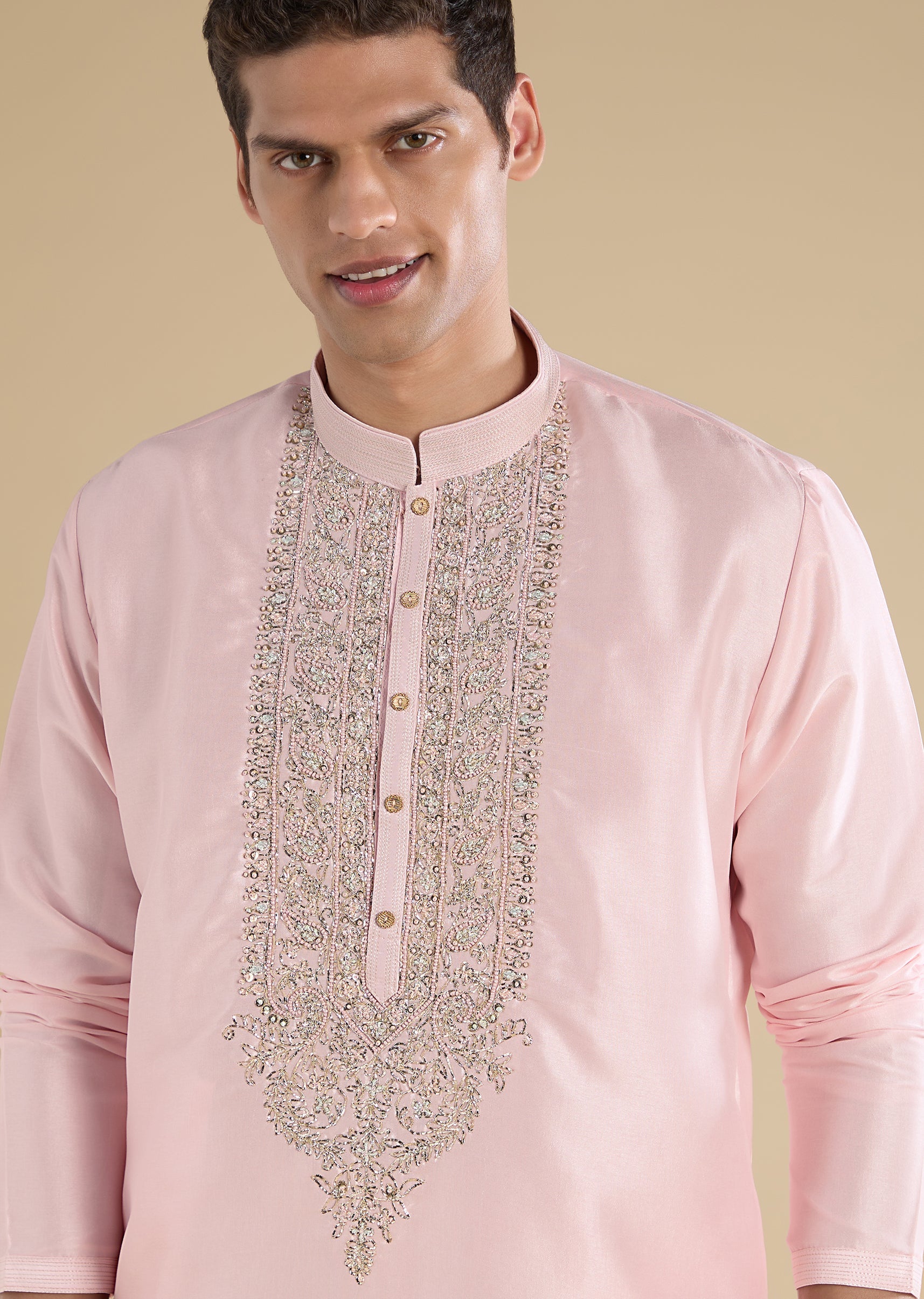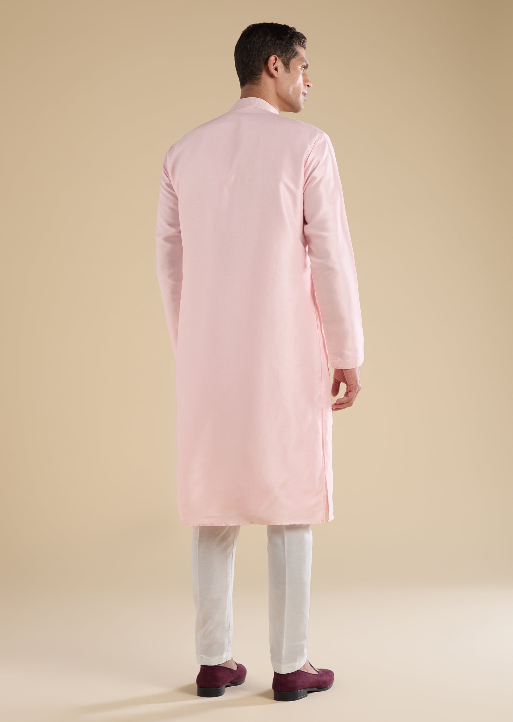 Softly festive with graceful detailing, this pink kurta set is crafted in smooth art silk for a refined traditional look. Designed with a mandarin collar, full sleeves, and side slits,... More Product Details