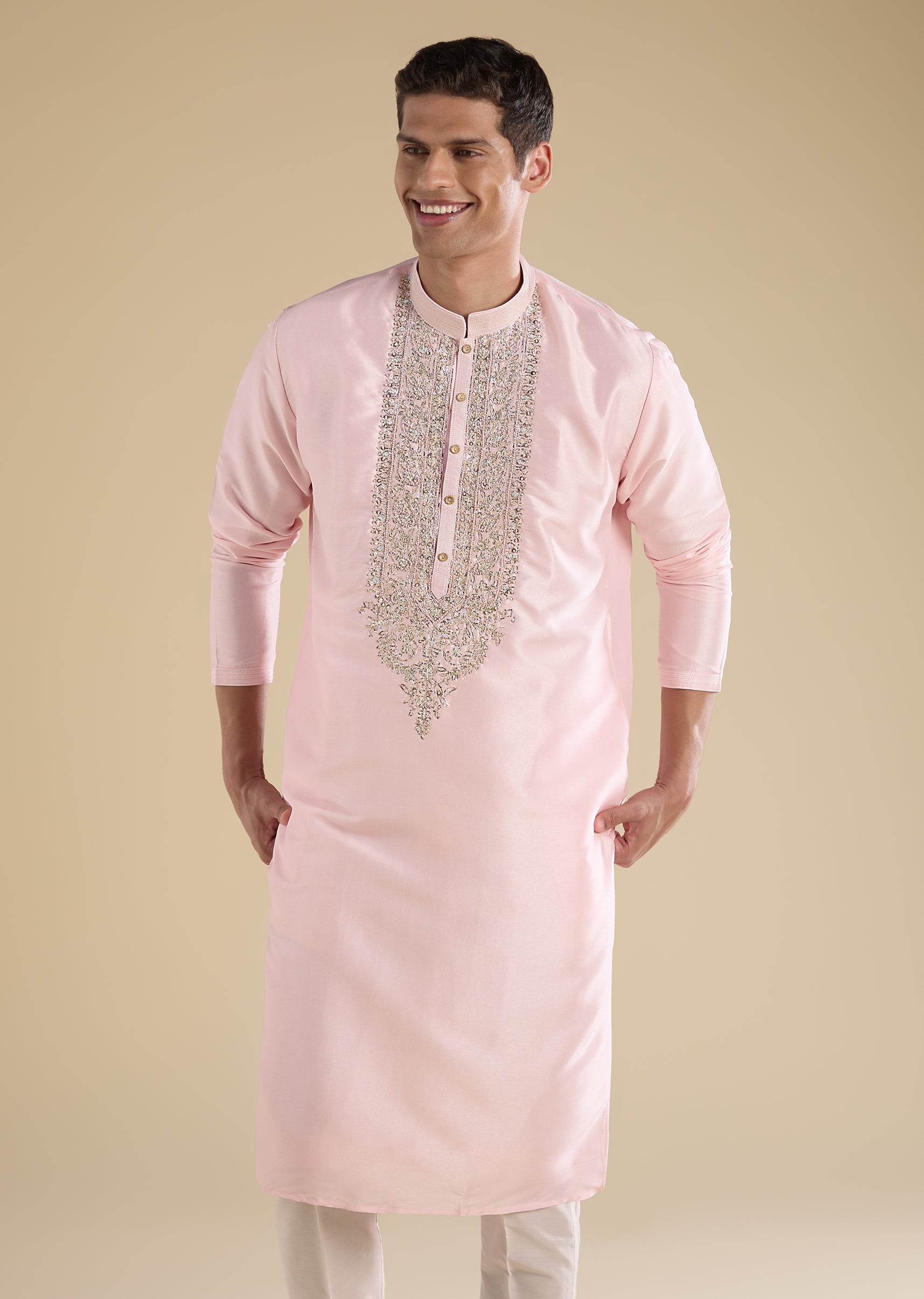 Softly festive with graceful detailing, this pink kurta set is crafted in smooth art silk for a refined traditional look. Designed with a mandarin collar, full sleeves, and side slits, it is highlighted with resham thread, sequin, and zari embroidery for subtle festive shimmer. Finished with straight-fit trousers and a partially elasticated waist, it’s ideal for pooja ceremonies and festive occasions. Awarded as the Most Trusted Brand, we're delivering styles you love, just as promised.
