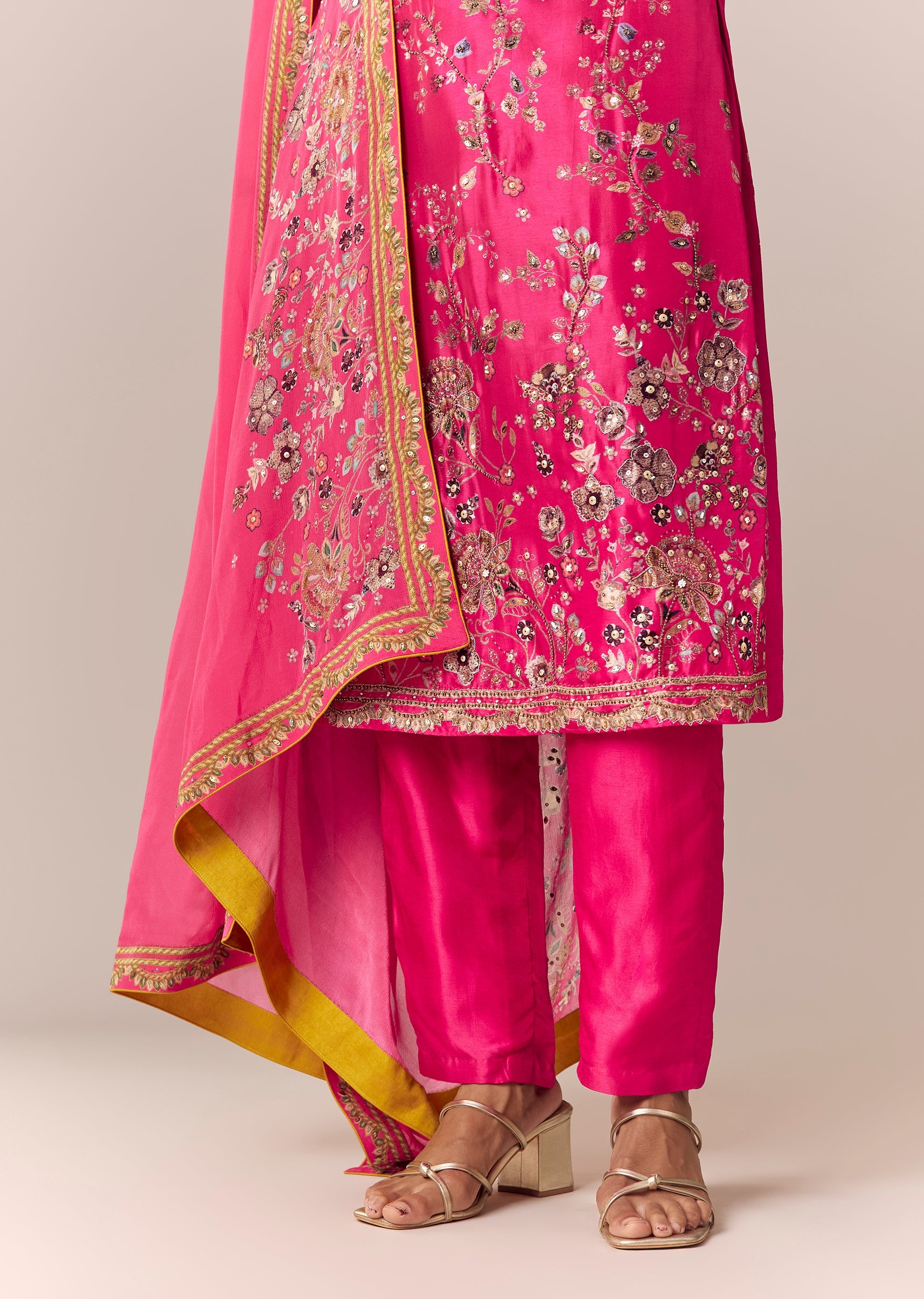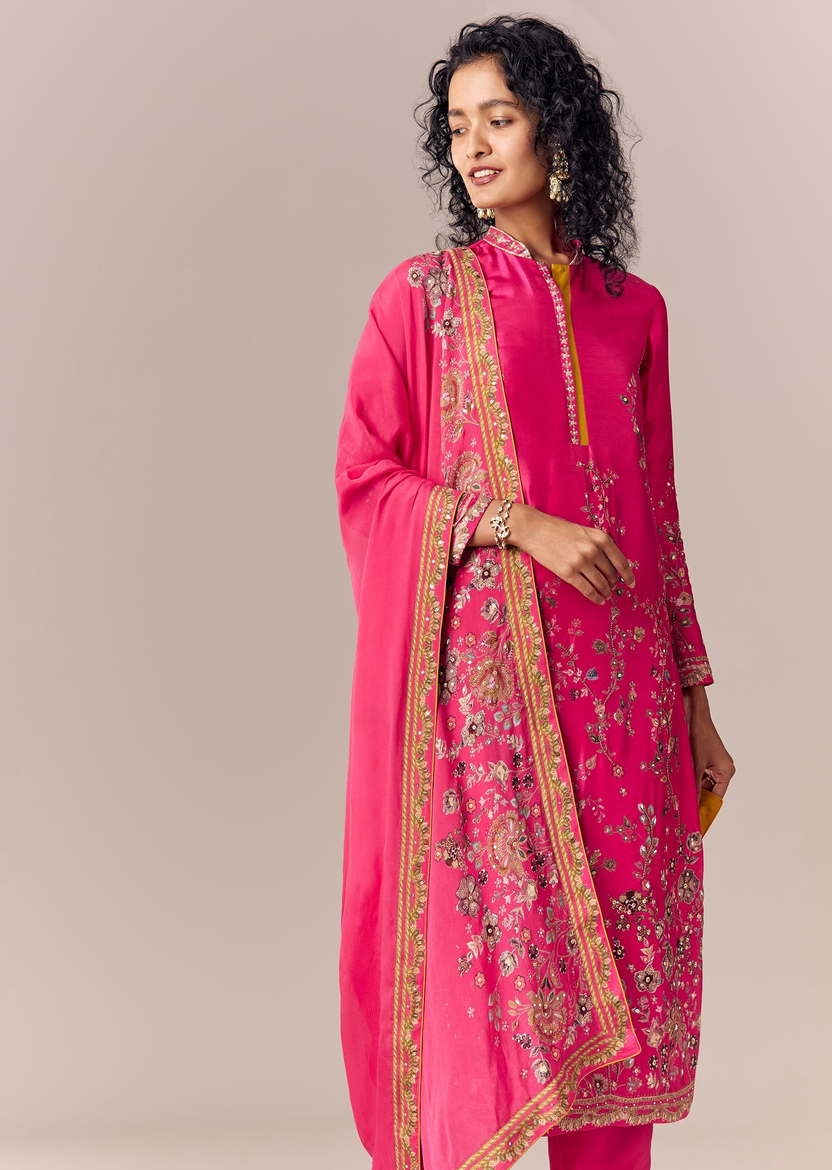 Pink Floral Printed Kurta Pant Set With Dupatta