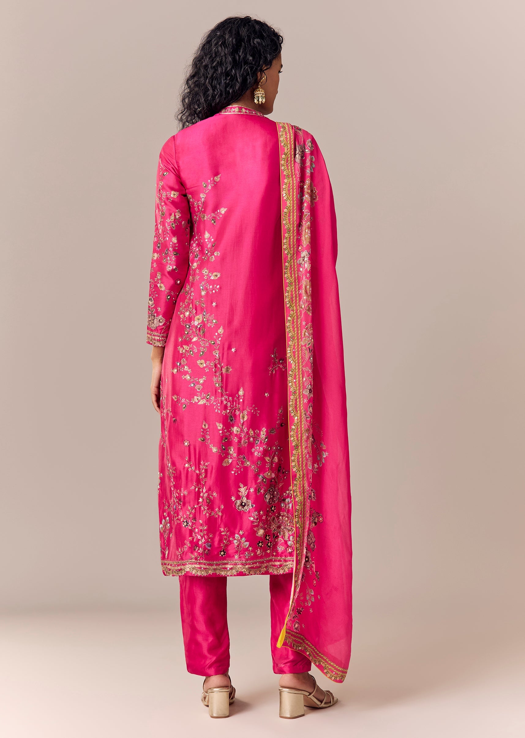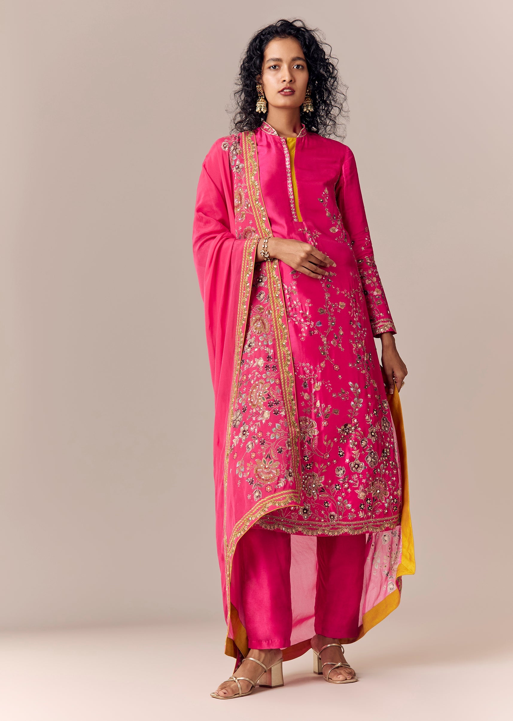 A Pakistani-style straight kurta set in a vibrant pink floral print, highlighted with beads and sequin embroidery. Finished with full sleeves, mandarin collar, side slits and a side zip closure.... More Product Details