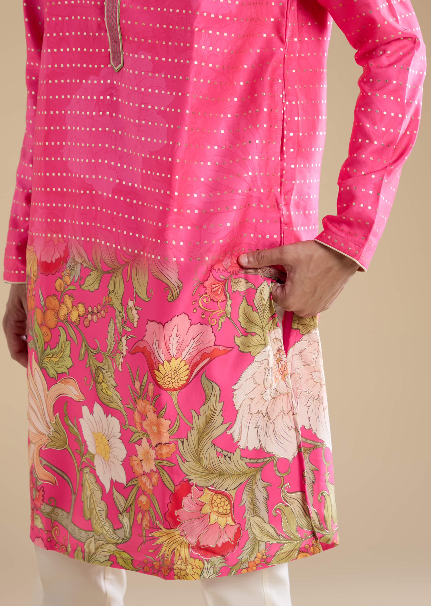 Pink Floral Work Mens Kurta and Pant Set