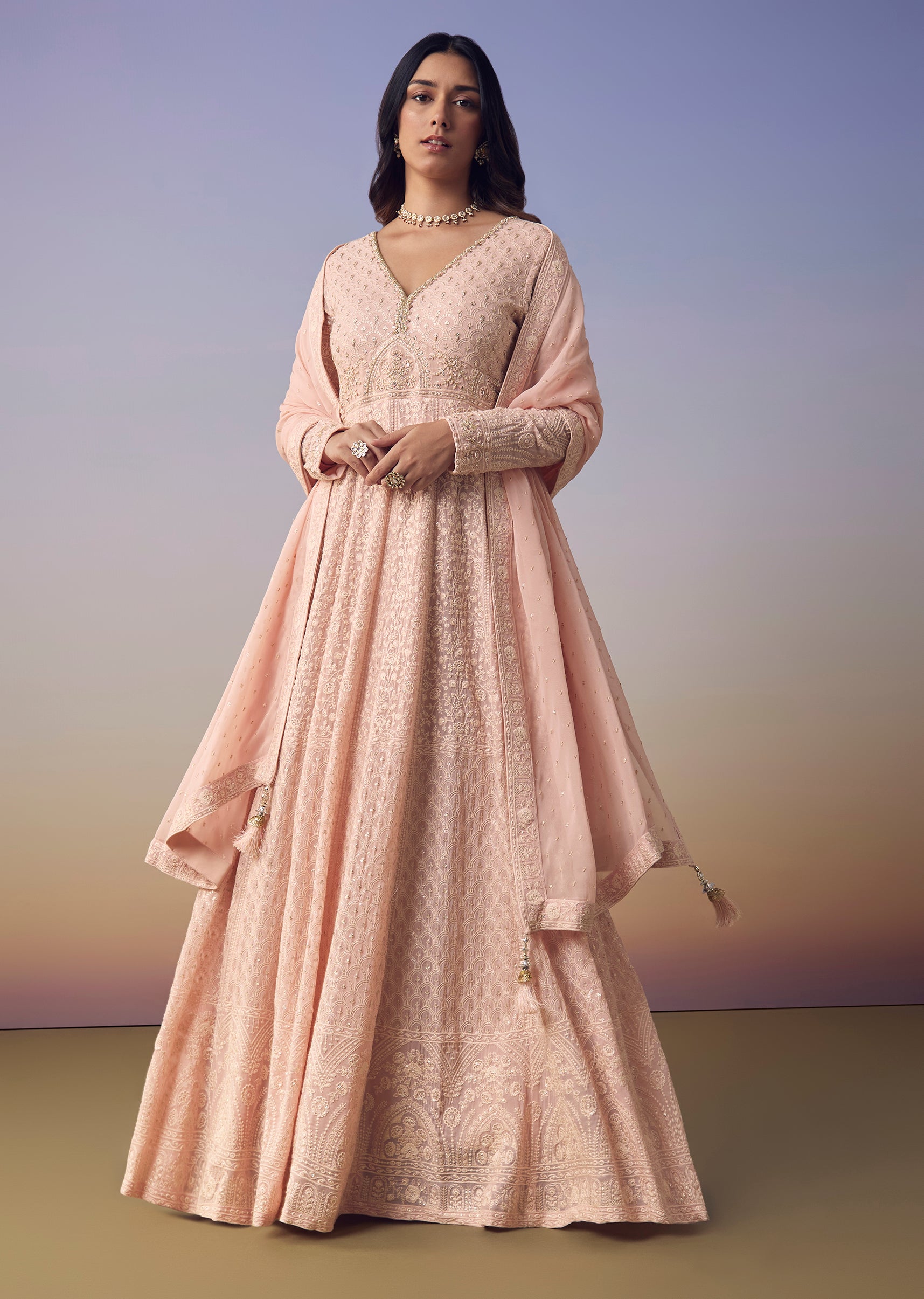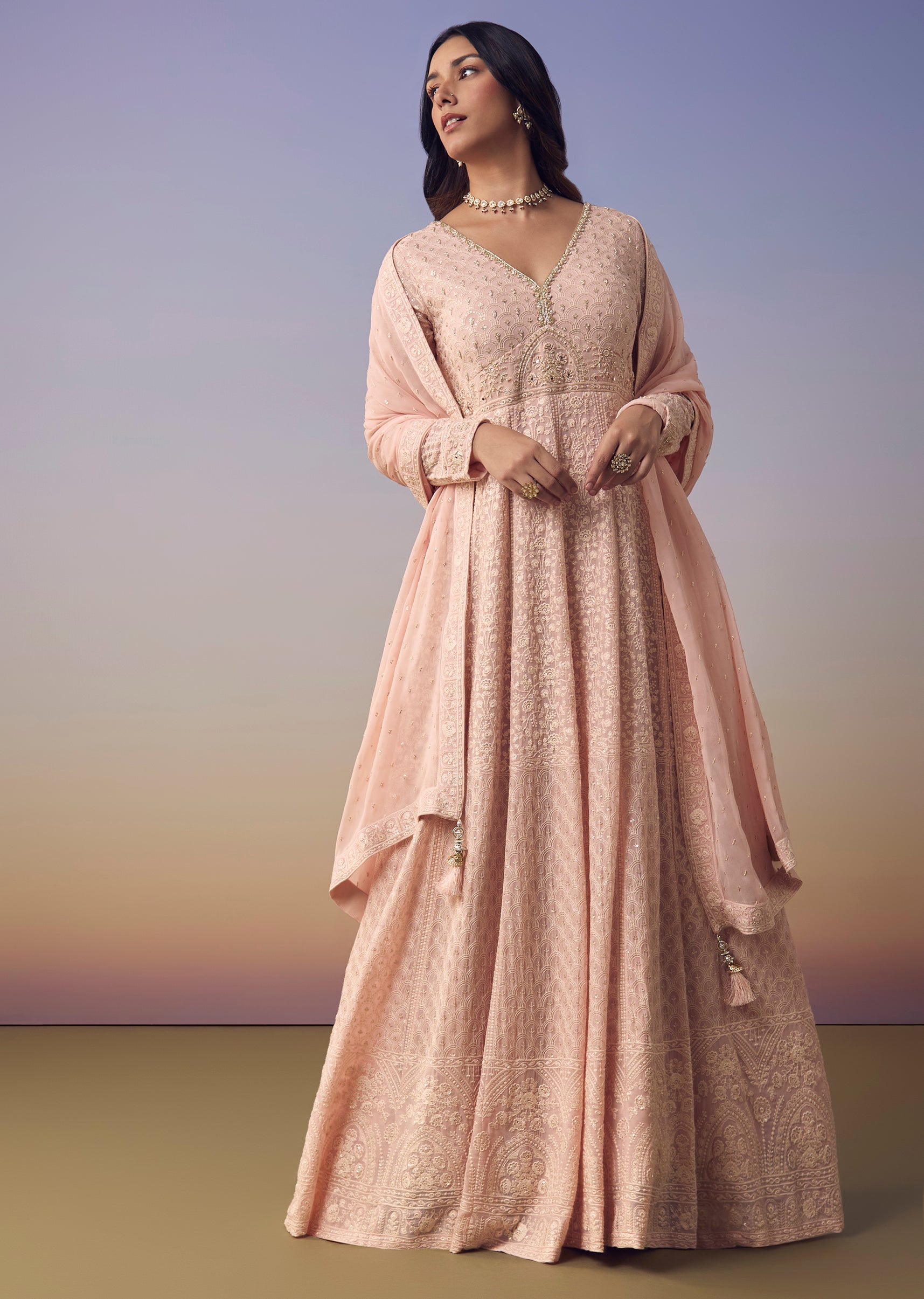 Step into feminine charm with this pink floor length anarkali crafted in airy georgette and embellished with shimmering sequins and delicate lucknowi work that add a radiant festive touch.... More Product Details