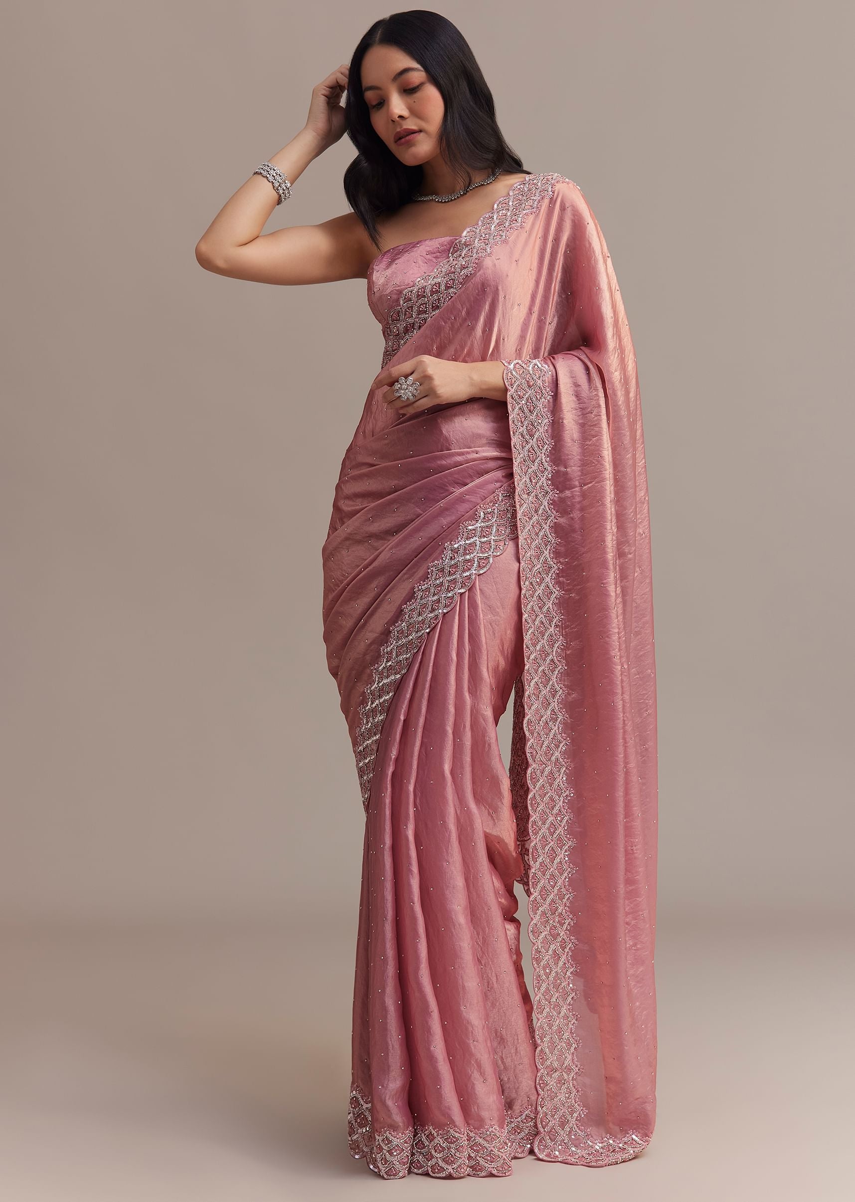 Pink Glass Tissue Saree With Sequins And Moti Embroidered Border