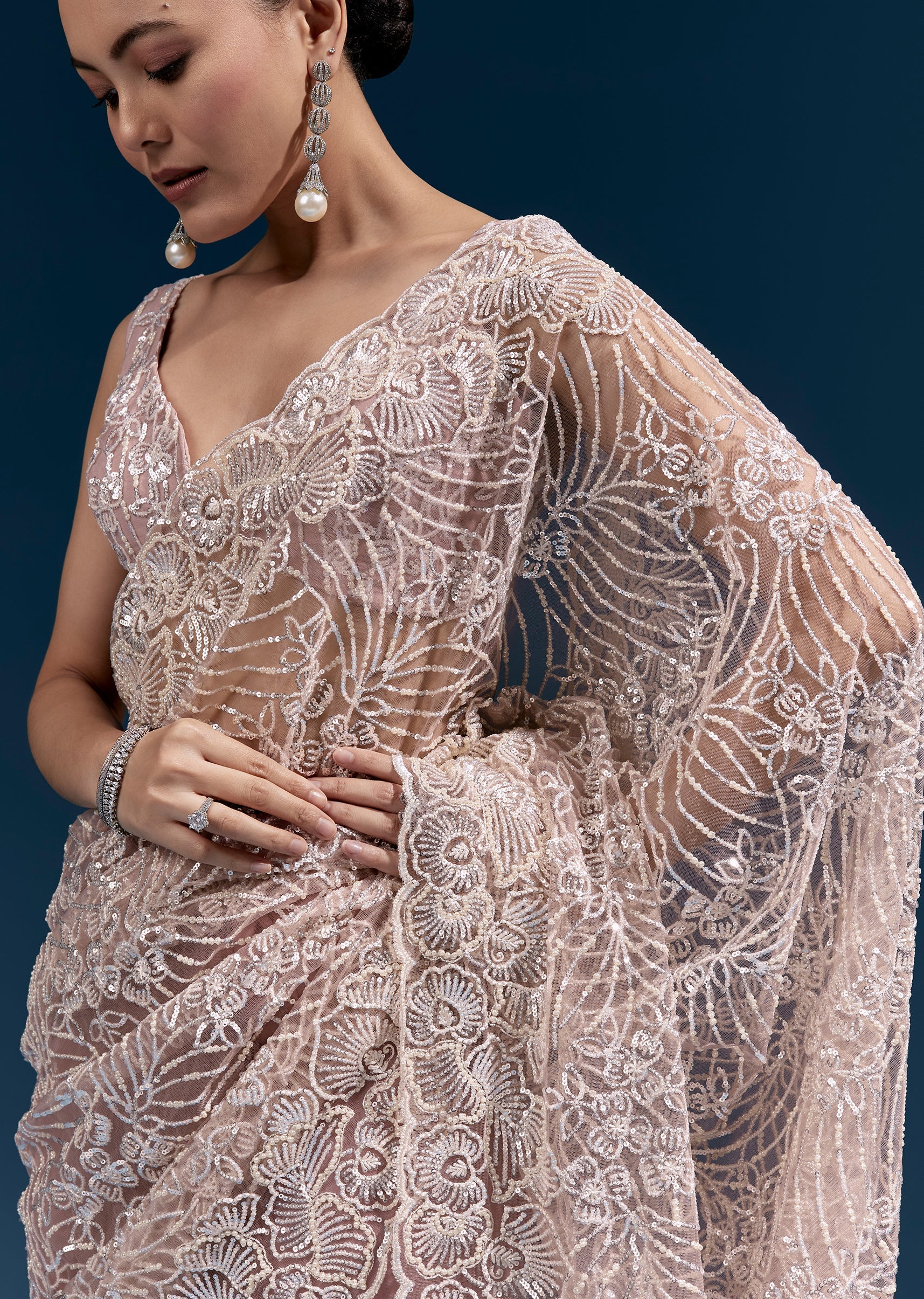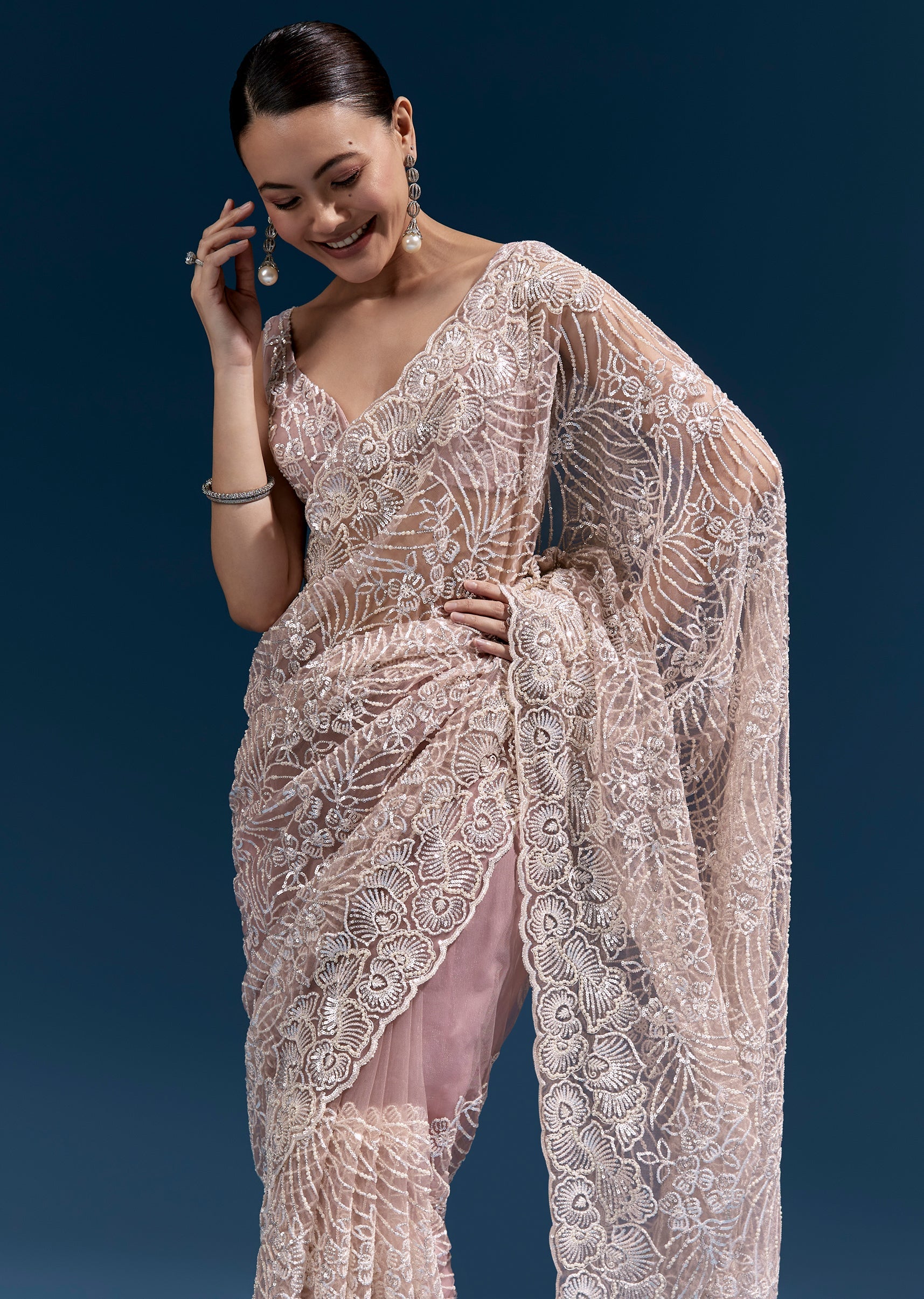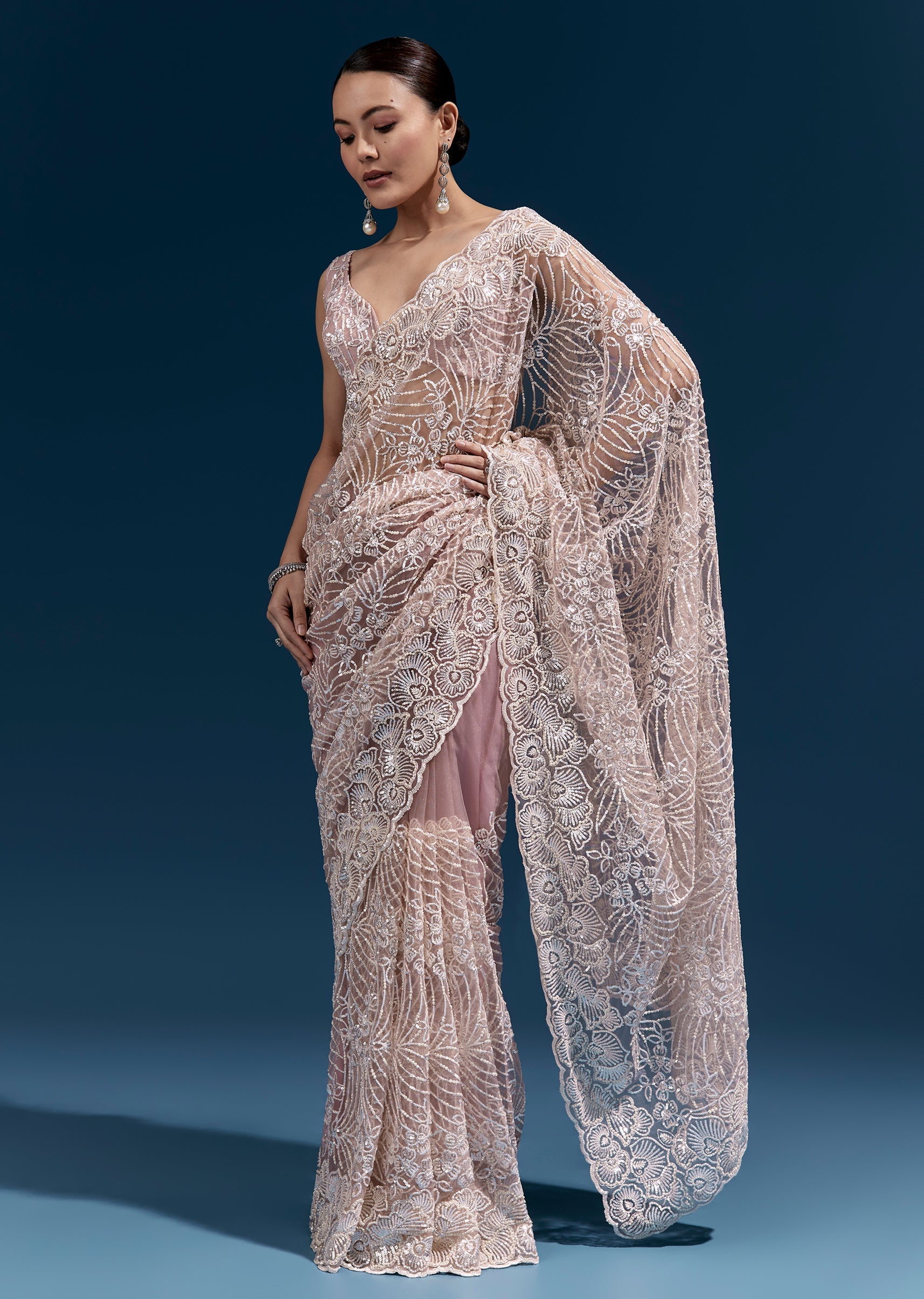 A pink heavy embroidered net saree featuring floral jaal work all over with cutdana, sequins and beads. Finished with cutwork detailing on the border and paired with heavy embroidered blouse... More Product Details