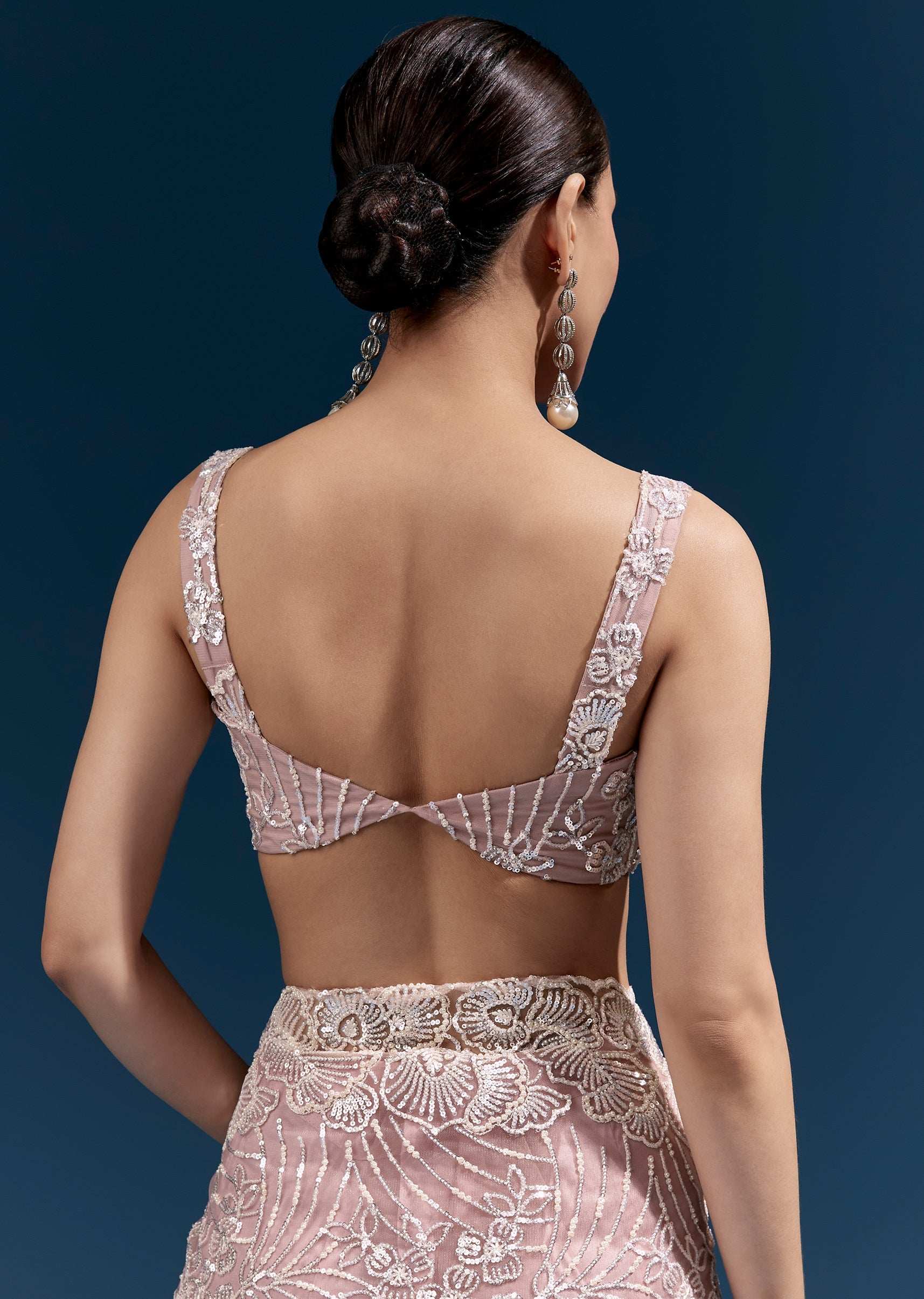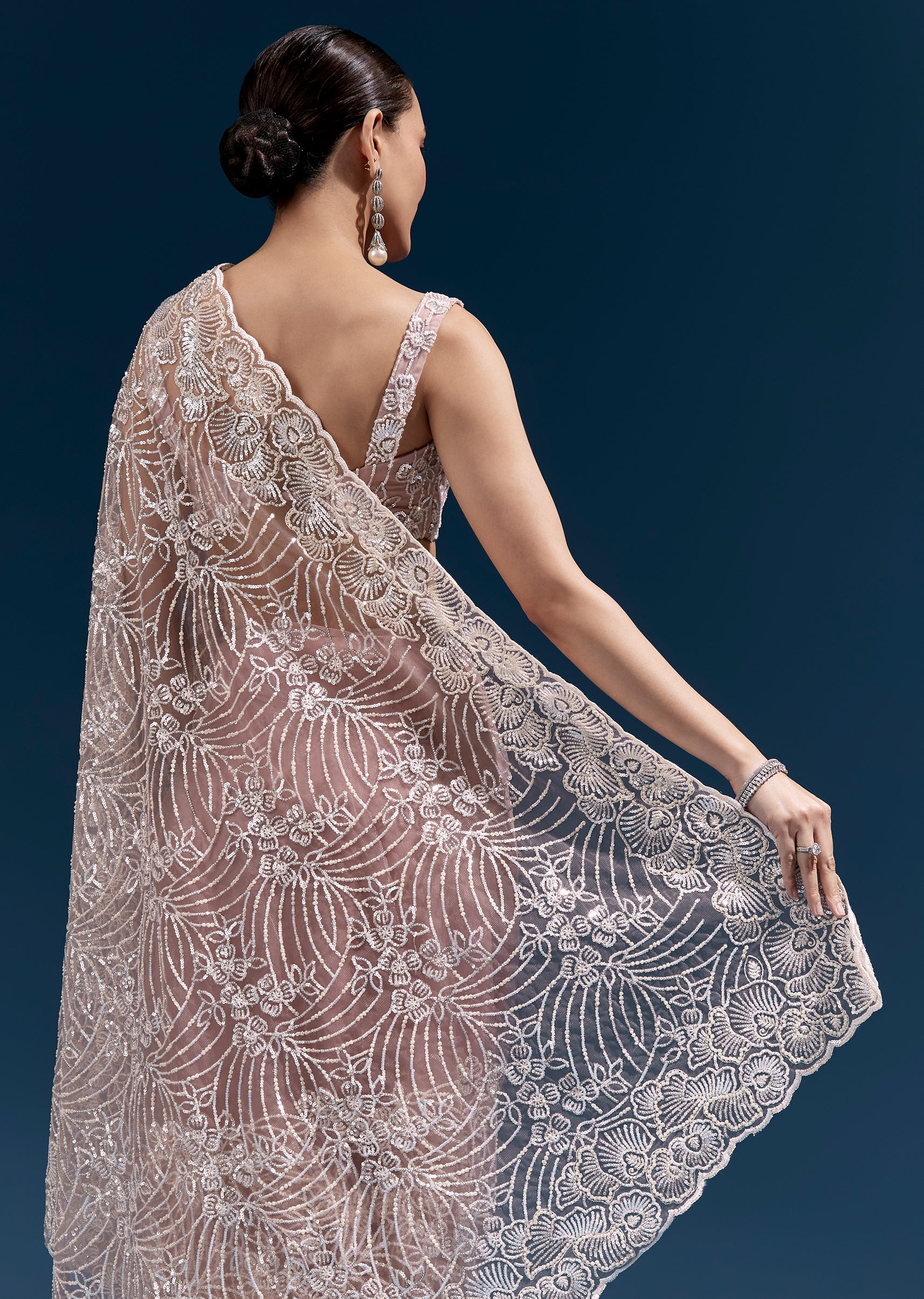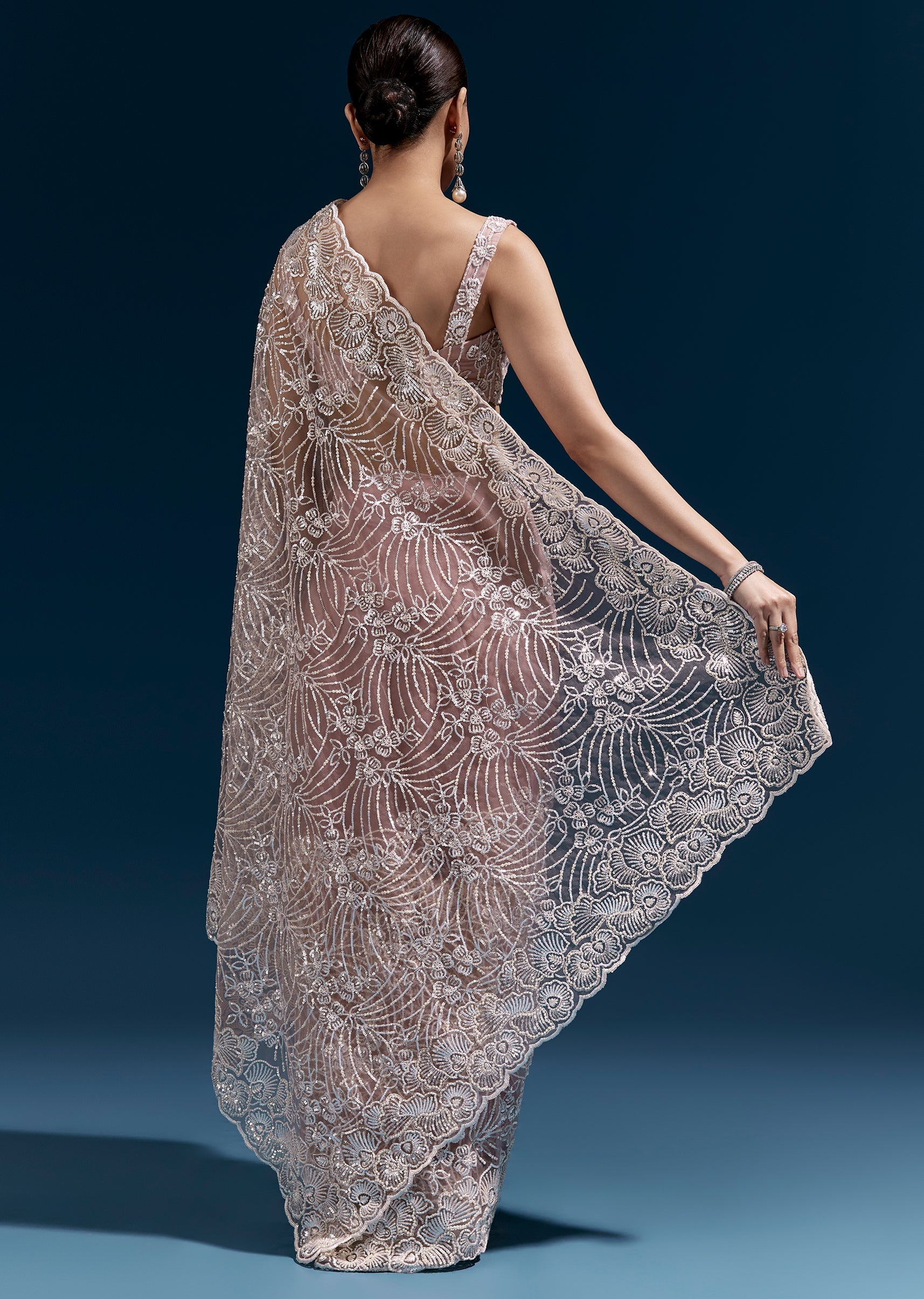 A pink heavy embroidered net saree featuring floral jaal work all over with cutdana, sequins and beads. Finished with cutwork detailing on the border and paired with heavy embroidered blouse... More Product Details