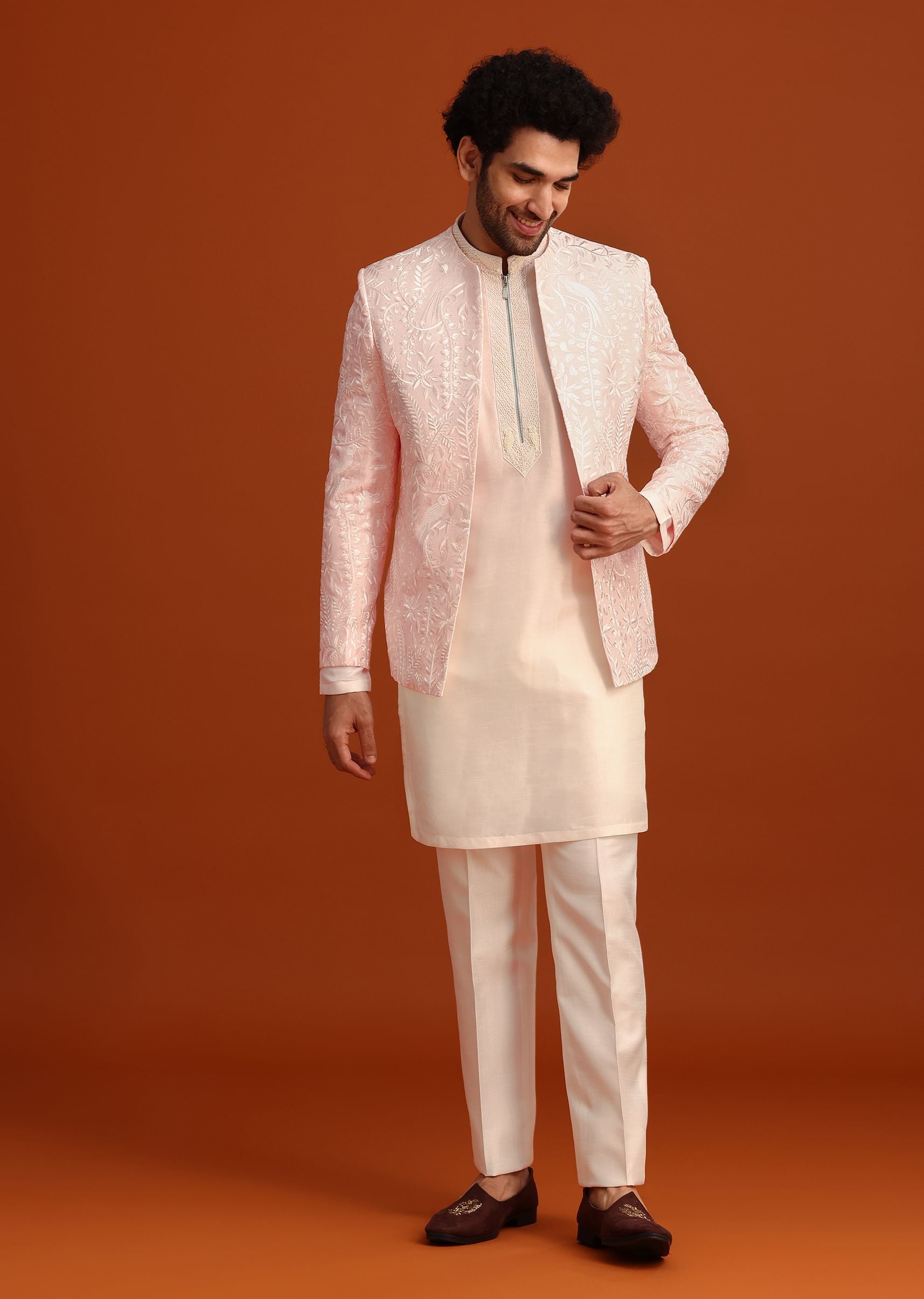 Pink Indo-Western Jacket And Kurta Set In Silk With French Knots