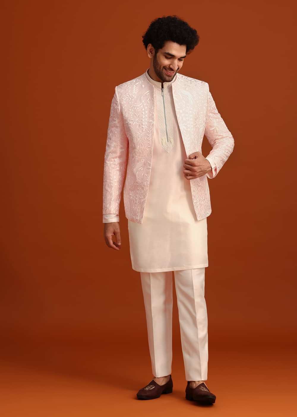 - Exude timeless elegance by donning this indowestern jacket set that displays masterful craftsmanship.
