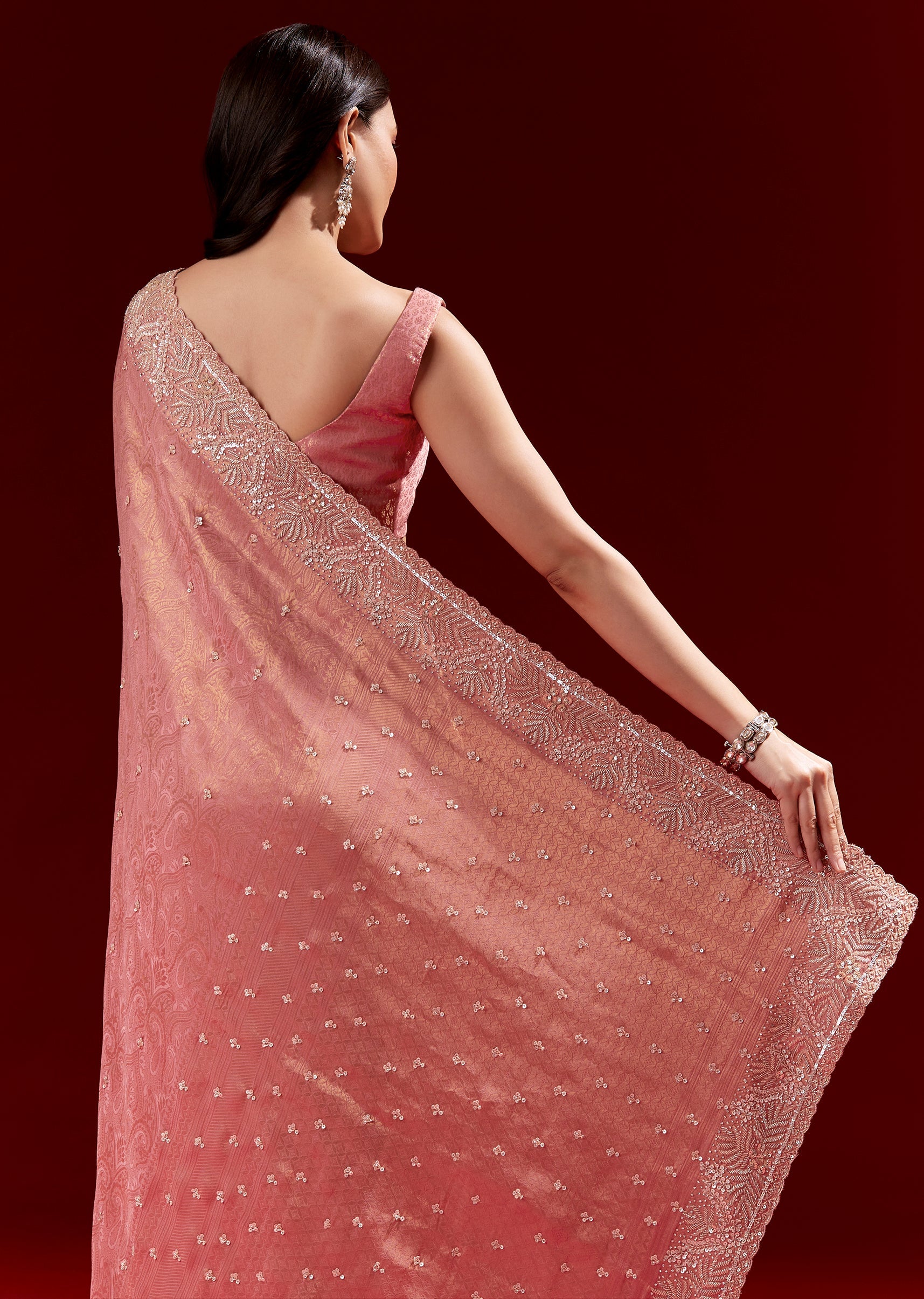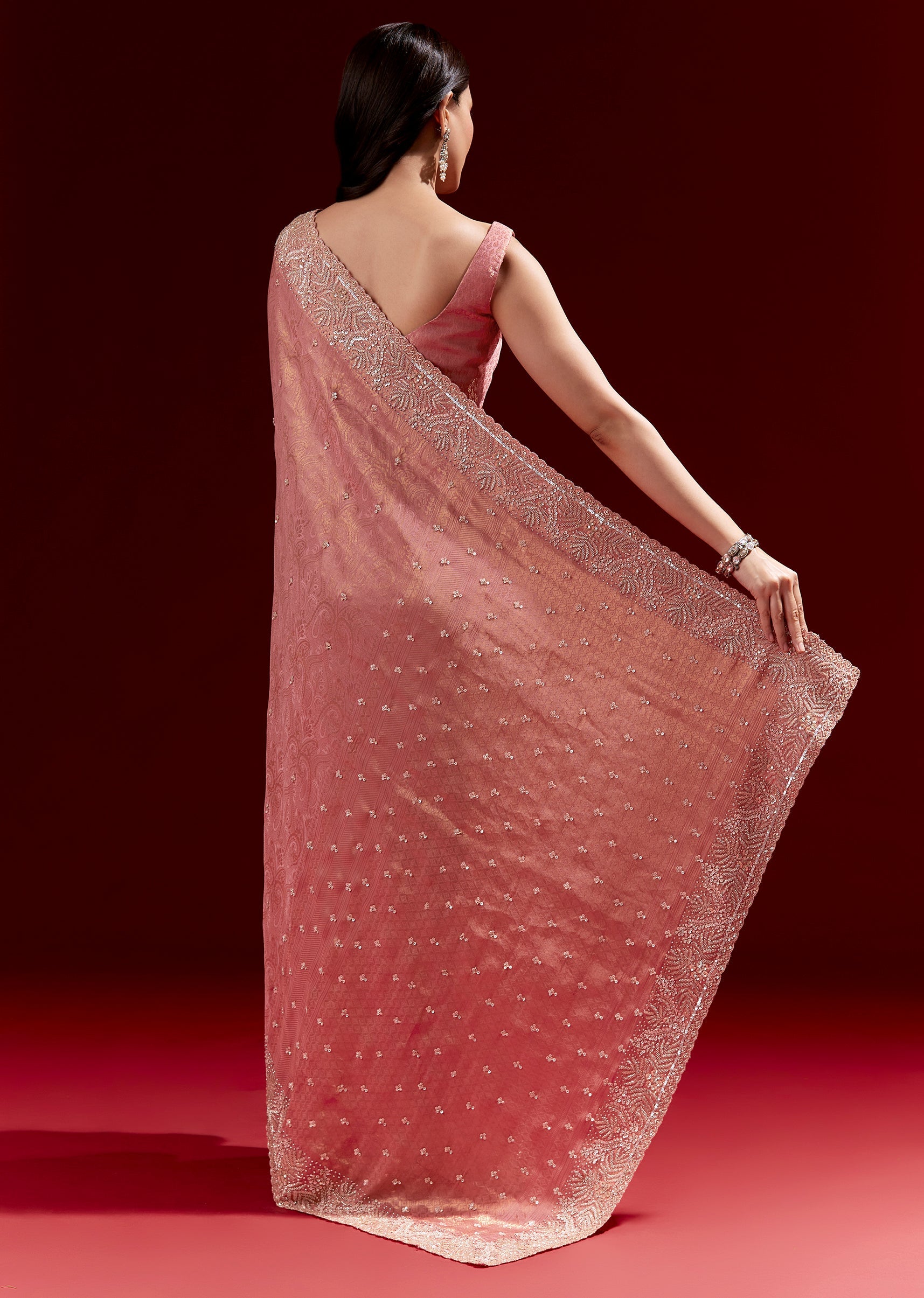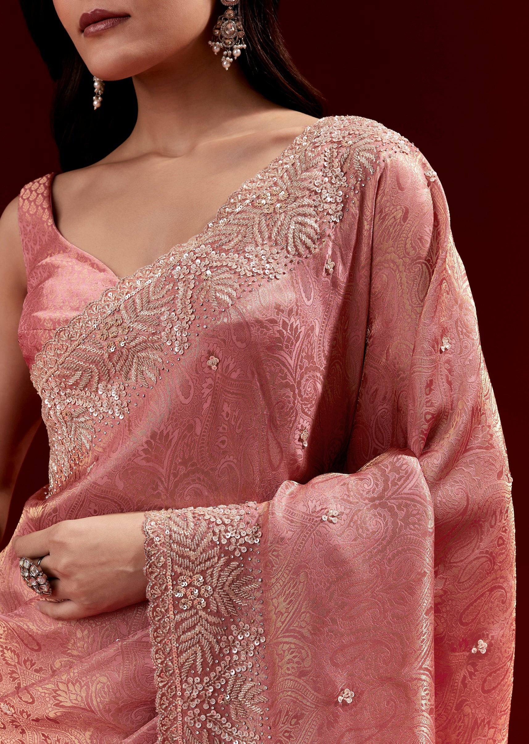 This pink jacquard soft silk saree features a heavy embroidered border and small butti detailing in cutdana, sequins and beads. Comes with brocade blouse fabric, making it a complete festive look—perfect for engagements, mehendi and wedding celebrations.