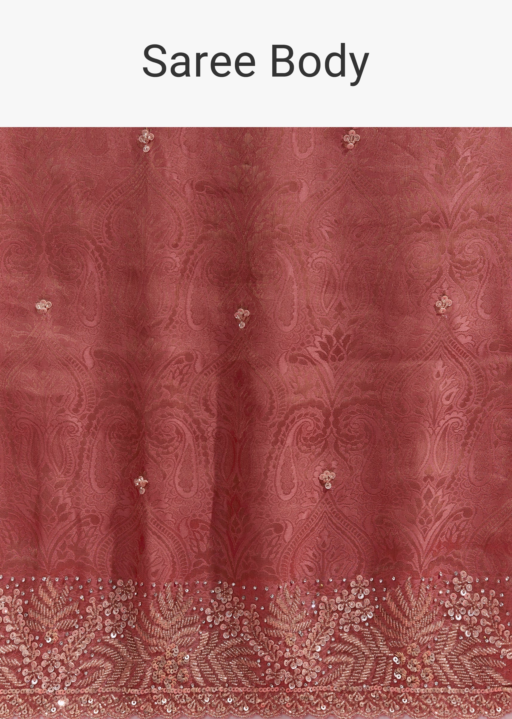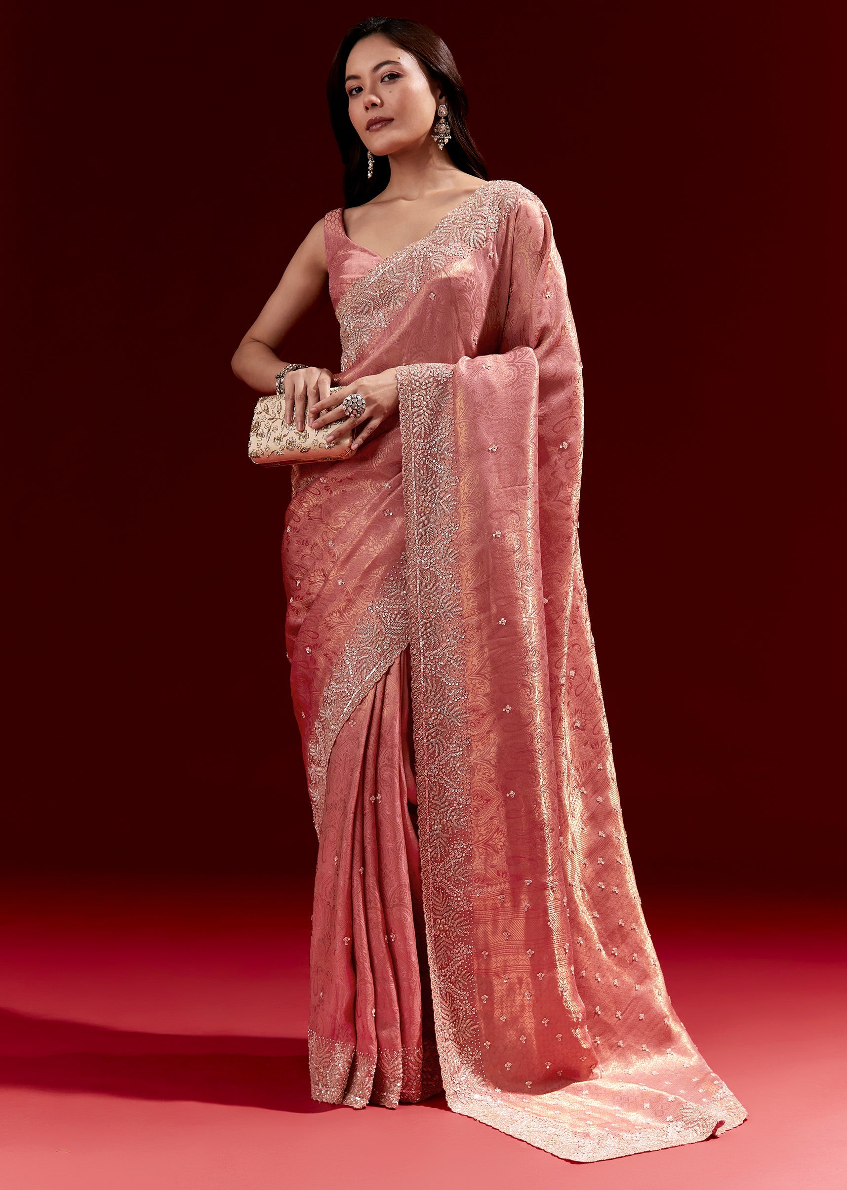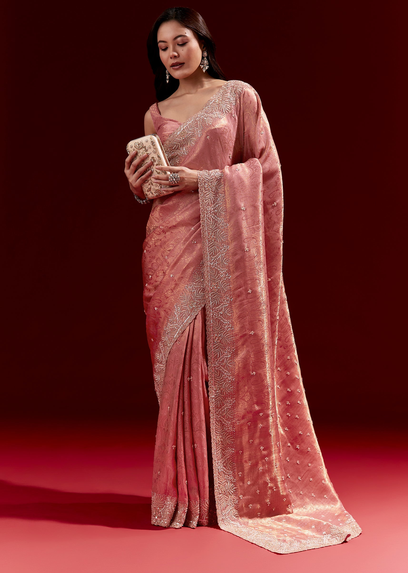 This pink jacquard soft silk saree features a heavy embroidered border and small butti detailing in cutdana, sequins and beads. Comes with brocade blouse fabric, making it a complete festive look—perfect for engagements, mehendi and wedding celebrations.