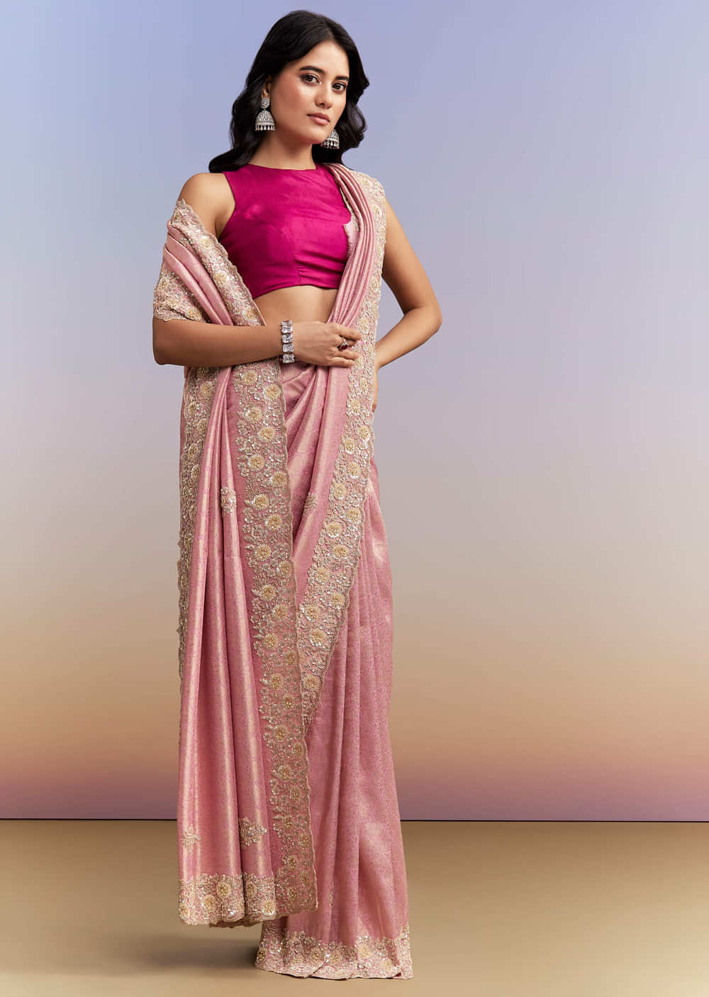 Pink Jacquard Tissue Saree With Heavy Hand Embroidery