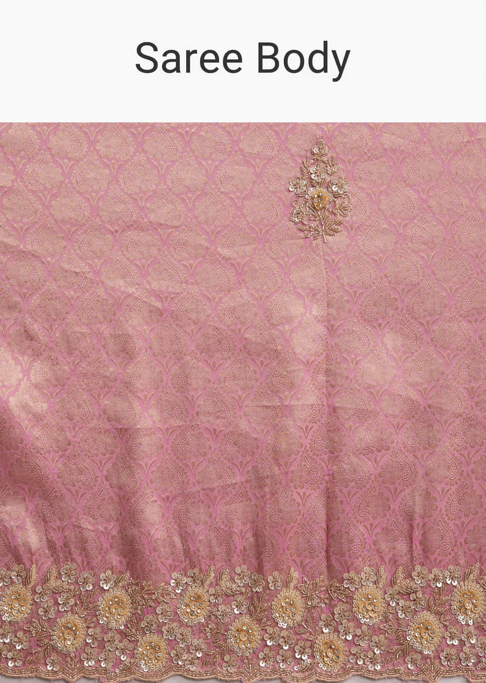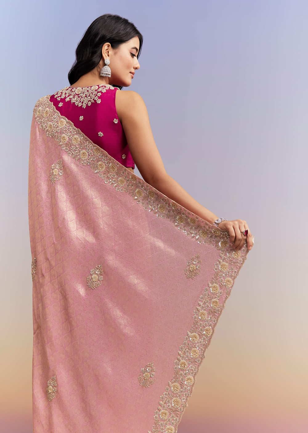 For heirloom appeal with a fresh hue, this pink jacquard tissue saree adds texture that shows beautifully up close. A heavy floral embroidered cut-work border frames all-over buttis in cutdana,... More Product Details