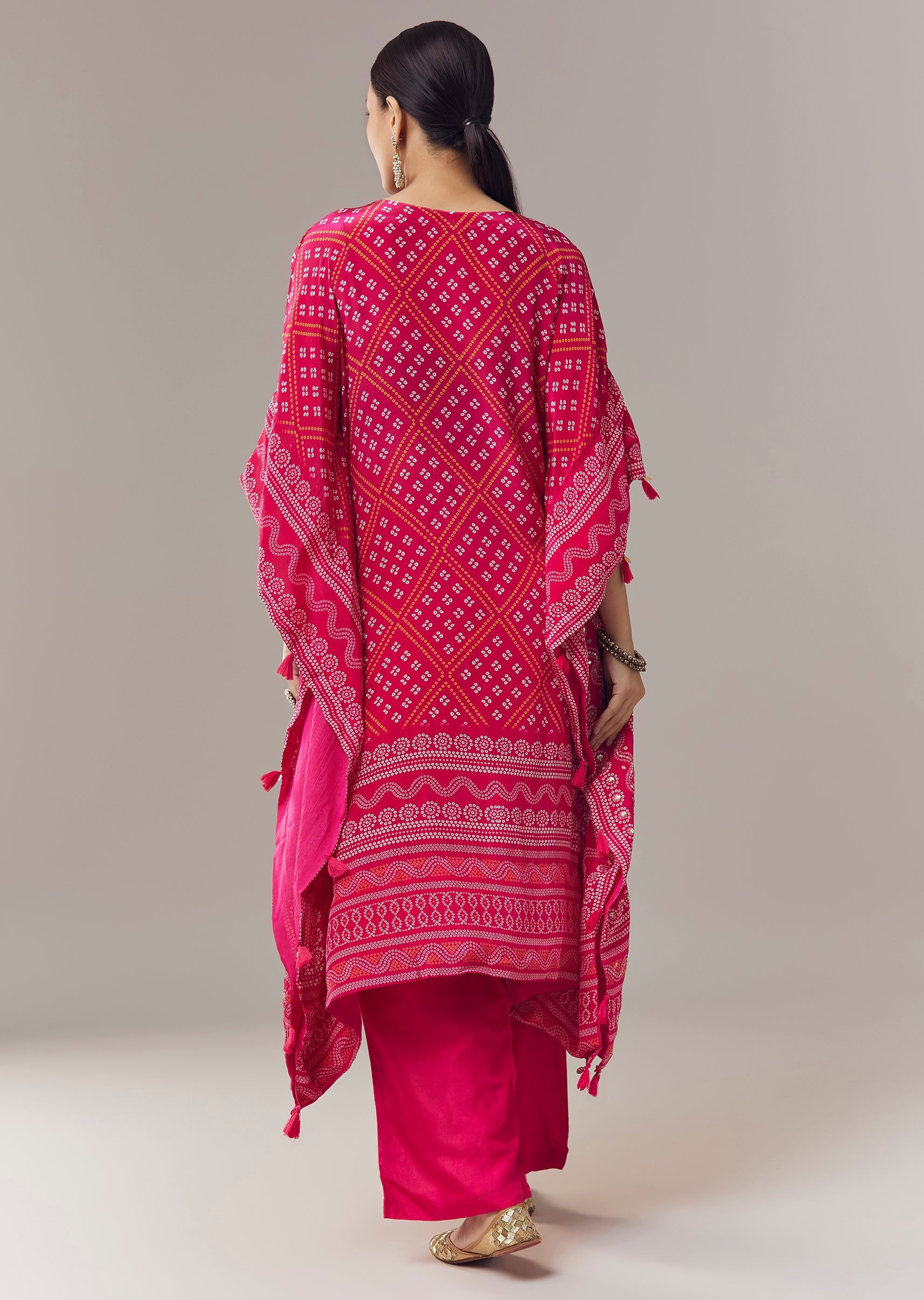 Chic and festive, this pink kaftan kurti is crafted in a soft crepe cotton silk blend for a comfortable and elegant feel. The asymmetric silhouette is highlighted with vibrant bandhani prints and delicate gotta work, adding subtle texture and festive charm. Featuring flared sleeves and a keyhole neckline, it creates a graceful ensemble perfect for daytime celebrations and casual festive occasions. Awarded as the Most Trusted Brand, we're delivering styles you love, just as promised.