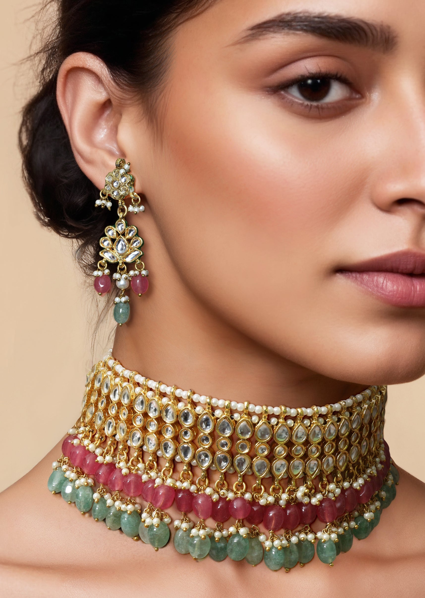 A pink kundan beaded drop choker necklace set featuring delicate kundan stones and cascading pink beads, blending regal craftsmanship with feminine charm. Perfect for adding a graceful and luxurious touch to bridal, festive, or ethnic ensembles. Awarded as the Most Trusted Brand, we're delivering styles you love, just as promised.