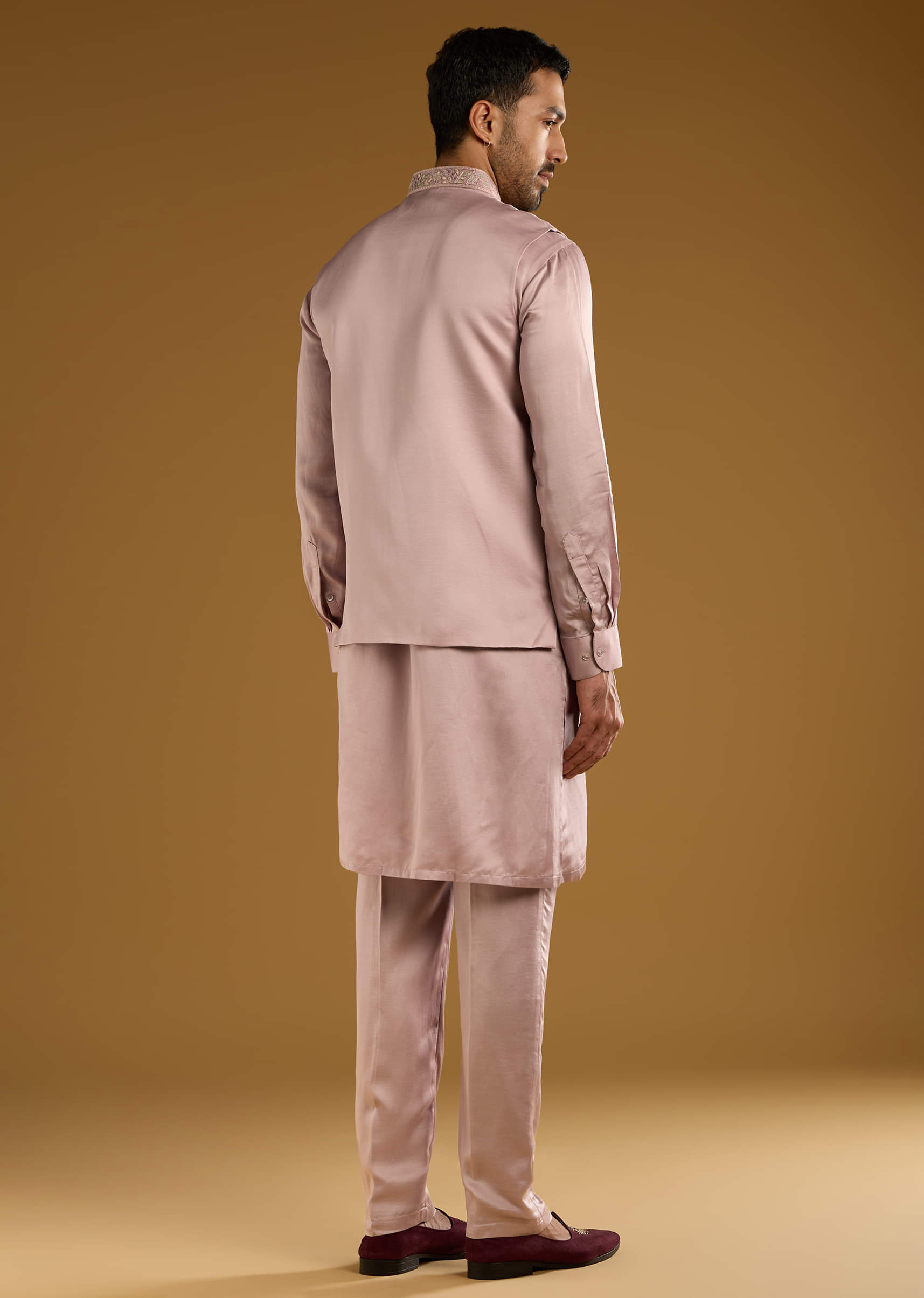 Soft colour meets craft in this pink men’s kurta jacket set in linen blend, where fine resham threadwork outlines the jacket for a neat, tailored finish. The palette stays elegant... More Product Details