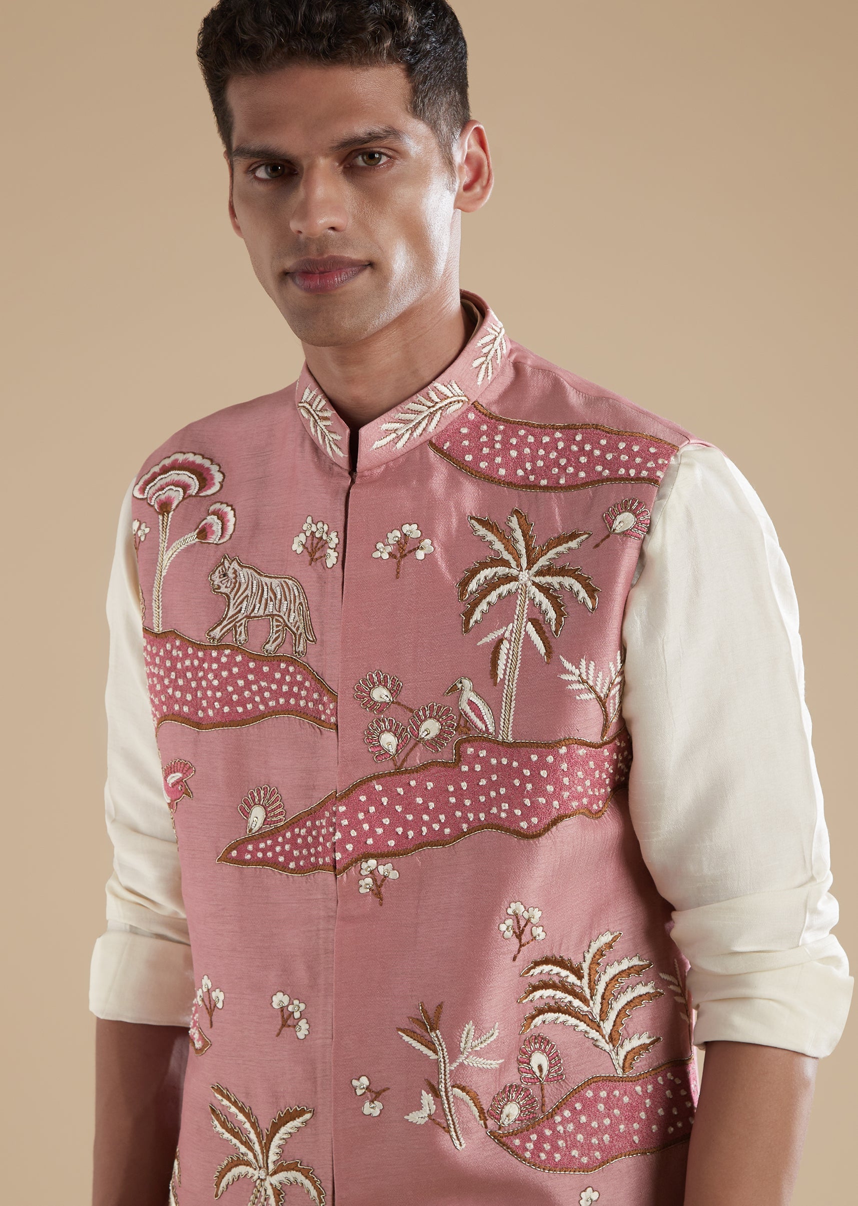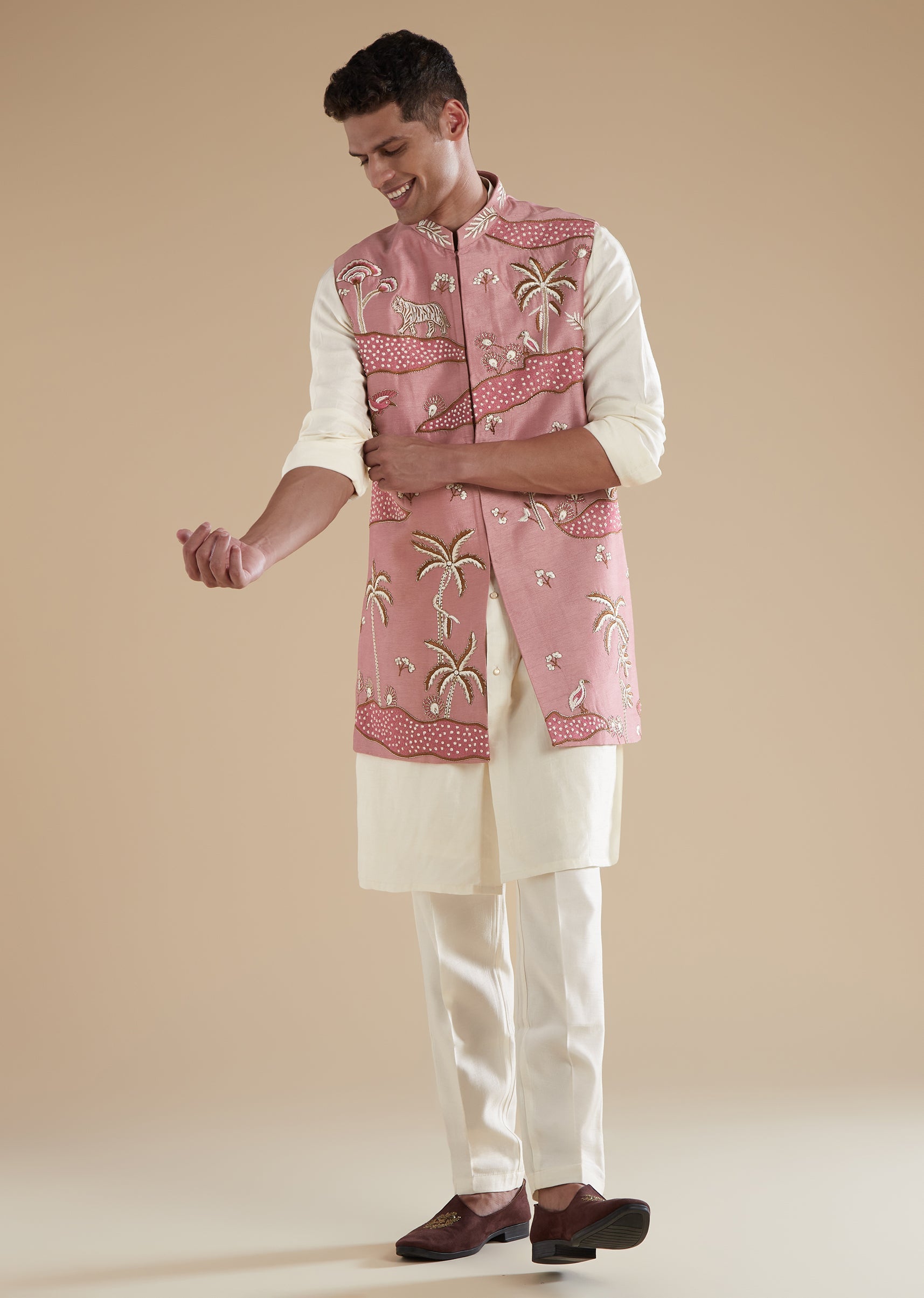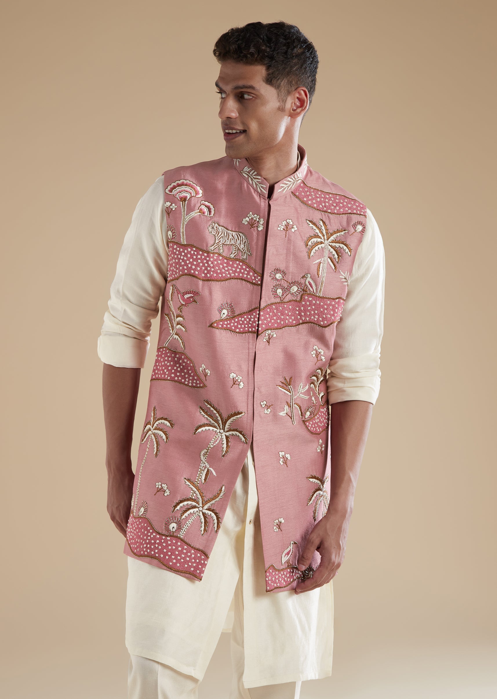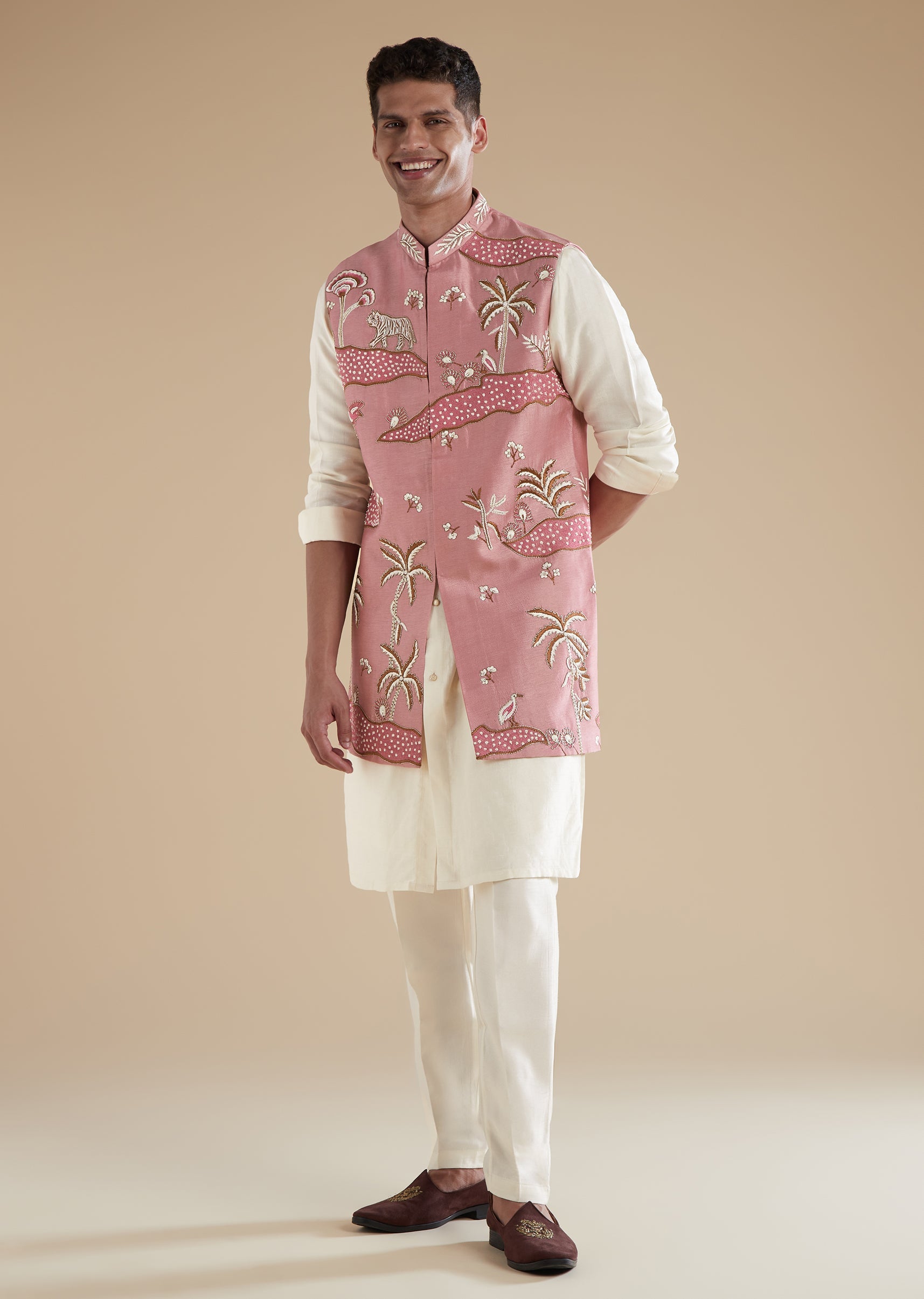 A refined pastel pink kurta jacket set crafted in silk as the primary fabric, designed for mehendi and reception looks for groomsmen and the groom’s brother. The ensemble features intricate thread, resham, French knot, moti, and cut dana detailing that adds depth and artisanal richness. The kurta and jacket are tailored with a mandarin collar, full sleeves, and front button closures on both the top and bottom, bringing together elegance and festive charm. The matching trousers complete the coordinated, polished silhouette. Awarded as the Most Trusted Brand, we're delivering styles you love, just as promised.