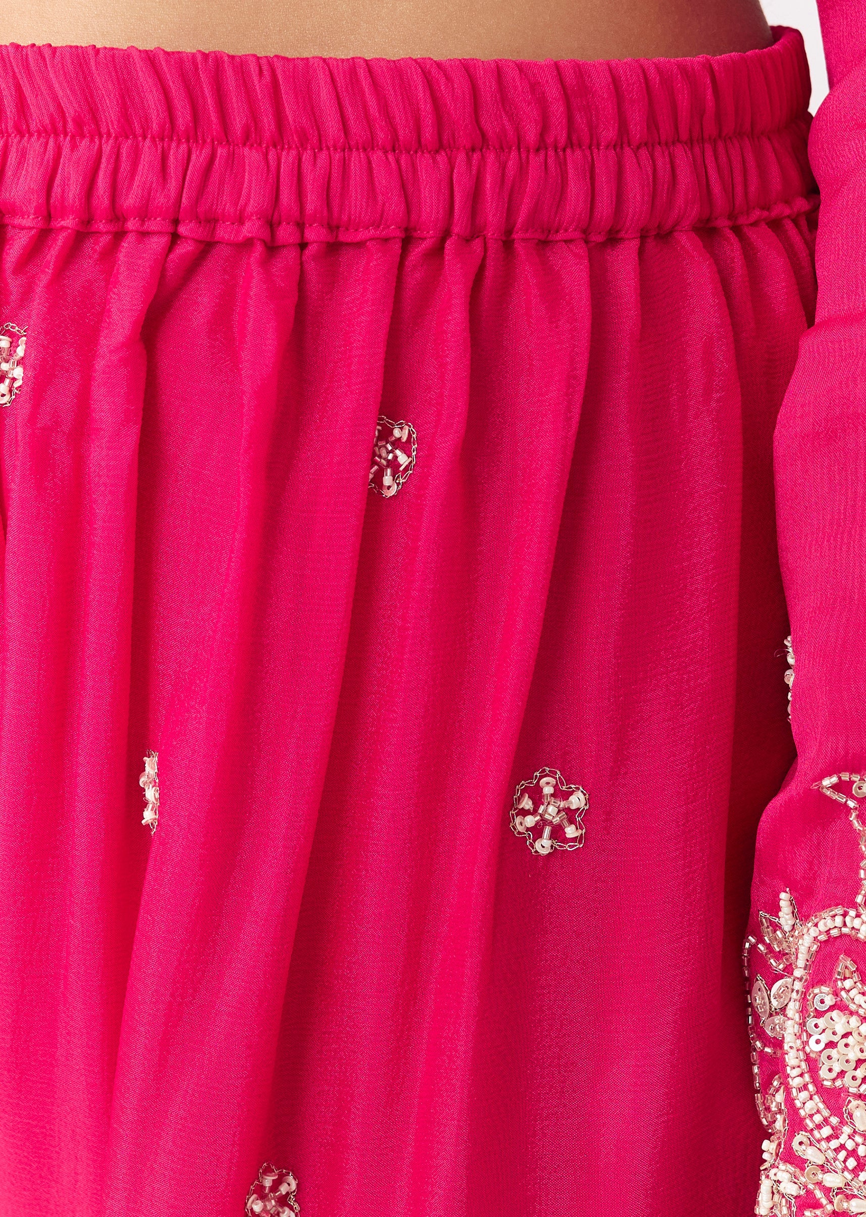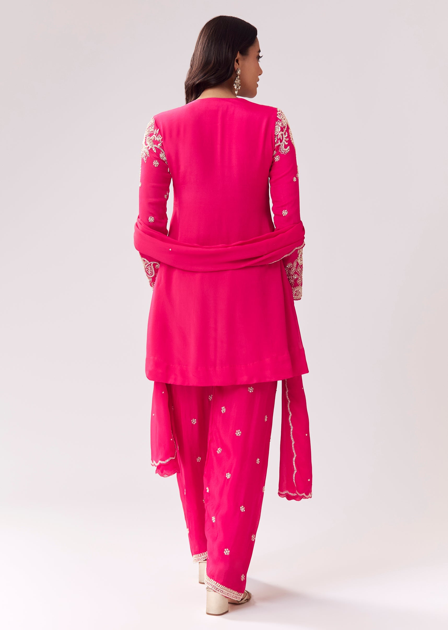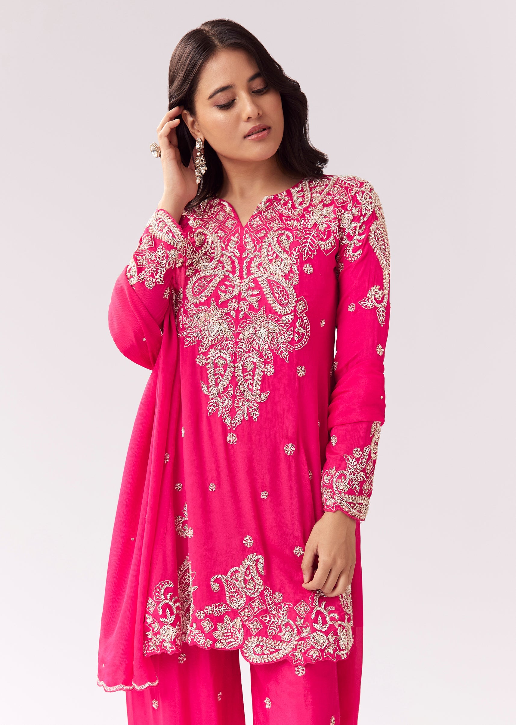 This kurta set is designed with a straight silhouette that’s easy to wear and flattering. The chinon kurta features moti and cut-dana work, adding festive sparkle suitable for sangeet, mehendi,... More Product Details