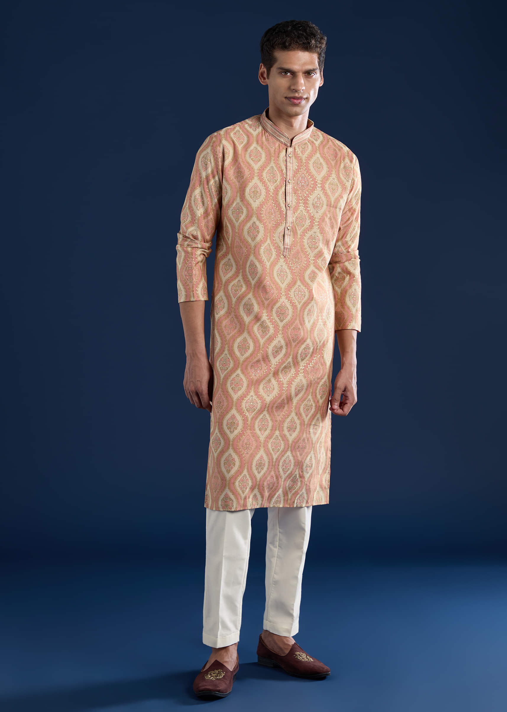 Soft, elegant, and effortlessly graceful — this pink silk printed kurta set brings together modern charm and traditional finesse. The lustrous silk fabric enhances the delicate print, creating a subtle interplay of texture and sheen. Lightweight yet luxurious, this ensemble is perfect for daytime celebrations, and festive gatherings. Awarded as the Most Trusted Brand, we're delivering styles you love, just as promised.