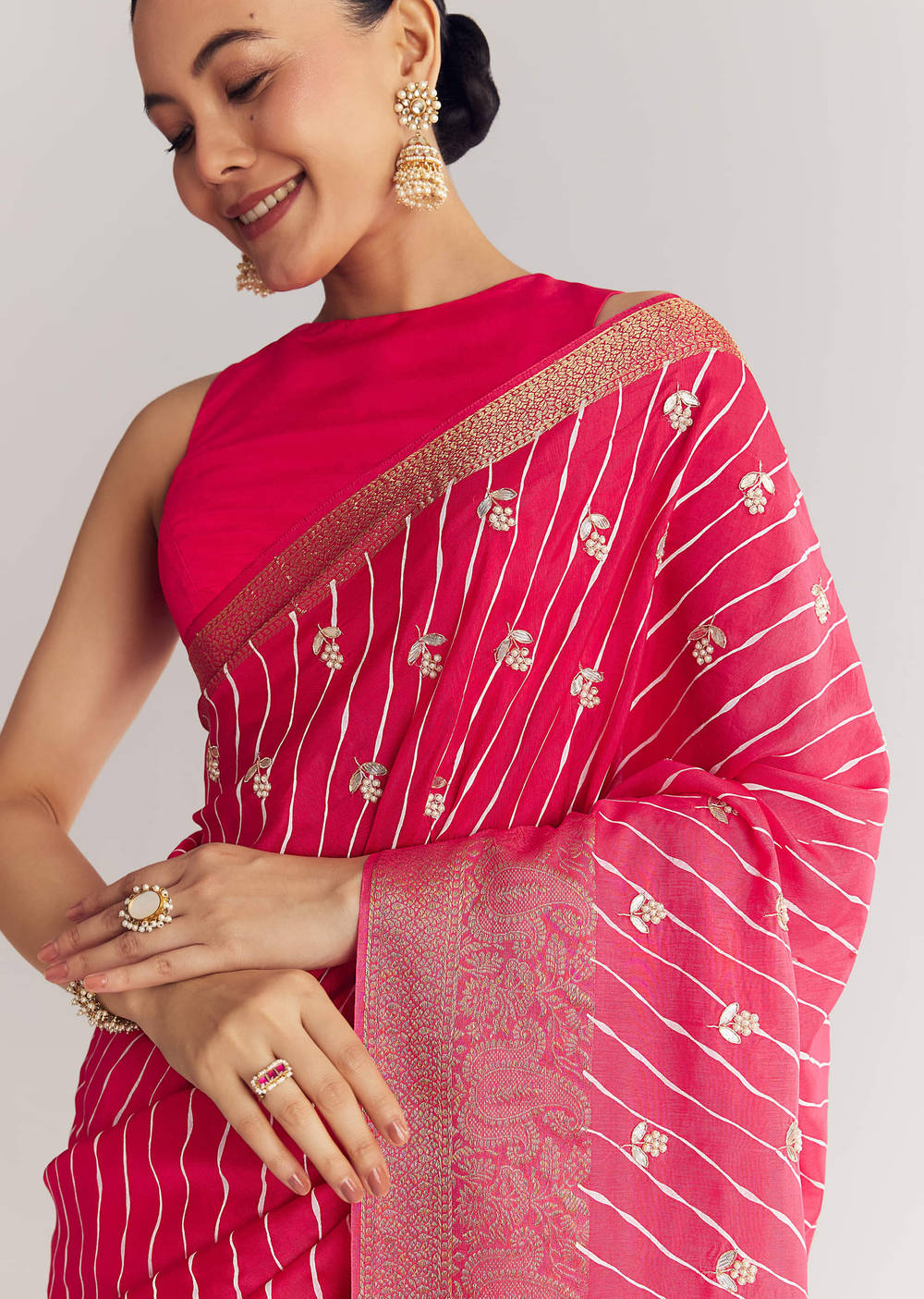 Exude timeless charm in this lehariya printed & floral embroidered with gota patti & moti. A graceful choice for Diwali or Durga Puja celebrations. A rhythmic dance of texture and tone unfurls in every fold. Step into the spotlight wrapped in artisanal brilliance. Awarded as the Most Trusted Brand, we're delivering styles you love, just as promised.