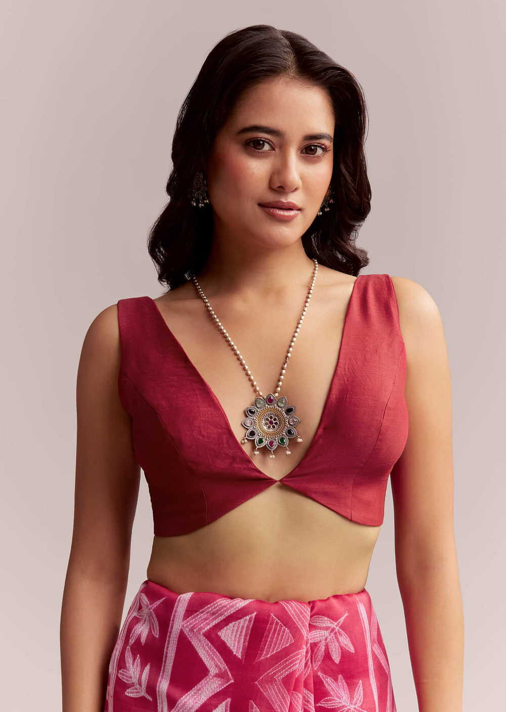There is something quietly striking about this pink linen saree with hand-dyed Shibori and leafy block prints. Framed with a copper gold zari border, it draws from traditional techniques and... More Product Details